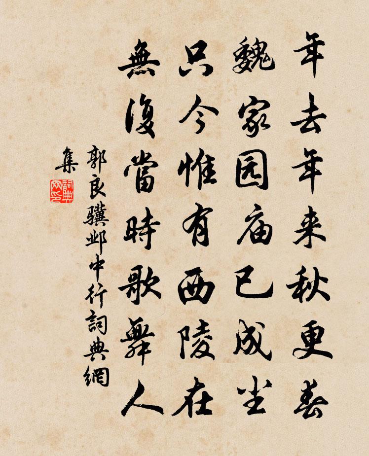 詩詞名句歷史字典書法欣賞書法字典國語詞典說文解字康熙字典古漢語字典標 題 作 者 詩 句 鄴中行作者:郭良驥 朝代:唐代鄴中行原文年去年來秋更春,魏家園廟已成塵。只今惟有西陵在,無復當時歌舞人。詩詞問答問:鄴中行的作者是誰?答:郭良驥問:鄴中行寫於哪個朝代?答:唐代問:鄴中行是什麼體裁?答:七絕郭良驥鄴中行書法欣賞鄴中行書法作品注釋全唐詩:卷505-10詩詞推薦鵁鶄陸龜蒙〔唐代〕詞賦曾夸鸀鳿流,果為名誤別滄洲。雖蒙靜置疏籠晚,不似閒棲折葦秋。自昔稻粱高鳥畏,至今珪組野人仇。防徽【正宮】六么令呂侍中〔元代〕華亭江上,煙淡淡草萋萋,浮光萬頃。長篙短棹一蓑衣,終日向船頭上穩坐,來往故人稀。綸竿收罷,輕拋香餌,生查子朱淑真〔宋代〕年年玉鏡台,梅蕊宮妝困。今歲未還家,怕見江南信。酒從別後疏,淚向愁中盡。遙想楚雲深,人遠天涯近。 寄三覺山從益上人齊己〔唐代〕山下人來說,多時不下山。是應終未是,閒得且須閒。海面雲歸竇,猿邊月上關。尋思亂峰頂,空送衲僧還。奉和給事寓直崔峒〔唐代〕桂枝家共折,雞樹代相傳。忝向鸞台下,仍看雁影連。夜閒方步月,漏盡欲朝天。知去丹墀近,明王許薦賢。送王元高兄弟東上姚勉〔宋代〕去去龍門客又新,一鞭猛過禹濤春。竚觀極論陳三策,切莫潛兵救八人。沂國素無溫飽志,梅溪不作諂諛臣。二難送劉前豀李新〔宋代〕耀靈浴虞淵,光屬朝夕池。氤氳滿寰宇,幽草無閒枝。岷山玉嶺花,寸根武陵西。寒搖塞北霜,疏影何葳蕤。春意中塘梅林天下之盛也聊伸鄙述啟好游者葉適〔宋代〕幽花表窮臘,病叟行村墟。所欣一蕊吐,安得百萬株。上下三塘間,縈帶十里余。荒茨各尊貴,野徑爭扶疎。愁雲相和歌辭烏夜啼李群玉〔唐代〕曾波隔夢渚,一望青楓林。有烏在其間,達曉自悲吟。是時月黑天,四野煙雨深。如聞生離哭,其聲痛人心。悄悄飲東窗一首蘇籀〔宋代〕丈夫蘊挾胸懷奇,浩然幅郁乾虹霓。俚蜺婉孌習和雅,竊笑胡為瓶井湄。奈何平世事蹇蹇,奇士矯犖矜云為。伏波同程季予游李雷鋒和張仁溥吳泳〔宋代〕頑雲不雨風稱雄,掃花晚坐蓬萊宮。幅巾野服才相逢,華茵解下金線狨。人道青田雙鶴、平輿二龍,笑揖群彥時一挽唐學錄頤廖行之〔宋代〕今代稱純孝,如公第一流。事親惟婉順,勵志只操修。德行渾無間,功名略未酬。空遺千古恨,明月一山丘。題郭侍郎親仁里幽居姚合〔唐代〕入門塵外思,苔徑藥苗間。洞裡應生玉,庭前自有山。帝城唯此靜,朝客更誰閒。野鶴松中語,時時去復還。使東川慚問囚元稹〔唐代〕司馬子微壇上頭,與君深結白雲儔。尚平村落擬連買,王屋山泉為別游。各待陸渾求一尉,共資三徑便同休。那知霅川道中蔡珪〔金代〕扇底無殘暑,西風日夕佳。雲山藏客路,煙樹記人家。小渡一聲櫓,斷霞千點鴉。詩成鞍馬上,不覺在天涯。水南春望張耒〔宋代〕洛岸東風送馬行,橋橫落日半川明。天連觀閣雲垂地,春入山河秀滿城。老去飄萍甘屏跡,興來懷古未忘情。短短和彥猷在華亭賦十題依韻崑山韓維〔宋代〕晉衰士不競,識者逃其名。陸生起江湖,文藻振英聲。遂令昆丘號,長配山不傾。君看玉就毀,孰與樗全生。除夜 / 巴山道中除夜書懷 / 除夜有懷崔塗〔唐代〕迢遞三巴路,羈危萬里身。亂山殘雪夜,孤燭異鄉人。漸與骨肉遠,轉於僮僕親。那堪正飄泊,明日歲華新。句釋法周〔宋代〕地因培客土,凡草有時生。愛玉女洞中水,既致兩瓶,恐後復取而為使者蘇軾〔宋代〕欺謾久成俗,關市有契繻。誰知南山下,取水亦置符。古人辨淄澠,皎若鶴與鳧。吾今既謝此,但視符有無。常恐名句推薦萬里人南去,三春雁北飛。韋承慶《南中詠雁詩》 聖人之為國也,觀俗立法則治,察國事本則宜。商鞅《商君書·算地》 且樂生前一杯酒,何須身後千載名?李白《行路難三首》 氣軟來風易,枝繁度鳥遲。李爽《芳樹》 北客翩然,壯心偏感,年華將暮。朱敦儒《水龍吟·放船千里凌波去》 君子居易以俟命,小人行險以徼幸。子思《中庸·第十四章》 深居俯夾城,春去夏猶清。李商隱《晚晴》 桃花春色暖先開,明媚誰人不看來。周朴《桃花》 北極懷明主,南溟作逐臣。宋之問《途中寒食題黃梅臨江驛寄崔融》 事非宜,勿輕諾。苟輕諾,進退錯。李毓秀《弟子規·信》