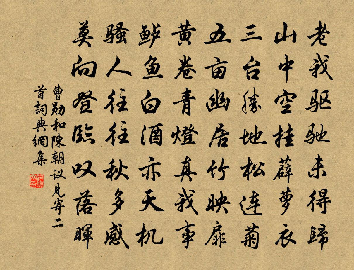 詩詞名句歷史字典書法欣賞書法字典國語詞典說文解字康熙字典古漢語字典標 題 作 者 詩 句 和陳朝議見寄二首作者:曹勛 朝代:宋代和陳朝議見寄二首原文老我驅馳未得歸,山中空掛薜蘿衣。三台勝地松連菊,五畝幽居竹映扉。黃卷青燈真我事,鱸魚白酒亦天機。騷人往往秋多感,莫向登臨嘆落暉。詩詞問答問:和陳朝議見寄二首的作者是誰?答:曹勛問:和陳朝議見寄二首寫於哪個朝代?答:宋代曹勛和陳朝議見寄二首書法欣賞和陳朝議見寄二首書法作品詩詞推薦湘潭道中詠芳草范成大〔宋代〕積雨條然晴,秀野若新沐。芳草徑寸姿,中有不勝綠。萋萋路傍情,頗亦念幽獨。驅馬去不顧,斷腸招隱曲。送台州崔錄事權德輿〔唐代〕不嫌臨海遠,微祿代躬耕。古郡紀綱職,扁舟山水程。詩因琪樹麗,心與瀑泉清。盛府知音在,何時薦政成。游瀟東和徐文淵徐照〔宋代〕天吏今如隱,相隨步野坡。山高臨古郡,天小入江波。香草春生遍,幽禽暮見多。更增游岳思,昨有寺僧過。辰州陶弼〔宋代〕詔條符節古連今,王澤漸濡豈不深。賦役未行中國法,謳歌猶帶遠人音。採金戶簇青莎岸,射虎兵圍黃葉林。寄語鷓鴣天(春暮)趙長卿〔宋代〕蜂蜜釀成花已飛。海棠次第雨胭脂。園林檢點春歸也,只有縈風柳帶垂。情默默,恨依依。可人天氣日長時。東風自子陵市尋路入游泉三首項安世〔宋代〕千年玉水閟深林,十里重罔隔世塵。猶恨子陵饒舌在,卻當戶口告行人。天育二老禪惠示經佛偈答以十詩鄭清之〔宋代〕老胡無聖亦無言,驀指虛空喚作禪。掌血條痕無著處,教誰白地患青顛。句高似孫〔宋代〕近澗取白水,初篘烹石蟹。宮祠滿秩曾幾〔宋代〕雲水天台郡,祠庭我所監。幾年真傲吏,今日是前銜。祿米誰周急,園蔬不療饞。上書端未免,定不達空函。詠史下諸葛孔明八首陳普〔宋代〕軻死無傳直至今,孔明曾一正人心。拔刀斫石今猶憤,何況當年感激深。踏莎行袁去華〔宋代〕醉拈黃花,笑持白羽。秋江綠漲迷平楚。燕鴻曾寄去年書,漢皋不記來時路。天際歸舟,雲中煙樹。蘭成憔悴愁難己酉六月阻水於宜春道間楓樹李曾伯〔宋代〕去國二千里,離家五十程。炎歊無計避,憂患以身更。誤矣驂鸞句,傷哉舐犢情。何時拂衣去,藜藿保餘生。自詠陸游〔宋代〕曾著杞菊賦,自名桑薴翁。常開羅爵綱,不下釣魚筒。租稅先期畢,陂塘與眾同。士章八十字,世世寫屏風。棲禪暮歸書所見二首唐庚〔宋代〕春著湖煙膩,晴搖野水光。草青仍過雨,山紫更斜陽。平泉佳景舒岳祥〔宋代〕清風截斷排檐雨,返景燒成冠嶺霞。定是來朝好春色,海棠須作小桃花。減字木蘭花佚名〔宋代〕庭梅初綻。風遞幽香清更遠。別有孤根。不待陽和一點恩。雪中風韻。皓質冰姿真瑩靜。月下精神。來到窗前疑是綿繡谷二首孔武仲〔宋代〕江城已月芳菲盡,殘紫深緋到谷中。最是廬山佳麗處,我來蕭颯已秋風。春歸次金陵吳融〔唐代〕春陰漠漠覆江城,南國歸橈趁晚程。水上驛流初過雨,樹籠堤處不離鶯。跡疏冠蓋兼無夢,地近鄉園自有情。便被復挽施士衡〔宋代〕十年帥鋮倦馳驅,適意方謀一壑居。賈誼有才終太傳,薛收無壽處中書。傷心風月江心古,過眼光陰夢幻虛。紅紫次韻酬昌叔羈旅之作王安石〔宋代〕君方困旅食,予亦誤朝簪。自索東方米,誰多季子金,高門萬馬散,窮巷一燈深。客主竟何事,蕭條梁父吟。名句推薦想得玉人情,也合思量我。孫光憲《生查子·窗雨阻佳期》 夜中不能寐,起坐彈鳴琴。阮籍《詠懷八十二首·其一》 如來者即諸法如義。鳩摩羅什譯《金剛經·究竟無我》 寄書長不達,況乃未休兵。杜甫《月夜憶舍弟》 小人肥口,君子肥身。佚名《增廣賢文·下集》 記得武陵相見日,六年往事堪驚周紫芝《臨江仙·送光州曾使君》 海日生殘夜,江春入舊年。王灣《次北固山下》 長者立,幼勿坐。長者坐,命乃坐。李毓秀《弟子規·出則弟》 多事年年二月風,翦出鵝黃縷。納蘭性德《卜運算元·新柳》 十二峰頭秋草荒,冷煙寒月過瞿塘。何景明《竹枝詞·十二峰頭秋草荒》
