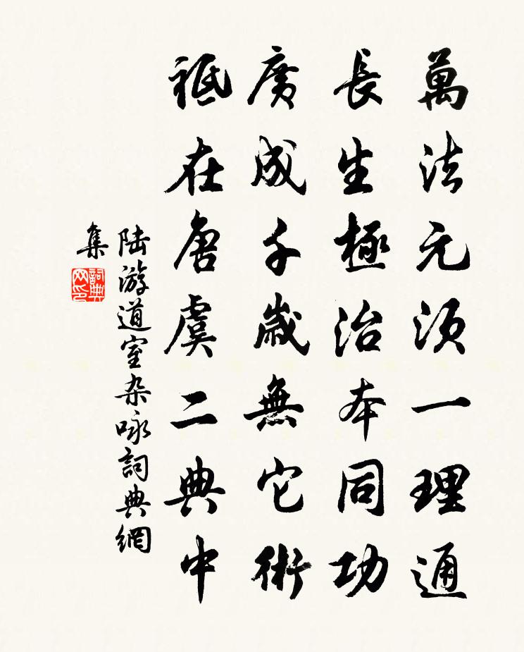 詩詞名句歷史字典書法欣賞書法字典國語詞典說文解字康熙字典古漢語字典標 題 作 者 詩 句 道室雜詠作者:陸游 朝代:宋代道室雜詠原文萬法元須一理通,長生極治本同功。廣成千歲無它術,祗在唐虞二典中。詩詞問答問:道室雜詠的作者是誰?答:陸游問:道室雜詠寫於哪個朝代?答:宋代問:陸游的名句有哪些?答:陸游名句大全陸游道室雜詠書法欣賞道室雜詠書法作品詩詞推薦泊雷江董嗣杲〔宋代〕沽酒難澆傀儡胸,風平浪息臥孤篷。寒知僵艤雷江口,醒落狂吟雪店中。勞去有身侔病鶴,愁回無耳聽哀鴻。行人和吳微明疏影橫斜水清淺七詠韻李呂〔宋代〕嶺上休將貝闕夸,江頭聊比玉川家。箇中真趣誰能會,獨對迴風雪陣斜。吳門別主人(一作吳門月夜與曹太尉話別)李頻〔唐代〕早晚更看吳苑月,小齋長憶落西窗。不知明夜誰家見,應照離人隔楚江。中台五題玉蕊(亂前唐昌觀玉蕊最盛)鄭谷〔唐代〕唐昌樹已荒,天意眷文昌。曉入微風起,春時雪滿牆。題岳陽樓馮時行〔宋代〕洞庭涵浸八百里,岳陽樓高跨湖尾。天空地迥豁疏襟,有客臨風來徙倚。是時窮冬天氣昏,慘澹愁殺湘君魂。層欄緣識宋太宗〔宋代〕任從寒暑鎮常侵,一氣韜藏萬種心。堪笑愚痴澆盪甚,卻非淳樸不幽深。題蘆雁屏洪邁〔宋代〕征鴻坐何事,天遣南北飛。蕭然如旅人,無情自相依。孤葦吹欲折,秋風不勝威。冥冥一孤騫,空費弋者機。寒聲題魁星王柏〔宋代〕天樞之宿為貪狼,引領三台朝帝旁。典司多士擅文場,名在第一聲播揚。因此冰炭痴兒腸,仿佛肖象祈流光。和孟虔州閒齋即事包何〔唐代〕古郡鄰江嶺,公庭半薜蘿。府僚閒不入,山鳥靜偏過。睥睨臨花柳,欄乾枕芰荷。麥秋今欲至,君聽兩岐歌。句許懋〔宋代〕千丈峽峰石,淙錚寒玉鳴。詠主人壁上畫鶴寄喬主簿崔著作陳子昂〔唐代〕古壁仙人畫。丹青尚有文。獨舞紛如雪。孤飛暖似雪。自矜彩色重。寧憶故池群。江海聯翩翼。長鳴誰復聞。朝謁太清宮九首真宗〔宋代〕要棧在戶,金奉在庭。籩豆有踐,黍稷非聲。平盡蠲潔,誠通杳冥。言旋風駟,祚我修齡。四月二十四日喜雨次振之韻蘇泂〔宋代〕朝來驟雨郁煩蒸,晚見疏星掛漢青。大點忽隨風信入,好聲先覺夢魂聽。春過種失農猶及,喜極詩成語未停。每恨憶秦娥汪元量〔宋代〕風聲惡。個人蕉萃憑高閣。憑高閣。相思無盡,淚珠偷落。錦書欲寄鴻難托。那堪更聽邊城角。邊城角。又添煩惱次韻梨花黃庭堅〔宋代〕桃花人面各相紅,不及天然玉作容。總向風塵塵莫染,輕輕籠月倚牆東。寄題蕭國賢佚我堂楊萬里〔宋代〕軟紅塵里幾時休,重碧杯中且拍浮。坐看痴兒夸絕足,可憐到老不回頭。幅巾蔾枝聊三徑,明月清風自一丘。我亦和二兄書事三首李廌〔宋代〕述逃內潰古雲多,楚塞群雄尚感歌。血饗彼猖神苟幸,廟謀非壯士誰何。將軍威信當詢眾,決勝神機豈謂他。試把風流子康與之〔宋代〕結客少年場。繁華夢,當日賞風光。紅燈九街,買移花市,畫樓十里,特地梅妝。醉魂盪,龍跳撝萬字,鯨飲吸三代陳公實上通守王剛父四首姜特立〔宋代〕洗甲通盟乒,同庚緩帶秋。邊聲寒臥鼓,海色靜明樓。冉冉歲雲莫,棲棲詩者流。不才同社櫟,一飲愧身謀。和王龜齡待制貢院落成二首吳芾〔宋代〕扁舟猶記拂洲苹,轉眼年華幾度新。愧我今年雙白鬢,喜君來駕兩朱輪。一時令不從如水,千里威行敬若神。擬訪名句推薦好夢欲成還又覺,綠窗但覺鶯啼曉。施耐庵《蝶戀花·一別家山音信杳》 寄書長不達,況乃未休兵。杜甫《月夜憶舍弟》 空獨倚東風,芳思誰寄。周密《繡鸞鳳花犯·賦水仙》 虛空落泉千仞直,雷奔入江不暫息。徐凝《廬山瀑布》 雞聲茅店月,人跡板橋霜。溫庭筠《商山早行》 老景蕭條,送君歸去添淒斷。毛滂《燭影搖紅·送會宗》 晚鴉飛去,一枝花影送黃昏夏完淳《婆羅門引·春盡夜》 玉樓深鎖薄情種。清夜悠悠誰共。秦觀《桃源憶故人·玉樓深鎖薄情種》 況是青春日將暮,桃花亂落如紅雨。李賀《將進酒》 夜來南風起,小麥覆隴黃。白居易《觀刈麥》
