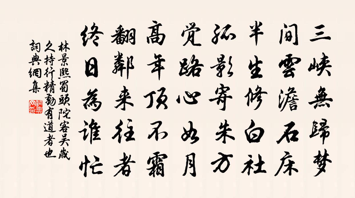詩詞名句歷史字典書法欣賞書法字典國語詞典說文解字康熙字典古漢語字典標 題 作 者 詩 句 蜀頭陀客吳歲久持行精勤有道者也作者:林景熙 朝代:宋代原文三峽無歸夢,間雲澹石床。半生修白社,孤影寄朱方。覺路心如月,高年頂不霜。翻鄰來往者,終日為誰忙。詩詞問答問:《蜀頭陀客吳歲久持行精勤有道者也》的作者是誰?答:林景熙問:該詩寫於哪個朝代?答:宋代書法欣賞蜀頭陀客吳歲久持行精勤有道者也書法作品詩詞推薦柳梢青楊無咎〔宋代〕瑞鴨煙濃。曉來弦管,聲在霜空。卻退寒威,借回春色,滿苑香風。幾時人下瑤宮。記千載、今朝慶逢。滿捧瑤觴梅花 其一王冕〔元代〕肯同凡卉爭妍?自與高人索笑。他年鼎鼐調和,不改山林節操。鑿山為墳貽侄有詩公韻方岳〔宋代〕著書無復可藏山,朽骨何堪定眠觀。從左右旋天倚蓋,哉生死魄月循環。虛空身亦為吾患,見在心誰乞汝安。試問留別周參政詩二首趙蕃〔宋代〕故意還叨累十觴,諸家所歷信逾常。黃塵倦馬久非地,野水白鷗終是鄉。勾漏不惟兼採藥,長沙更欲訪沉湘。憑虛即事王士禎〔清代〕十里田田荷芰風,漁舠如葉出花中。鵝兒湖北煙初暝,背指明霞幾縷紅。病餘兀坐偶成二絕王之望〔宋代〕病骨欒欒瘦轉加,秋風怯傍小窗紗。蕭然丈室維摩觀,一炷清香到日斜。春雨李商隱〔唐代〕悵臥新春白袷衣,白門寥落意多違。紅樓隔雨相望冷,珠箔飄燈獨自歸。遠路應悲春晼晚,殘霄猶得夢依稀。玉鐺釣台艾可翁〔宋代〕雲檯曆曆紀功臣,底事中間有子陵。未必故人同臥處,了無一語及中興。送林自知自幕中歸常亭真德秀〔宋代〕始吾與林子,周旋大江東。子方清且貧,簡瓢屢雲空。勁氣凜不折,耿耿如長虹。明年擢高科,對策大明宮。一尉金陵懷古李洞〔唐代〕古來無此戰爭功,日日戈船卷海風。一遇靈鰲開睡眼,六朝灰盡九江空。自袁州還京行次安陸,先寄隨州周員外(周君巢也)韓愈〔唐代〕行行指漢東,暫喜笑言同。雨雪離江上,蒹葭出夢中。面猶含瘴色,眼已見華風。歲暮難相值,酣歌未可終。陝城桃李零落盡硤石山中今方盛開馬上口占司馬光〔宋代〕西望飛花千樹暗,東來芳蕊一番新。行人不惜泥塗倦,喜見年光兩處春。郊進退律賦水鄉三實唐士恥〔宋代〕根荄七竅倍玲瓏,產爾亭亭曲渚風。勇退霞衣香故在,駢生玉子味仍鍾。人言太華標奇種,藕大如船想碧蓬。何待郊行夜歸有感陸游〔宋代〕小市歌呼散,幽人悄獨行。斷鴻沙際冷,重露草根明。信古痴常絕,酬恩命本輕。還家掩屏臥,衰涕浩縱橫。暮春陸游〔宋代〕數間茅屋鏡湖濱,萬卷藏書不救貧。燕去燕來還過日,花開花落即經春。開編喜見平生友,照水驚非曩歲人。自笑憶郊天鮑溶〔唐代〕憶向郊壇望武皇,九軍旗帳下南方。六龍日馭天行健,神母呈圖地道光。濃暖氣中生歷草,是非煙里愛瑤漿。至今玉蝴蝶晁沖之〔宋代〕目斷江南千里,灞橋一望,煙水微茫。盡鎖重門,人去暗度流光。雨輕輕,梨花院落,風淡淡、楊柳池塘。恨偏長夜雨曉發橫岡楊萬里〔宋代〕醞造通宵雨,殷懃數日風。加三濃稚綠,第一淡薦紅。潤物初非惠,司春豈有功。老農私獨喜,不羨去年豐。感事寄懷王彥舟侍郎蘇景謨大夫黃彥平〔宋代〕明月人千里,青陽歲又除。曲江行有債,幸捨出無輿。細寫蠅頭字,遙看雁足書。長江不可歷,幽意若為攄。直舍大風書事寄循道楊時〔宋代〕枕書無寐首空搔,萬竅噓風正怒號。雪意浮空迷遠目,月木疏影見秋毫。幽庭所藉惟荒草,妙理應須付濁醪。誰念名句推薦十年生死兩茫茫,不思量,自難忘。蘇軾《江城子·乙卯正月二十日夜記夢》 非懷北歸興,何用勝羈愁韓愈《洞庭湖阻風贈張十一署·時自陽山徙掾江陵》 士雖有學,而行為本焉。墨子《墨子·02章 修身》 小酌酒巡銷永夜,大開口笑送殘年。白居易《雪夜小飲贈夢得》 為我引杯添酒飲,與君把箸擊盤歌。白居易《醉贈劉二十八使君》 事有所出,功有所止。劉向《戰國策·趙二·武靈王平晝閒居》 不義不昵,厚將崩。左丘明《左傳·隱公·隱公元年》 池塘生春草,園柳變鳴禽。謝靈運《登池上樓》 桑柘影斜春社散,家家扶得醉人歸。王駕《社日》 桃花落。閒池閣。山盟雖在,錦書難托。陸游《釵頭鳳·紅酥手》