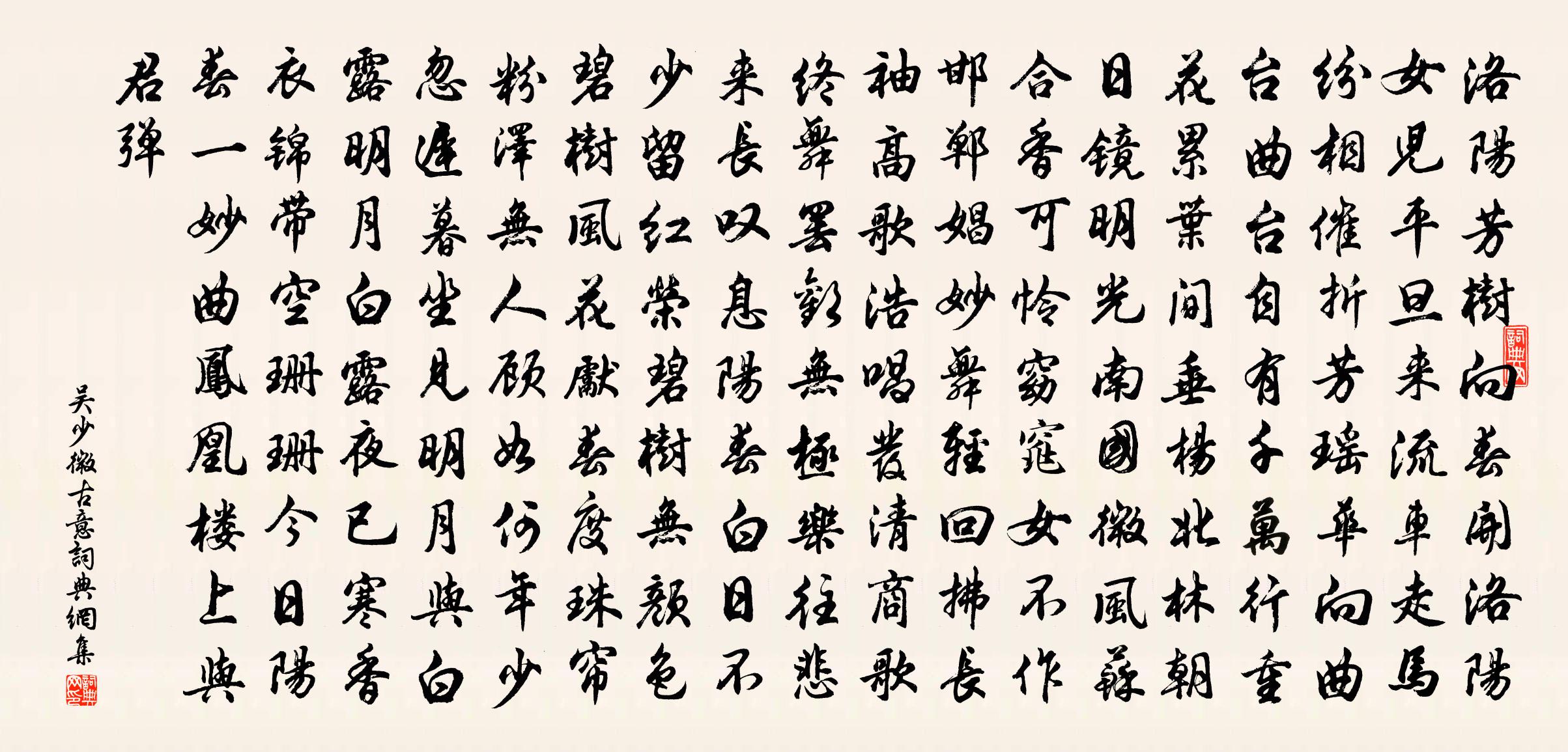 詩詞名句歷史字典書法欣賞書法字典國語詞典說文解字康熙字典古漢語字典標 題 作 者 詩 句 古意作者:吳少微 朝代:唐代古意原文洛陽芳樹向春開,洛陽女兒平旦來。流車走馬紛相催,折芳瑤華向曲台。曲台自有千萬行,重花累葉間垂楊。北林朝日鏡明光,南國微風蘇合香。可憐窈窕女,不作邯鄲娼。妙舞輕回拂長袖,高歌浩唱發清商。歌終舞罷歡無極,樂往悲來長嘆息。陽春白日不少留,紅榮碧樹無顏色。碧樹風花先春度,珠簾粉澤無人顧。如何年少忽遲暮,坐見明月與白露。明月白露夜已寒,香衣錦帶空珊珊。今日陽春一妙曲,鳳凰樓上與君彈。詩詞問答問:古意的作者是誰?答:吳少微問:古意寫於哪個朝代?答:唐代問:古意是什麼體裁?答:雜言吳少微古意書法欣賞古意書法作品注釋全唐詩:卷94_6詩詞推薦謝曹子方惠新茶劉分攵〔宋代〕陳植文華斗石高,景公詩句復稱豪。數奇不得封龍額,祿仕何妨有馬曹。囊間久藏科斗字,銛鋒新瑩鸊鵜膏。南州句項斯〔唐代〕佳人背江坐,眉際列煙樹。馬蹄沒青莎,船跡成空波。春風吹兩意,何意更相值。更望會稽何處是,沙連竹箭白鷳喜外弟盧綸見宿司空曙〔唐代〕靜夜四無鄰,荒居舊業貧。雨中黃葉樹,燈下白頭人。以我獨沈久,愧君相見頻。平生自有分,況是蔡家親。月下笛姜夔〔宋代〕與客攜壺,梅花過了,夜來風雨。幽禽自語。啄香心,度牆去。春衣都是柔荑剪,尚沾惹、殘茸半縷。悵玉鈿似掃漁家樂唐寅〔明代〕世泰時豐芻米賤,買酒頗有青銅錢。夕陽半落風浪舞,舟船入港無危顛。烹鮮熱酒招舍己,滄浪迭唱仿扣舷。醉來再和強至〔宋代〕我行平野覽秋空,物象吟懷覺兩雄。遠水有時明返照,疏林無限戰西風。京坻相望農收足,廬井多歡歲計充。亦向庭草曹鄴〔唐代〕庭草根自淺,造化無遺功。低回一寸心,不敢怨春風。端居釋文珦〔宋代〕為得近樵漁,閒尋此地居。省交長閉戶,耽靜欲焚書。自愛心情澹,人嫌禮貌疎。徑從荒草沒,衰懶不能除。馬冠山楊諄〔宋代〕陳家宅廢桑畦暗,馬道冠亡羽觀空。惟有山南古程氏,雕檐一簇翠煙中。醉題埭西酒家陸游〔宋代〕陣陣新寒入布裘,偶乘小醉得閒遊。丹楓落日野橋晚,斷雁濕雲江路秋。馬得一鳴何恨斥,金經百鏈豈容柔?不知春晚寄微之白居易〔唐代〕三月江水闊,悠悠桃花波。年芳與心事,此地共蹉跎。南國方譴謫,中原正兵戈。眼前故人少,頭上白髮多。通州過龍潭澳陳耆卿〔宋代〕久闊松楸信,因為龍澳來。四山黃戀葉,一水綠澄苔。地曠樵聲出,天寒雁影回。無人且無酒,清坐興悠哉。建康六感宋劉子翬〔宋代〕寄奴真偉人,落拓龍潛地。據筵呼五木,已有吞世氣。世期值陽九,天綱日淪夫。偏邦可跨州,卑號猶稱帝。匪乘遣興四首廖行之〔宋代〕無客共談道,有誰能賞心。人生要自得,窮困吾能禁。李大椿伯壽見示寶劍歌答之趙蕃〔宋代〕李子久不調,慷慨多雄辭。題為寶劍篇,贈我何足知。我為讀數過,因之重嗟咨。尚方願賜有朱雲,櫑具帶劍有不呈竹石亭陳著〔宋代〕說道疏時元是密,偶於忙處得尋閒。宿愁復嶺重山外,新趣清風明月閒。贈童子蚍蜉晁說之〔宋代〕拂拭方山帽,安排一復巾。春秋書滿架,整整莫因循。和鄭國器六首曹勛〔宋代〕歸休三徑得怡顏,何所羊裘與釣竿。剩得新詩載行事,如游玄圃拾瑯玕。寄陝府通判孫狀元兼簡令弟秀才王禹偁〔宋代〕商山留滯再經年,咫尺無由見狀元。會赦未教歸北闕,高歌應合遇東園。寸心謾道如弦直,兩鬢難禁似雪繁。兄弟觀黃介夫寺丞所收丘潛畫牛梅堯臣〔宋代〕丘畫吳牛希戴嵩,吳牛角偃彎如弓。老牯望{左牛右孛}犢望母,母下平坡離牧童。牧童吹笛坡頭坐,古樹蕭騷葉名句推薦知君獨坐青軒下,此時結念同所懷。李白《早秋單父南樓酬竇公衡》 白骨露於野,千里無雞鳴。曹操《蒿里行》 相逢秋月滿,更值夜螢飛。王績《秋夜喜遇王處士》 澤國江山入戰圖,生民何計樂樵蘇。曹松《己亥歲二首·僖宗廣明元年》 力拔山兮氣蓋世。時不利兮騅不逝。項羽《垓下歌》 貨無大小,缺者便貴。馮夢龍《醒世恆言·卷三十五》 故人溪上,掛愁無奈,煙梢月樹。史達祖《留春令·詠梅花》 知者不博,博者不知。老子《老子·德經·第八十一章》 顧此耿耿存,仰視浮雲白。文天祥《正氣歌》 太平之世多長壽人。王充《論衡·卷一·氣壽篇》