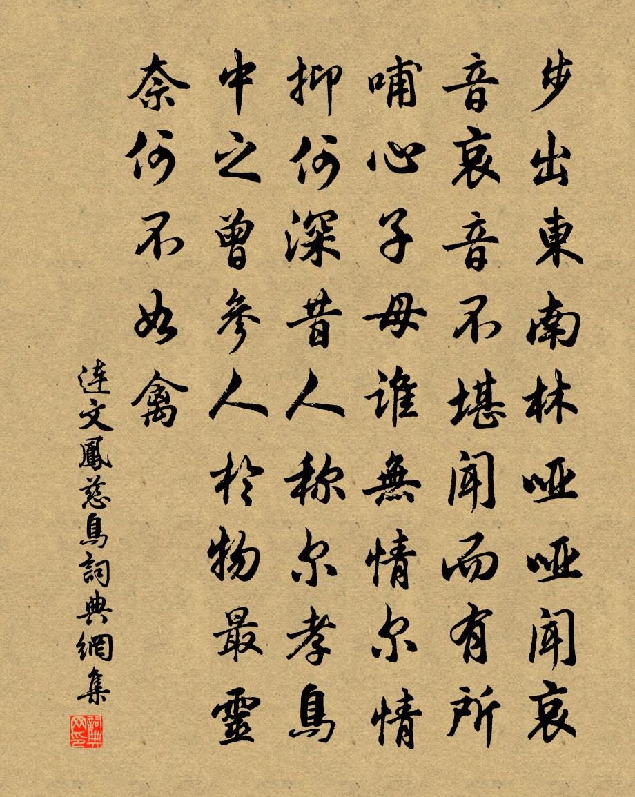 詩詞名句歷史字典書法欣賞書法字典國語詞典說文解字康熙字典古漢語字典標 題 作 者 詩 句 慈鳥作者:連文鳳 朝代:宋代慈鳥原文步出東南林,啞啞聞哀音。哀音不堪聞,而有所哺心。子母誰無情,爾情抑何深。昔人稱爾孝,鳥中之曾參。人於物最靈,奈何不如禽。詩詞問答問:慈鳥的作者是誰?答:連文鳳問:慈鳥寫於哪個朝代?答:宋代連文鳳慈鳥書法欣賞慈鳥書法作品詩詞推薦憶秦娥(為曹氏胭脂閣嘆)劉辰翁〔宋代〕春如昨。曉風吹透胭脂閣。胭脂閣。滿園茅草,冷煙城郭。青衫淚盡樓頭角。佳人夢斷花間約。花間約。黃昏細雨次韻王待制游東坡留題十一絕喻良能〔宋代〕筆下無非幼婦辭,胸中端擬效安期。我生只許拜遺像,不見先生無恙時。偈頌七十八首釋正覺〔宋代〕去時踏雪似來時,來去途中一色迷。妙得轉身賓是主,宗家正令付全提。獨至遯庵避暑庵在大竹林中陸游〔宋代〕赤日黃塵厭垢紛,竹林深處寄幽欣。如聽嵩雒風前笛,似看瀟湘雨後雲。園鹿知時新解角,池魚得意自成群。悠然涼州詞張籍〔唐代〕邊城暮雨雁飛低,蘆筍初生漸欲齊。無數鈴聲遙過磧,應馱白練到安西。奉和王相公早春登徐州城皇甫冉〔唐代〕落日憑危堞,春風似故鄉。川流通楚塞,山色繞徐方。壁壘依寒草,旌旗動夕陽。元戎資上策,南畝起耕桑。阮郎歸仇遠〔宋代〕教他雙燕意循循。隔湖楊柳深。芹香泥滑趁新晴。差池來往頻。春浪暖,綠無痕。醒人也醉人。斷橋日落水雲昏。楊柳枝(淡月)王質〔宋代〕慣得嬌雲趕不開。去還來。淡光無可照樓台。且停杯。薄雨疏疏時幾點,灑浮埃。賣花未上擔兒抬。聽他催。和諸學士秋夕禁直偶(一作遇)雪吳融〔唐代〕大華積秋雪,禁闈生夜寒。硯冰憂詔急,燈燼惜更殘。正遂攀稽願,翻追訪戴歡。更為三日約,高興未將闌。贈歌姬崔仲容〔唐代〕水剪雙眸霧剪衣,當筵一曲媚春輝。瀟湘夜瑟怨猶在,巫峽曉雲愁不稀。皓齒乍分寒玉細,黛眉輕蹙遠山微。渭城秋晚與許端甫山行顧逢〔宋代〕山行多妙處,妙在倚筇中。到此興難盡,吟成詩不同。松濤鳴絕壑,葉雨下晴空。鐘鼓雲邊寺,應知有路通。送李端(一作盧綸詩)嚴維〔唐代〕故關衰草遍,離別正堪悲。路出寒雲外,人歸暮雪時。少孤為客早,多難識君遲。掩泣空相向,風塵何所期。房陵十首陳造〔宋代〕陰晴未敢捲簾看,苦霧蒙蒙鼻為酸。政使病餘剛制酒,一杯要敵澇朝寒。荀子引古言佚名〔先秦〕衣與繆與。不女聊。減字木蘭花(貪)沈瀛〔宋代〕貪而忘止。貪即生瞋逢飽喜。一逐貪風。恨不當初嫁鄧通。殘杯剩酒。食籍名中猶折壽。若使兼何。他日陰司罪過鵲橋仙(七夕)葛勝仲〔宋代〕鵲橋仙偶,天津輕渡,卻笑嫦娥孤皎。平時五夜似經年,問何事、今宵便曉。雲車將駕,神夫留戀,更吐心期多少錦亭陸游〔宋代〕天公為我齒頰計,遣飫黃甘與丹荔;又憐狂眼老更狂,令看廣陵芍藥蜀海棠。周行萬里逐所樂,天公於我元不薄。伊尹墓范成大〔宋代〕三尺黃壚直棘邊,此心終古享皇天。汲書猥述流傳妄,剖擊嗟無咎單篇。生查子李石〔宋代〕今年花發時,燕子雙雙語。誰與卷珠簾,人在花間住。明年花發時,燕語人何處。且與寄書來,人往江南去。已亥雜詩 67龔自珍〔清代〕十仞書倉郁且深,為夸目錄散黃金。吳回一怒知天意,無復龍威禹穴心。名句推薦花前失卻遊春侶,獨自尋芳。馮延巳《採桑子·花前失卻遊春侶》 馬上牆頭,縱教瞥見,也難相認晁端禮《水龍吟·詠月》 閒夢江南梅熟日,夜船吹笛雨蕭蕭。皇甫松《夢江南·蘭燼落》 水流花謝兩無情,送盡東風過楚城。崔塗《春夕》 城上高樓接大荒,海天愁思正茫茫。柳宗元《登柳州城樓寄漳汀封連四州》 相呼相應湘江闊,苦竹叢深日向西。鄭谷《鷓鴣》 大凡物不得其平則鳴韓愈《送孟東野序》 今夕復何夕,共此燈燭光。杜甫《贈衛八處士》 東風有信無人見,露微意、柳際花邊。蘇軾《一叢花·今年春淺侵年》 停車數行日,勸酒問回期。王建《送人游塞》