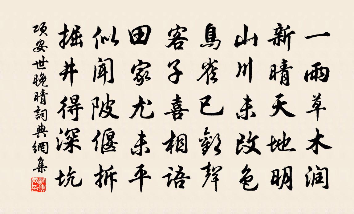 詩詞名句歷史字典書法欣賞書法字典國語詞典說文解字康熙字典古漢語字典標 題 作 者 詩 句 晚晴作者:項安世 朝代:宋代晚晴原文一雨草木潤,新晴天地明。山川未改色,鳥雀已歡聲。客子喜相語,田家尤未平。似聞陂偃拆,掘井得深坑。詩詞問答問:晚晴的作者是誰?答:項安世問:晚晴寫於哪個朝代?答:宋代項安世晚晴書法欣賞晚晴書法作品詩詞推薦書事四首高斯得〔宋代〕晨炊出避寇,中夜尚傷弓。赤地眠枯秸,青天入短蓬。可憐窮白叟,所至聚黃童。老耳雖多聵,時聞話相公。舟次磁湖以風浪留二日不得進子瞻以詩見寄作蘇轍〔宋代〕西歸猶未有苑裘,擬就南遷買一丘。舟楫自能通蜀道,林泉真欲老黃州。魚多釣戶應容貰,酒熟鄰翁便可留。從此和主簿喜雨二首虞儔〔宋代〕年來事事與心違,墨綬塵勞莫我知,慷慨歸田雖有賦,殷勤喜雨漫賡詩。誰憐飯顆山頭瘦,卻想松江水面肥。一笑鶴謠八首白玉蟾〔宋代〕鶴者沖虛之梯兮冥冥,朱霞弁兮翠錦熭,浩然歸兮遼東。七絕句羅公升〔宋代〕天豈私貧我,看書每自疑。寸心即知己,不用世人知。春愁韓琮〔唐代〕金烏長飛玉兔走,青鬢長青古無有。秦娥十六語如弦,未解貪花惜楊柳。吳魚嶺雁無訊息,水誓蘭情別來久。勸君感興二首白玉蟾〔宋代〕又見荷開滿故園,夙紅昨紫儼然存。畫梁飛燕前身趙,曲檻歌鶯阿姊樊。累日脾疾自歌李曾伯〔宋代〕壯年筋力慣驅馳,堪嘆新來數問醫。生老病催無怪者,寸關亦可自知之。養痾抗疏吾謀是,論證投方某劑宜。識破太平道中遇流民王炎〔宋代〕丁男負荷力已疲,弱妻稚子顏色悲。親戚墳墓誰忍棄,嗟爾豈願為流移。春蠶成繭谷成穗,輸入豪家無孑遺。豐年雜劇·山神廟裴度還帶關漢卿〔元代〕第一折(沖末王員外同旦兒、淨家童上)(王員外雲)耕牛無宿料,倉鼠有餘糧。萬事分已定,浮生空自忙。自家和馬粹老四明雜詩聊記里俗耳十首舒坦〔宋代〕蓮閣紅堪掣,瀾池靜不流。梯航紛絕徼,冠蓋錯中州。草市朝朝合,沙城歲歲修。雨前茶更好,半屬賈船收。次郭秘正韻陳造〔宋代〕伊昔乃祖使朔幽,艱難以來無此流。節旄欲盡氣彌厲,始元屬國真其疇。清篇神護到江表,河梁訴別豈所侔。嗣孫醉歌汪元量〔宋代〕衣冠不改只如先,關會通行滿市廛。北客南人成買賣,京師依舊使銅錢。登定王台趙汝譡〔宋代〕湘中十七門,層層居中央。經宮自何代,傅是漢定王。窮力致遠士,側身思鹹陽。地褊乃後絕,炎靈久無光。今非送晁監丞赴婺州關市之役王禹偁〔宋代〕關征市賦縻賢俊,誰愛此官為吏隱。將作晁丞於役時,婺女星臨海邊郡。黃絹辭高位尚卑,白華行潔身猶困。會待贈小窗黃君方回〔宋代〕渾天星斗胸中轉,動地風雷舌上生。想見少年讀書夜,短檠膏盡小窗明。緣識宋太宗〔宋代〕堅心不退道皆同,元始天尊大教通。多是世人迷自惑,豈能容易見仙蹤。送王昭祖國史吏部歸丹陽七絕史堯弼〔宋代〕知君家住練湖邊,家近東南尺五天。一棹賦歸天有意,練湖歸看滿湖蓮。本意(癸丑三月十九日,用明楊孟載韻)陳維崧〔清代〕中酒心情,拆棉時節,瞢騰剛送春歸。一畝池塘,綠蔭濃觸簾衣。柳花攪碎晴暉,更畫梁玉剪交飛。販茶船重,挑野夫采鞭於東山偶得元者羊士諤〔唐代〕追風豈無策,持斧有遐想。鳳去留孤根,岩懸非朽壤。苔斑自天生,玉節垂雲長。勿謂山之幽,丹梯亦可上。名句推薦今年歡笑復明年,秋月春風等閒度。白居易《琵琶行 / 琵琶引》 明月照相思,也得姮娥念我痴。高鶚《南鄉子·戊申秋雋喜晤故人》 孤燈不明思欲絕,卷帷望月空長嘆。美人如花隔雲端!李白《長相思·其一》 胭脂淚,相留醉,幾時重。李煜《相見歡·林花謝了春紅》 圓者之轉,非能轉而轉,不得不轉也;方者之止,非能止而止,不得不止也。尹文《尹文子·大道上》 龍蛇四海歸無所,寒食年年愴客心。屈大均《壬戌清明作》 東風吹柳日初長,雨余芳草斜陽。秦觀《畫堂春·春情》 有美一人,清揚婉兮。佚名《野有蔓草》 鳥飛千白點,日沒半紅輪。白居易《彭蠡湖晚歸》 惡言不出於口,忿言不反於身。戴聖《禮記·祭義》