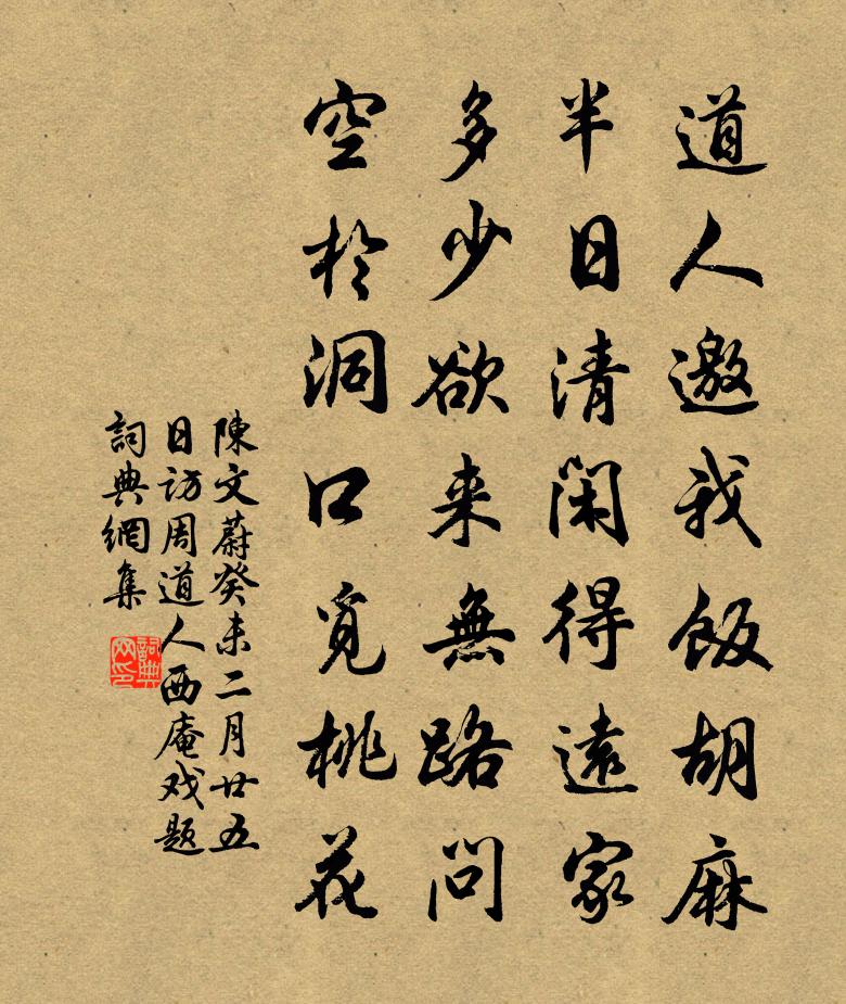 詩詞名句歷史字典書法欣賞書法字典國語詞典說文解字康熙字典古漢語字典標 題 作 者 詩 句 癸未二月廿五日訪周道人西庵戲題作者:陳文蔚 朝代:宋代原文道人邀我飯胡麻,半日清閒得遠家。多少欲來無路問,空於洞口覓桃花。詩詞問答問:《癸未二月廿五日訪周道人西庵戲題》的作者是誰?答:陳文蔚問:該詩寫於哪個朝代?答:宋代書法欣賞癸未二月廿五日訪周道人西庵戲題書法作品詩詞推薦減字木蘭花(諸齋作真率會、又用前韻賦木蘭花令三首)沈瀛〔宋代〕陋人居止。旬一集真終日喜。先自薰風。客目輪流次第通。昔賢置酒。十老半千年紀壽。知彼由何。真處閒中日月閒十詠仇遠〔宋代〕階前紫蔓金絲草,籬角紅垂錦帶花。梓澤平泉易消歇,春留富貴與詩家。強立許酒不至因以趣之李處權〔宋代〕北里溪山翠滿門,似聞小阮瓮浮春。憐渠世亂益風味,念我途窮多苦辛。曠士可無千日醉,浮生何事百年身。臨風送李七之笮水謁張相公劉長卿〔唐代〕惆悵青春晚,殷勤濁酒壚。後時長劍澀,斜日片帆孤。東閣邀才子,南昌老腐儒。梁園舊相識,誰憶臥江湖。接伴書懷曹勛〔宋代〕客路空過桃李春,塞塵溫遍馬蹄痕。薺花如雪苔苗老,應有垂楊綠蔭門。皎然禪師《贈吳憑處士》詩云世人不知心是蘇軾〔宋代〕寒時便具熱時風,飢漢那知食藥功。莫怪禪師向西笑,緣師身在長安東。蝶戀花(西堂竹閣,日氣溫然,戲作)丘崈〔宋代〕逼砌筠窗圍小院。日照花枝,疏影重重見。金鴨無風香自暖。臘寒才比春寒淺。畫景溫溫烘筆硯。閒把安西,六紙同離孫童蒙游淨慈陳著〔宋代〕三月第三日,又來游梵林。醉言驚俗耳,貧趣契僧心。犬吠落紅外,鳥啼空翠陰。一年最佳處,分付老齡吟。詠史下元紫芝陳普〔宋代〕天竇膏肓在羽衣,寂寥於蒍詎能醫。當時宇宙皆聲色,不夢陽台一紫芝。十報恩 道友問在家能修行否馬鈺〔元代〕神仙要做戀妻男。忙裡偷閒道上參。清淨門庭無意認, * 術法入心貪。欲求家道兩全美,怎悟寂寥一著甘。莫待寒燠方回〔宋代〕仲秋帆清湍,單衣滴垢汗。曾不兩朔望,擁綿熾爐炭。萬古正如此,寒燠頃刻換。愁人苦夜長,志士惜日晏。何似奉和襲美公齋四詠次韻新竹陸龜蒙〔唐代〕別塢破苔蘚,嚴城樹軒楹。恭聞稟璇璣,化質離青冥。色可定雞頸,實堪招鳳翎。立窺五嶺秀,坐對三都屏。晴月水調歌頭曾布〔宋代〕●排遍第一魏豪有憑燕,年少客幽并。擊球鬥雞為戲,遊俠久知名。因避仇、來東郡。元戎留屬中軍。直氣凌貔虎攬照文同〔宋代〕恥將衰晚競青春,強把圓波拂曉塵。自笑年來須鬢白,王昭不解作官人。江神子(李別駕招飲海棠花下)吳文英〔宋代〕翠紗籠袖映紅霏。冷香飛。洗凝脂。睡足嬌多,還是夜深宜。翻怕迴廊花有影,移燭暗,放簾垂。尊前不按駐雲詞李參政生日魏了翁〔宋代〕才記官來早去官,行人驚說路艱難。行藏用舍何關我,時把尼淵出處看。斬偶行趙孟堅〔宋代〕君不見昌黎諫佛骨,竟莫遂請水火投。中丞擊妖蛇,此蛇初不為民尤。寧如立斬興妖偶,卓哉偉見吾邦侯。吁嗟三次韻鑒中八詠於石〔宋代〕驅車曉行邁,行行出郊郭。斷岡屹崇墉,虛籟殷靈壑。雨深瑤草長,風定松花落。西山有爽氣,逍遙倚晴閣。老史蘇轍〔宋代〕口食陽翟粟,身衣陽穀絲。二物不相即,飽暖常不時。老史知我窮,一歲一賓士。方暑勸脂車,苦寒伺來歸。嗟我琴二首王令〔宋代〕不獨區區操縵間,要期追逐古風還。吾民有慍何當解,學得南風不敢彈。名句推薦越鳥巢乾後,歸飛體更輕。李商隱《晚晴》 邊雪藏行徑,林風透臥衣。賈島《送鄒明府游靈武》 積學以儲寶,酌理以富才劉勰《文心雕龍·神思》 歷冰霜、不變好風姿,溫如玉。陸容《滿江紅·詠竹》 酒市漸閒燈火,正敲窗、亂葉舞紛紛。孔夷《南浦·旅懷》 漠漠水田飛白鷺,陰陰夏木囀黃鸝。王維《積雨輞川莊作 / 秋歸輞川莊作》 不力行,但學文。長浮華,成何人。李毓秀《弟子規·餘力學文》 富而可求也,雖執鞭之士,吾亦為之。如不可求,從吾所好。孔子弟子《論語·述而篇》 王濬樓船下益州,金陵王氣黯然收。劉禹錫《西塞山懷古》 揚人惡,即是惡。疾之甚,禍且作。李毓秀《弟子規·泛愛眾》