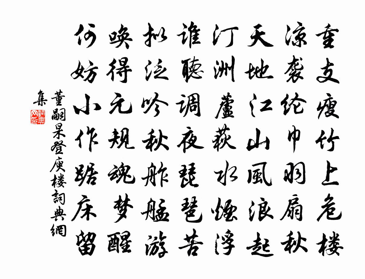 詩詞名句歷史字典書法欣賞書法字典國語詞典說文解字康熙字典古漢語字典標 題 作 者 詩 句 登庾樓作者:董嗣杲 朝代:宋代登庾樓原文重支瘦竹上危樓,涼襲綸巾羽扇秋。天地江山風浪起,汀洲蘆荻水煙浮。誰聽調夜琵琶苦,擬泛吟秋舴艋游。喚得元規魂夢醒,何妨小作踞床留。詩詞問答問:登庾樓的作者是誰?答:董嗣杲問:登庾樓寫於哪個朝代?答:宋代董嗣杲登庾樓書法欣賞登庾樓書法作品詩詞推薦州中小飲便別牛相李紳〔唐代〕笙歌罷曲辭賓侶,庭竹移陰就小齋。愁不解顏徒滿酌,病非傷肺為憂懷。恥矜學步貽身患,豈慕醒狂躡禍階。從此幽居戴某〔宋代〕幽棲張一室,意足便為安。片石星霜老,八窗風月寒。已無蝸角累,自號鹿門看。清夜誰同語,橫琴試一彈。句釋本逸〔宋代〕醫王不是無方義,千里蘇香象不回。巫山十二峰陽枋〔宋代〕真靈間氣巧蟠融,天下應無似此峰。笑殺襄王凡俗骨,妄生狂夢想仙蹤。送汝端兄南還兄自詫有仙授異丹故篇中及之郭昭務〔宋代〕一榻清風喜共攀,又攜姜被惜間關。虛誇海外千年藥,不借平原十日閒。鴻雁幾時才北向,蓴鱸有約竟南還。野情送僧歸護國寺宋綬〔宋代〕台嶺分燈契上機,政庭傳教及禪扉。供開薄饌持盂至,夢憶霞標振策歸。吟硯自澄晨磬徹,經窗間掩夕香微。袍紋寄趙庶明推官石介〔宋代〕四十年來贊太平,君王耳畔管簫聲。定襄地域俄連震,萊牧男兒忽議兵。明日邊烽高百尺,同時御府出三旌。將軍蒲圻道中遇雪二首王炎〔宋代〕天慘雲垂地,風寒雪塞塗。驟看花滿眼,己覺粟生膚。冷屋無鳴漏,冰枝有立烏。馬寒如}蝟縮,行役厭馳驅。次韻王適上元夜二首蘇轍〔宋代〕宿雨初乾試火城,端居無計伴遊行。厭看門外繁星動,想見僧窗一點明。老罷逢春無樂事,夢回孤枕有鄉情。重因江城子(再和呈馬守)王庭珪〔宋代〕天回北斗欲中宵。屢移杓。客魂消。記得皇州,燈火虹成橋。異俗西南開萬里,冠帶盡,百蠻徭。盧溪太守未還朝題薔薇花朱慶餘〔唐代〕四面垂條密,浮陰入夏清。綠攢傷手刺,紅墮斷腸英。粉著蜂須膩,光凝蝶翅明。雨中看亦好,況復值初晴。捕蝗至浮雲嶺山行疲苦有懷子由弟二首蘇軾〔宋代〕西來煙障塞空虛,灑遍秋田雨不如。新法清平那有此,老身窮苦自招渠。無人可訴烏銜肉,憶弟難憑犬寄書。自笑謝龍圖李待制見寄魏野〔宋代〕遙知清貴孰能攀,天上閒勝地上閒。除對聖君論道外,時題詩句落人間。春晴懷故園海棠二首楊萬里〔宋代〕故園今日海棠開,夢入江西錦繡堆。萬物皆春人獨老,一年過社燕方回。似青似白天濃淡,欲墮還飛絮往來。無那游九鎖山棲真洞林景熙〔宋代〕聞有真人白日升,洞天千古卓崚嶒。頂高絕似撐華蓋,穴暝初疑入武陵。秋靜石枰空暈蘚,寒生泉縫忽懸冰。依依送吉校書東歸司空曙〔唐代〕少年芸閣吏,罷直暫歸休。獨與親知別,行逢江海秋。聽猿看楚岫,隨雁到吳洲。處處園林好,何人待子猷。偶興四首韓元吉〔宋代〕江南菊少開金色,只有霜葩雜御黃。乞得黃花真愛惜,明年賸種壓群芳。雜詩王維〔唐代〕朝因折楊柳,相見洛陽隅。楚國無如妾,秦家自有夫。對人傳玉腕,映燭解羅襦。人見東方騎,皆言夫婿殊。持謝次韻安禮見寄楊時〔宋代〕末俗相看老尚新,交遊千里更誰親。蕭條身世聊安分,迂闊行藏懶徇人。宦路競羞關柝吏,勞生誰息利名身。我慚和永叔六篇其二代鳩婦言梅堯臣〔宋代〕不如作繭依蠶蔟,以絲自裹還自足。與爾為婦過一生,怒即分飛同轉目。辛勤唯雛寄鵲巢,子母生離因爾逐。羽毛名句推薦無限傷心夕照中,故國淒涼,剩粉余紅。夏完淳《一剪梅·詠柳》 望時而待之,孰與應時而使之。荀子《荀子·天論》 寥落古行宮,宮花寂寞紅。元稹《行宮》 鄉心新歲切,天畔獨潸然。劉長卿《新年作》 霜殞蘆花淚濕衣,白頭無復倚柴扉。與恭《思母》 風也蕭蕭,雨也蕭蕭,瘦盡燈花又一宵。納蘭性德《採桑子·誰翻樂府淒涼曲》 無可奈何花落去,似曾相識燕歸來。晏殊《浣溪沙·一曲新詞酒一杯》 人孰無親,罪人慎察其宗。來俊臣《羅織經·固榮卷第六》 舊時茅店社林邊,路轉溪橋忽見。辛棄疾《西江月·夜行黃沙道中》 上馬擊狂胡,下馬草軍書。陸游《觀大散關圖有感》