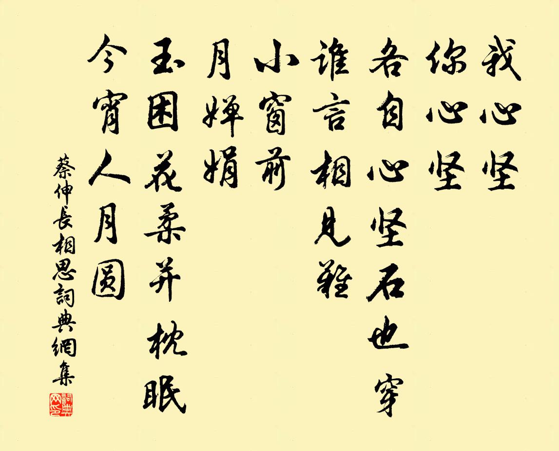 詩詞名句歷史字典書法欣賞書法字典國語詞典說文解字康熙字典古漢語字典標 題 作 者 詩 句 長相思作者:蔡伸 朝代:宋代長相思原文我心堅。你心堅。各自心堅石也穿。誰言相見難。小窗前。月嬋娟。玉困花柔並枕眠。今宵人月圓。詩詞問答問:長相思的作者是誰?答:蔡伸問:長相思寫於哪個朝代?答:宋代問:長相思是什麼體裁?答:詞蔡伸長相思書法欣賞長相思書法作品詩詞推薦上余倅生辰唐律十章唐士恥〔宋代〕此事人惟歸厚德,那知天意箇中明。君看略掃妖狐窟,喚得傾盆雨自生。題京口多景樓劉過〔宋代〕壯觀東南二百州,景於多處卻多愁。江流千古英雄淚,山掩諸公富貴羞。北府只今唯有酒,中原在望莫登樓。西風立春前三日雪明日猶未已時簡子進彥博昆仲示趙蕃〔宋代〕衾冷方高臥,窗明誤攬衣。問梅穿破履,借米啟柴扉。曉日猶藏密,和風盍解圍。冬春俱正令,寧復病年飢。次省齋桂花楊公遠〔宋代〕羨君詩句正而葩,閒對西風賦桂花。可惜分來蟾窟種,如今遍曾野人家。卜運算元(中秋欲雨還晴,惠力寺江月亭用東坡先生韻示諸禪老寄徐師川樞密)向子諲〔宋代〕雨意挾風回,月色兼天靜。心與秋空一樣清,萬象森如影。何處一聲鍾,令我發深省。獨立滄浪忘卻歸,不覺霜華頌古十首釋慧空〔宋代〕動弦別曲,葉落知秋。抉議不來,休休休休。同年李郎中以詩見寄仍許見過次韻和答張伯玉〔宋代〕新定溪山國,病懷忻所依。桐君談藥妙,嚴瀨得魚肥。吏退鈔書譜,朋來典道衣。軒車如顧我,春酒上苔磯。白雲閣史堯弼〔宋代〕閣虛雲出沒,雲閣兩無心。旌旆千山立,笙午萬籟深。相君聊暇日,籃輿得幽尋。徒倚天東北,狼煙猶爾侵。挽樓樞密二首吳芾〔宋代〕憶昔登龍日,從容接勝游。軒窗臨綠野,尊俎俯清流。尚欲榮花塢,那知負釣舟。新阡何處是,極目暮雲愁。自桐廬如蘭溪有寄權德輿〔唐代〕東南江路舊知名,惆悵春深又獨行。新婦山頭雲半斂,女兒灘上月初明。風前盪颺雙飛蝶,花裡間關百囀鶯。滿目悼張道古(昭宗時道古官拾遺以直諫貶蜀中死)貫休〔唐代〕清河逝水大匆匆,東觀無人失至公。天上君恩三載隔,鑒中鸞影一時空。墳生苦霧蒼茫外,門掩寒雲寂寞中。惆悵贈朱嚴王禹偁〔宋代〕未得科名鬢已衰,年年憔悴在京師。妻裝秋卷停燈坐,兒趁朝餐乞米炊。尚對交朋賒酒飲,遍看卿相借驢騎。誰憐讀書四首曾幾〔宋代〕童子區區攻一藝,老生汲汲事三餘。偶然領會忘言處,只有淵明解讀書。自警陸游〔宋代〕少年不自量,妄意慕管葛;晚節雖知難,猶覬終一豁。悲哉老病馬,解縱誰復秣?既辭箠轡勞,始愛原野闊。飲澗太極觀奉冊實一首真宗〔宋代〕薦號穹冥,登名祖爾。陟配陽郊,協宣典禮。感電靈區,誕聖鴻懿。冊實斯陳,福祿來暨。送菜徐秀才李新〔宋代〕吏部虀鹽滿腹,先生苜蓿盈盤。珍重尋常痴客,不作膏粱眼看。會蔡子思張叔獻二教授劉子翬〔宋代〕膠庠夙昔記追隨,物變時移萬事非。曉闕風煙胡騎滿,夜窗燈火故人稀。中郎秉德無瑕纇,平子談經有旨歸。獨我夜坐楊萬里〔宋代〕背壁青燈勸讀書,窺窗素月喚看渠。向來諸老端何似,未必千年便不如。春後春前雙雪鬢,江南江北一茅廬。只愁著佚名〔先秦〕俟我於著乎而,充耳以素乎而,尚之以瓊華乎而。俟我於庭乎而,充耳以青乎而,尚之以瓊瑩乎而。俟我於堂乎而詠槐李復〔宋代〕當年夾路綠參差,曾擁金輿拂羽旗。得地偶逃斤斧幸,聞風非與雪霜期。猶殘臘火燔空腹,時有驚雷起蠹枝。想見名句推薦君子素其位而行,不願乎其外。子思《中庸·第十四章》 四月南風大麥黃,棗花未落桐葉長。李頎《送陳章甫》 碧毯線頭抽早稻,青羅裙帶展新蒲。白居易《春題湖上》 自知者英,自勝者雄。王通《中說·卷四·事君篇》 牛困人飢日已高,市南門外泥中歇。白居易《賣炭翁》 柳鎖鶯魂,花翻蝶夢,自知愁染潘郎史達祖《夜合花·柳鎖鶯魂》 大人者,不失其赤子之心者也。孟子《孟子·離婁章句下·第十二節》 君人者,愛民而安,好士而榮,兩者無一焉而亡。荀子《荀子·君道》 日夕涼風至,聞蟬但益悲。孟浩然《秦中感秋寄遠上人 / 秦中寄遠上人》 一家之計在於和,一生之計在於勤。佚名《增廣賢文·上集》
