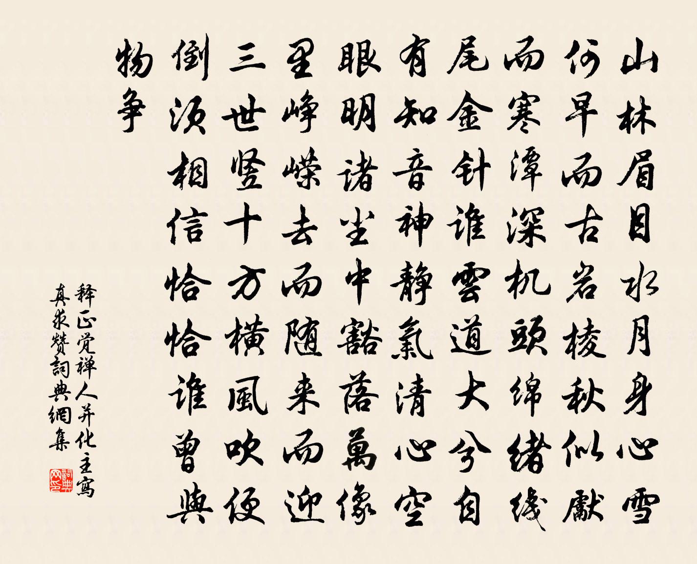 詩詞名句歷史字典書法欣賞書法字典國語詞典說文解字康熙字典古漢語字典標 題 作 者 詩 句 禪人並化主寫真求贊作者:釋正覺 朝代:宋代禪人並化主寫真求贊原文山林眉目,水月身心。雪何早而古岩棱,秋似先而寒潭深。機頭綿緒,線尾金針。誰雲道大兮自有知音。神靜氣清,心空眼明。諸塵中豁落,萬像里崢嶸。去而隨,來而迎。三世豎,十方橫。風吹便倒須相信,恰恰誰曾與物爭。詩詞問答問:禪人並化主寫真求贊的作者是誰?答:釋正覺問:禪人並化主寫真求贊寫於哪個朝代?答:宋代釋正覺禪人並化主寫真求贊書法欣賞禪人並化主寫真求贊書法作品詩詞推薦句釋曉瑩〔宋代〕倚欄喔五字。聞司空侍郎訃音徐夤〔唐代〕園綺生雖逢漢室,巢由死不謁堯階。夫君歿去何人葬,合取夷齊隱處埋。同潘屯田冬日早朝張文琮〔唐代〕假寐懷古人,夙興瞻曉月。通晨禁門啟,冠蓋趨朝謁。霜靄清九衢,霞光照雙闕。紛綸文物紀,煥爛聲明發。腰劍雜詩·其八陶淵明〔魏晉〕代耕本非望,所業在田桑。躬親未曾替,寒餒常糟糠。豈期過滿腹,但願飽粳糧。御冬足大布,粗絺已應陽。正爾秋懷陸游〔宋代〕少時本願守墳墓,讀書射獵畢此生。斷蓬遇風不自覺,偶入戎幙從西征。朝看十萬閱武罷,暮馳三百巡邊行。馬蹄玉樓春王安中〔宋代〕秋鴻只向秦箏住。終寄青樓書不去。手因春夢有攜時,眼到花開無著處。泥金小字蠻箋句。淚濕殘妝今在否。欲尋寄李子粲王冕〔元代〕白頭自笑潛夫拙,卻憶風流李謫仙。對客每言齊物論,移家只有廣文氈。赤雞白狗看兒戲,綠水青山作畫傳。慷慨雙荷葉/憶秦娥蘇軾〔宋代〕雙溪月。清光遍照雙荷葉。雙荷葉。紅心未偶,綠衣偷結。背風迎雨流珠滑。輕舟短棹先秋折。先秋折。煙鬟未上次韻蘇粹之發乾見贈二首李彌遜〔宋代〕漂泊音書斷,艱難會合遲。那知休老地,卻數別君時。歲晚商山寂,天寒夢水悲。無言一杯酒,懷抱各相知。跋蘇養直絕句後張元乾〔宋代〕後湖醉臥已仙去,但有言句留人間。文採風流照千古,羅浮誰復遺金丹。次德茂湖中韻李流謙〔宋代〕秋風早已來吹人,朝數暮數唯歸程。白湖粘天行未了,單舸夜泊令人驚。更闌剪燭共愁語,酒醒彈鋏為商聲。篙兒贈副戎南卓〔唐代〕翱翔曾在玉京天,墮落江南路幾千。從事不須輕縣宰,滿身猶帶御爐煙。金縷曲(送五峰歸九江)劉辰翁〔宋代〕世事如何說。似舉鞍、回頭笑問,并州兒葛。手障塵埃黃花路,千里龍沙如雪。著破帽、蕭蕭餘發。行過故人柴桑浣溪沙韋莊〔唐代〕惆悵夢余山月斜,孤燈照壁背窗紗,小樓高閣謝娘家。暗想玉容何所似,一枝春雪凍梅花,滿身香霧簇朝霞。故僕射司馬文正公輓詞四張耒〔宋代〕黼座方恭點,邦家付老臣。頌歌民一口,形勢國千鈞。富庶新田裡,忠臣舊搢紳裴公恨不早,丘禱嘆無神。初冬快晴陪宣卿叔夏遊石頭庵過三生藏窮深極胡寅〔宋代〕游梁屐齒破蒼苔,深沼筇枝駭蟄雷。如海亂山爭起伏,碧波直欲撼蓬萊。和寄樂天白居易〔唐代〕賢愚帶類相交,帶人情之大帶率。然自古今來,幾人號膠帶。近聞屈指數,元某與白乙。旁愛及弟兄,中歡避家室送德光禪師(重禮石霜長者)曹松〔唐代〕天涯緣事了,又造石霜微。不以千峰險,唯將獨影歸。有為嫌假佛,無境是真機。到後流沙錫,何時更有飛。酬劉谷除夜見寄李郢〔唐代〕坐恐三更至,流年此夜分。客心無限事,愁雨不堪聞。灞上家殊遠,爐前酒暫醺。劉郎亦多恨,詩憶故山雲。次韻賀邱國鎮致仕林光朝〔宋代〕桃花流水是家鄉,洛下才名四十強。自有赤松堪辟穀,那能白首更為郎。案頭貝葉忘言久,江上蓴羹引興長。解後名句推薦簫鼓追隨春社近,衣冠簡樸古風存。陸游《游山西村》 和氣吹綠野,梅雨灑芳田。李世民《詠雨》 地冷葉先盡,谷寒雲不行。李白《冬日歸舊山》 過春風十里,盡薺麥青青。姜夔《揚州慢·淮左名都》 山上層層桃李花,雲間煙火是人家。劉禹錫《竹枝詞九首·其九》 萬物靜觀皆自得,四時佳興與人同。程顥《秋日》 春來秋去相思在,秋去春來信息稀。魚玄機《閨怨》 江上往來人,但愛鱸魚美范仲淹《江上漁者》 生民之本,要當稼稽而食,桑麻以衣。顏之推《顏氏家訓·治家篇》 鳥雀不知郊野好,穿花翻戀小庭中。高珩《春日雜詠》