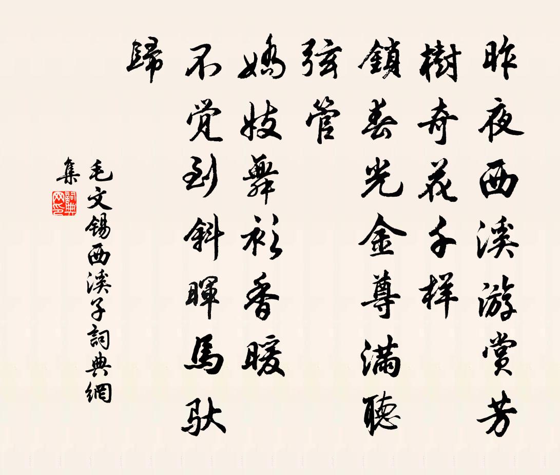 詩詞名句歷史字典書法欣賞書法字典國語詞典說文解字康熙字典古漢語字典標 題 作 者 詩 句 西溪子作者:毛文錫 朝代:唐代西溪子原文昨夜西溪游賞,芳樹奇花千樣。鎖春光,金尊滿,聽弦管。嬌妓舞衫香暖。不覺到斜暉,馬馱歸。詩詞問答問:西溪子的作者是誰?答:毛文錫問:西溪子寫於哪個朝代?答:唐代問:西溪子是什麼體裁?答:詞毛文錫西溪子書法欣賞西溪子書法作品注釋全唐詩:卷893-1詩詞推薦詠晴趙蕃〔宋代〕敗屋兩三間,隨僧且住山。詩無一朝廢,官有十年閒。日上花明野,雞啼門掩關。春風從草草,老態已斑斑。徐夕留子上、伯玉、子西小酌楊萬里〔宋代〕諸弟山行皈意忙,老夫雪臥病身僵。維風及雨歲雲暮,不醉無皈夜未央。五醆更攙三醆麽,四更偏覺五更長。也知出遲吳融〔唐代〕園密花藏易,樓深月到難。酒虛留客盡,燈暗遠更殘。麝想眉間印,鴉知頂上盤。文王之囿小,莫惜借人看。水調歌頭·送楊民瞻辛棄疾〔宋代〕日月如磨蟻,萬事且浮休。君看檐外江水,滾滾自東流。風雨瓢泉夜半,花草雪樓春到,老子已菟裘。歲晚問無恙夜坐月感施樞〔宋代〕不為名所累,應是得安居。客夢方知幻,身謀反似疏。風高秋塞遠,雨急夜窗虛。猶望收來效,頻翻舊讀書。還華賢良九經說賢良進卷語林等葉適〔宋代〕華君官五世,人物朴而重。窮經不辭難,著論何其勇。編排過百帙,裝庋高一冢。見聞頗驚訕,吟玩自欣悚。余本春日暄甚戲作陸游〔宋代〕桃杏酣酣蜂蝶狂,兒童相喚踏春陽。老人自笑還多事,預恐明朝雨壞牆。聽宮鶯王維〔唐代〕春樹繞宮牆,宮鶯囀曙光。忽驚啼暫斷,移處弄還長。隱葉棲承露,攀花出未央。遊人未應返,為此始思鄉。真珠簾(近雅軒即事)張炎〔宋代〕雲深別有深庭宇。小簾櫳、占取芳菲多處。花暗水房春,潤幾番酥雨。見說蘇堤晴未穩,便懶趁、踏青人去。休去贈劉藍田王維〔唐代〕〔一作盧象詩〕籬間(一作中)犬迎吠。出屋候荊(一作柴)扉。歲晏輸井稅。山村人夜歸。晚田始家食。余布成別王丞僧孺詩謝朓〔南北朝〕首夏實清和。余春滿郊甸。花樹雜為錦。月池皎如練。如何當此時。別離言與宴。留雜已鬱紆。行舟亦遙衍。非君送雲棲院作偈與住山琛老禪釋正覺〔宋代〕紫霄峰頂金浮屠,風鈴揚音鬧蒼虛。玉欄中地穩行道,雲磴下林新葺廬。江山懷抱富不惡,霜月軒窗清有餘。老眼峽客行陸龜蒙〔唐代〕萬仞峰排千劍束,孤舟夜系峰頭宿。蠻溪雪壞蜀江傾,灩澦朝來大如屋。兵間曾鞏〔宋代〕大義缺絕久未圖,小人輕險何不至。世上固自有百為,兵間乃獨求一試。趙括敢將亦已危,李平請守那複議。吁嗟入湧泉道中程師孟〔宋代〕告老清朝分自安,從今榮悴不相關。有愁方見田家樂,無事才知釣叟閒。世故要看終始後,人生未免是非間。婦憤正月庚申朔樓鑰〔宋代〕春來節物一番新,今歲仍逢臘里春。莫訝連宵清不寐,只緣守歲守庚申。楊公懿得潁人惠糟粕分餉並遺楊叔恬梅堯臣〔宋代〕頭尾接清淮,淮魚日登網。吳蓴芼羹美,楚糟增味爽。雲誰得嘉貺,曾靡獨為享。乃知不忘義,分遺及吾黨。頌古一百二十一首釋宗杲〔宋代〕華陰山前百尺井,中有寒泉徹骨冷。誰家女子來照影,不照其餘照斜領。約客春波督參劉郎中方赴高紫微之集道間相值岳珂〔宋代〕春波堂上倚欄乾,一曲樓台晻靄間。野衲再尋行腳債,釣蓑聊寄賞心閒。燕低欲舞影翻水,鳥倦知還雲在山。匹似送桂州嚴大夫同用南字韓愈〔唐代〕蒼蒼森八桂,茲地在湘南。江作青羅帶,山如碧玉篸。戶多輸翠羽,家自種黃甘。遠勝登仙去,飛鸞不假驂。名句推薦閒來無事不從容,睡覺東窗日已紅。程顥《秋日》 那裡有鬧紅塵香車寶馬?祗不過送黃昏古木寒鴉。王磐《古蟾宮·元宵》 君似孤云何處歸,我似離群雁。周紫芝《卜運算元·席上送王彥猷》 蕭蕭遠樹疏林外,一半秋山帶夕陽。寇準《書河上亭壁》 長他人志氣,滅自己威風。張南莊《何典·第十回》 認得醉翁語,山色有無中蘇軾《水調歌頭·黃州快哉亭贈張偓佺》 卻將萬字平戎策,換得東家種樹書。辛棄疾《鷓鴣天·有客慨然談功名因追念少年時事戲作》 情由憶生,不憶故無情。房玄齡《晉書·列傳·第六十四章》 龜游蓮葉上,鳥宿蘆花里。李白《姑孰十詠》 庭前落盡梧桐,水邊開徹芙蓉。朱庭玉《天淨沙·秋》