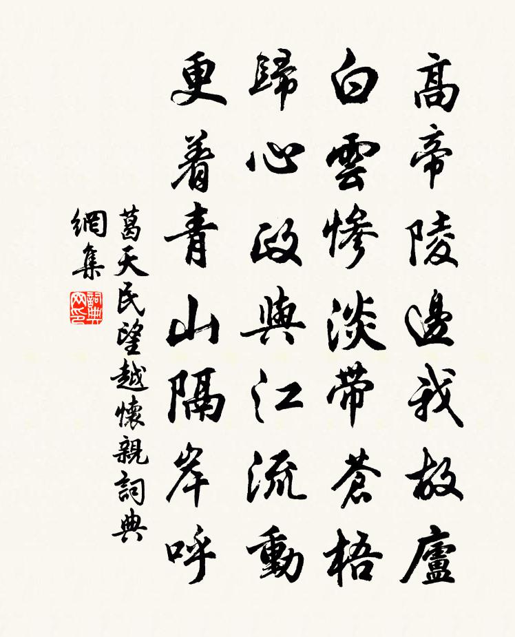 詩詞名句歷史字典書法欣賞書法字典國語詞典說文解字康熙字典古漢語字典標 題 作 者 詩 句 望越懷親作者:葛天民 朝代:宋代望越懷親原文高帝陵邊我故廬,白雲慘澹帶蒼梧。歸心政與江流動,更著青山隔岸呼。詩詞問答問:望越懷親的作者是誰?答:葛天民問:望越懷親寫於哪個朝代?答:宋代葛天民望越懷親書法欣賞望越懷親書法作品詩詞推薦安溪徐僑〔宋代〕潮回盡處曉江清,百丈灘頭舟子情。饒我靜觀黃卷罷,為渠臥看白雲輕。炫蓬滉漾龍蛇影,喧枕蕭騷風雨聲。無限慶清朝仇遠〔宋代〕山束灘聲,月移石影,寒江夜色空浮。丹青古壁,風幡橫臥東流。小艤載雲輕棹,湖痕漸落葑泥稠。津亭外,隔船早行逢故人車中為贈詩沈約〔南北朝〕殘朱猶曖曖。余粉尚霏霏。昨宵何處宿。今晨拂露歸。胡笳十八拍十八首王安石〔宋代〕青天漫漫覆長路,一紙短書無寄處。月下長吟久不歸,當時還見雁南飛。彎弓射飛無遠近,青冢路邊南雁盡。兩處赴潮陽倅陳堯佐〔宋代〕休把空言較短長,算來齊物也無妨。蠻民解唱昇平曲,願領閒愁入醉鄉。芙蓉溪送前資州裴使君歸京寧拜戶部裴侍郎薛逢〔唐代〕桑柘林枯蕎麥乾,欲分離袂百憂攢。臨溪莫話前途遠,舉酒須歌后會難。薄宦未甘霜發改,袷衣猶耐水風寒。遙知招鄰父啜菜羹陸游〔宋代〕老境遺人事,窮居砭世肓。茅檐聽雪滴,瓦鼎爇松肪。不願封侯印,惟求煮菜方。杯羹須及熱,剩欲喚君嘗。勸農和孟大監韻朱宗強〔宋代〕祥開龍角應三農,小隊旌旗獵獵風。秧馬趣行田陌外,檣烏飛送櫓聲中。穰翁預喜甌窶滿,饁婦毋憂杼軸空。觀稼壽劉宰李劉〔宋代〕制錦新城衣錦歸,種桃遺愛滿桃蹊。恩波淮水流不盡,福力螺山高與齊。天上已催班玉筍,日邊行見月璇題。歡聲應謝主簿騷體江淹〔南北朝〕山欞靜兮悲凝涼。澗軒掩兮酒涵霜。曾風激兮綠苹斷。積石閉兮紫苔傷。芝原寂少色。筠庭黯無光。沐予冠於極浦正月初四後十餘日病嗽不能出雜書十首方回〔宋代〕夏日客此樓,買冰敵炎暵。沍寒不買冰,輟費用買炭。冰炭役浮生,倏忽涼燠換。故山饒甘泉,落葉足炊爨。曷不城上李商隱〔唐代〕有客虛投筆,無憀獨上城。沙禽失侶遠,江樹著陰輕。邊遽稽天討,軍須竭地征。賈生遊刃極,作賦又論兵。頌古十五首釋慧遠〔宋代〕佛性分明脫有無,醋酸何用掛葫蘆。薄霧輕煙留不住,扁舟已過洞庭湖。納涼王維〔唐代〕喬木萬餘株。清流貫其中。前臨大川口。豁達來長風。漣漪涵白沙。素鮪如游空。偃臥盤石上。翻濤沃微躬。漱流次程平叔韻二首陳造〔宋代〕詩情對景可勝長,酒與鵝兒鬧嫩黃。忠貫主人真好事,肯來訾省沈東陽。閬州東園十詠曲池文同〔宋代〕水似珠璫入,池如玉磬開。臨流唯自適,魚鳥莫相猜。侄溥酒邊呈詩二首因次韻陳著〔宋代〕人生等是蚋蚊微,年到如今死蹉時。齏瓮余酸聊自分,蔗鄉翻苦要誰知。山川豈特雁堪唳,風雨不知雞可詩。時一朱侍郎致仕南歸上特錫宴於玉津園仍詔兩製三楊億〔宋代〕征輪軋軋出皇都,行路咨嗟賢丈夫。天子特令供祖帳,國門聊且駐驪駒。舊僚送別傾三省,御醴分甘倒百壺。下詔贈恪上人吳芾〔宋代〕上人來訪我,袖裡出佳篇。窮理通三命,知音妙七弦。不妨時對榻,聊與共談禪。一飯雖粗糲,閒中且結緣。秋思贈遠二首王涯〔唐代〕當年只自守空帷,夢裡關山覺別離。不見鄉書傳雁足,唯看新月吐蛾眉。厭攀楊柳臨清閣,閒采芙蕖傍碧潭。走馬名句推薦山上層層桃李花,雲間煙火是人家。劉禹錫《竹枝詞九首·其九》 而今識盡愁滋味,欲說還休。辛棄疾《醜奴兒·書博山道中壁》 細看茱萸一笑,詩翁健似常年。張可久《風入松·九日》 衝波突出人齊譀,躍浪爭先鳥退飛。盧肇《競渡詩 / 及第後江寧觀競渡寄袁州剌史成應元》 人珍我棄、人棄我取沈復《浮生六記·浪遊記快》 冥冥重泉哭不聞,蕭蕭暮雨人歸去。白居易《寒食野望吟》 寒山幾堵,風低削碎中原路,秋空一碧無今古。陳維崧《醉落魄·詠鷹》 背法而治,此任重道遠而無馬、牛,濟大川而無舡、楫也。商鞅《商君書·弱民》 不覺新涼似水,相思兩鬢如霜。劉辰翁《西江月·新秋寫興》 寒山吹笛喚春歸,遷客相看淚滿衣。李益《春夜聞笛》
