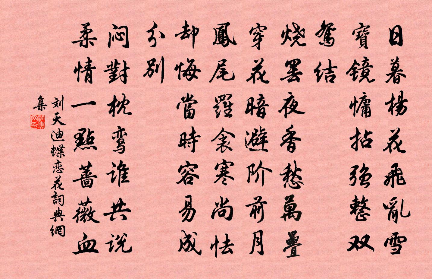 詩詞名句歷史字典書法欣賞書法字典國語詞典說文解字康熙字典古漢語字典標 題 作 者 詩 句 蝶戀花作者:劉天迪 朝代:宋代蝶戀花原文日暮楊花飛亂雪。寶鏡慵拈,強整雙鴛結。燒罷夜香愁萬疊。穿花暗避階前月。鳳尾羅衾寒尚怯,卻悔當時,容易成分別。悶對枕鸞誰共說。柔情一點薔薇血。詩詞問答問:蝶戀花的作者是誰?答:劉天迪問:蝶戀花寫於哪個朝代?答:宋代問:蝶戀花是什麼體裁?答:詞劉天迪蝶戀花書法欣賞蝶戀花書法作品詩詞推薦若邪春興皎然〔唐代〕春生若邪水,雨後漫流通。芳草行無盡,清源去不窮。野煙迷極浦,斜日起微風。數處乘流望,依稀似剡中。投壺全中戲成曾幾〔宋代〕寸心只在所投中,出手何曾一箭空。不作秋風鋪落葉,端如春草種成叢。旁觀詎敢當勍敵,俯拾無勞命短童。說與登無為冠鰲亭分韻得山字李流謙〔宋代〕岱嵩拆裂滄溟翻,驚魂去乾呼復還。故人勸我勉自寬,聖貴揚名懲毀殘。十生導師超物先,誓言一拜蠲冤煩。曉暾五泄山三學院十題西源釋鹹潤〔宋代〕造化鑿紳維,千岩斗空碧。有時雲雨開,殘陽落幽石。鹿鳴宴韓元吉〔宋代〕金殿春風策雋賢,上林孤矢更爭先。不辭老懦聊推轂,要見飛騰總著鞭。勳業肇端登鳳沼,詞章接武侍甘泉。明年水調歌頭王質〔宋代〕草蔓已多露,松竹總含風。群山左顧右盼,如虎更如龍。時見漁燈三兩,知在誰家浦漵,星斗爛垂空。萬有付一掃戲呈珉禪師周麟之〔宋代〕我來何幸識支郎,百丈峰頭寶月光。質薄自憐非燕頷,途窮誰信是龜腸。漸看鬢底千絲白,敢說眉間一點黃。坐見冬郊行望王勃〔唐代〕桂密岩花白,梨疏樹葉紅。江皋寒望盡,歸念斷征篷。贈許察院曹勛〔宋代〕海內知名第一流,詩從偉度破優柔。知公少駐摶風翼,念我都如露地牛。解臘天容先布暖,得春梅意小遲留。紅穿西江月沈端節〔宋代〕一枕香消睡惱,十年漂泊江湖。空餘清夢繞康廬。記得林間風度。錦繡谷中舊客,襟懷未肯全疏。從今不要別人扶思歸宋祁〔宋代〕心悸真摧櫓,年衰逼異糧。西征何日賦,東走向來狂。遂隔承明謁,虛稱建禮郎。去都魂黯黯,思幄淚浪浪。見{酬玉汝吳汝弌〔宋代〕日暮雲倒飛,苦雨濕茅屋。奇哉五碎金,青草眠黃犢。天行貴葆真,心骨迥凡俗。一尺 * 花,秋風播芳馥。鍾陵秋夜陳陶〔唐代〕洪崖嶺上秋月明,野客枕底章江清。蓬壺宮闕不可夢,一一入樓歸雁聲。再次韻二首陳造〔宋代〕欲轡青驄試小行,擁衾待得曉窗明。端知霽日渾無價,可信啼鳩識未萌。勝處風煙堪一醉,是家池館擅雙清。不憂乙酉歲除八絕句(選—)傅山〔清代〕縱說今宵舊歲除,未應除得舊臣荼。摩雲即有回陽雁,寄得南枝芳信無?游化感寺王維〔唐代〕翡翠香菸合,琉璃寶地平。龍宮連棟宇,虎穴傍檐楹。谷靜唯松響,山深無鳥聲。瓊峰當戶拆,金澗透林明。郢路自居剡源少遇樂歲辛巳之秋山田可擬上熟吾貧戴表元〔宋代〕中年涉事熟,欲學唾面婁。逡巡避少年,起穢不敢酬。旁人吁已甚,自喜計慮周。微勞消厚疚,淺辱勝深憂。從知從軍行二首王昌齡〔唐代〕向夕臨大荒,朔風軫歸慮。平沙萬里余,飛鳥宿何處。虜騎獵長原,翩翩傍河去。邊聲搖白草,海氣生黃霧。百戰次韻趙積中慈湖即事王之道〔宋代〕江南七月旱不雨,捲地風霾翳寰宇。夷門先生有底忙,車馬東遊亦良苦。摸魚兒(隨湖南安撫趙德修自長沙回至瀂港,值其生日)陳著〔宋代〕碧油幢、一開藩後,便思量早歸去。工夫著緊新城好,風月萬家笙鼓。游宴處。要管領春光,補種花無數。何須更名句推薦奉君金卮之美酒,玳瑁玉匣之雕琴。鮑照《擬行路難·其一》 故人不可見,新知萬里外。文天祥《端午即事》 弱柳青槐拂地垂,佳氣紅塵暗天起。盧照鄰《長安古意》 同心而離居,憂傷以終老。佚名《涉江采芙蓉》 應是夜寒凝。惱得梅花睡不成。黃升《南鄉子·冬夜》 是他春帶愁來,春歸何處。辛棄疾《祝英台近·晚春》 小樓昨夜又東風,故國不堪回首月明中。李煜《虞美人·春花秋月何時了》 扈蹕老臣身萬里,天寒來此聽江聲!陸游《龍興寺吊少陵先生寓居》 年年雪裡。常插梅花醉。李清照《清平樂·年年雪裡》 一寸丹心圖報國,兩行清淚為思親。于謙《立春日感懷》