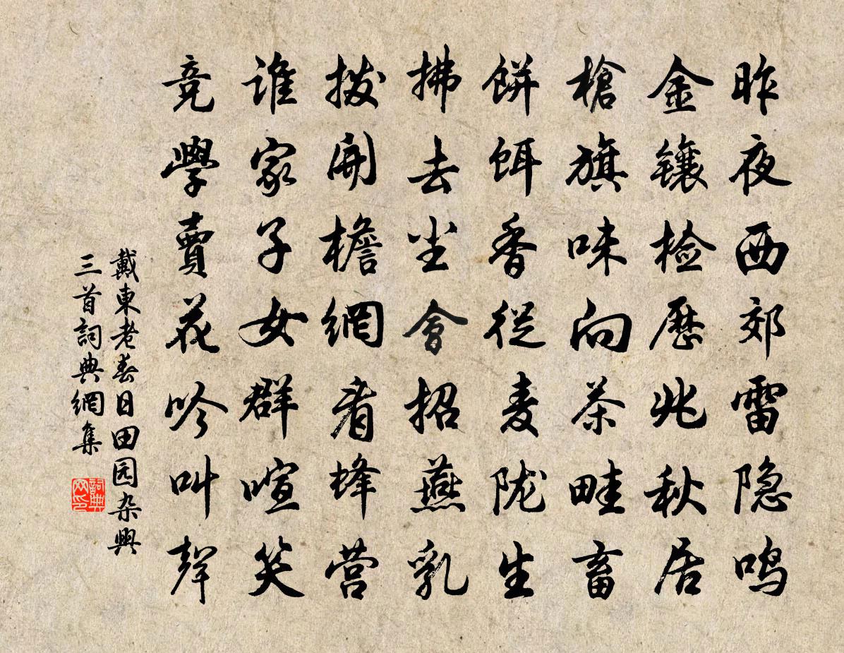 詩詞名句歷史字典書法欣賞書法字典國語詞典說文解字康熙字典古漢語字典標 題 作 者 詩 句 春日田園雜興三首作者:戴東老 朝代:宋代春日田園雜興三首原文昨夜西郊雷隱鳴,金鑲檢歷兆秋居。槍旗味向茶畦畜,餅餌香從麥隴生。拂去塵會招燕乳,撥開檐網看蜂營。誰家子女群喧笑,競學賣花吟叫聲。詩詞問答問:春日田園雜興三首的作者是誰?答:戴東老問:春日田園雜興三首寫於哪個朝代?答:宋代戴東老春日田園雜興三首書法欣賞春日田園雜興三首書法作品詩詞推薦七交七首張判官歐陽修〔宋代〕洛城車隆隆,曉門爭道入。連袂紛如帷,文者豈無十。壯矣張太素,拂羽擇其集。遠慕鄴才子,一笑懽相挹。雖有贈陳宗之鄭斯立〔宋代〕昔人躭隱約,屠酤身亦安。矧伊叢古書,枕藉於其間。讀書博詩趣,鬻書奉親歡。君能有此樂,冷淡世所難。我本有懷山房張良臣〔宋代〕每憶山房話夜深,幾前無主亦無賓。老兵未領西來意,斜倚屏風一欠伸。秋夜即事施樞〔宋代〕斷雨寒雲過暝窗,落桐葉葉是淒涼。楚山不入清宵夢,月影蛩聲滿桂薌。玉樓春周邦彥〔宋代〕桃溪不作從容住,秋藕絕來無續處。當時相侯赤闌橋,今日獨尋黃葉路。煙中列岫青無數,雁背夕陽紅欲暮。人如送友人別林尚仁〔宋代〕此心偶無事,君復敘離情。江國多寒色,春風幾日程。雪添行李重,船逐浪花輕。後夜應相憶,空山月正明。化無盡歷釋印肅〔宋代〕化城立有誰知意,普雨調和潤萬機。大根枝節全體露,何殊彌勒降生時。石兒拍掌連雲指,木女含笙和水吹。試問酹江月侯善淵〔元代〕茅庵瀟灑,靜無塵、獨坐垂簾孤僻。鎮日閒閒清澹泊,別有恬然活計。握固存真,心無雜念,忘我兼忘世。玉嬰神吟織錦人〔唐代〕學織繚綾功未多,亂拈機杼錯拋梭。莫教官錦行家見,把此文章笑殺他。然公發人自天台來不以烏藥見寄晁說之〔宋代〕石橋不得往,烏藥不寄來。空令圖畫裡,指點說天台。高宗郊祀前廟朝享太廟三十首真宗〔宋代〕威神在天,享於克誠。申以貳觴,式昭德聲。籩豆孔嘉,樂舞具陳。庶幾是聽,福祿來成。頌古五十五首釋紹曇〔宋代〕太平時節歲豐登,旅不齎糧永不扃。官路無人夜無月,唱歌歸去月三更。送友人陸肱往太原李頻〔唐代〕并州非故國,君去復尋誰。獫狁方為寇,嫖姚正用師。戍煙來自號,邊雪下無時。更想經綿上,應逢禁火期。舟發黃州連日遇逆風泊赤壁袁說友〔宋代〕赤壁磯方到,黃州路未遙。辛勤四十里,跋步兩三朝。戢戢牛羊下,閒閒鷗鷺驕。忍將今歲月,容易客中銷。句高似孫〔宋代〕風流夸老看元宵。襄陽雪夜感懷杜牧〔唐代〕往事起獨念,飄然自不勝。前灘急夜響,密雪映寒燈。的的三年夢,迢迢一線縆。明朝楚山上,莫上最高層。岳池農家陸游〔宋代〕春深農家耕未足,原頭叱叱兩黃犢,泥融無塊水初渾,雨細有痕秧正綠。綠秧分時風日美,時平未有差科起,買花寄賀建康留守范參政端明二首楊萬里〔宋代〕袞衣不是未教歸,不合威名滿四夷。天與中興開日月,帝分萬乘半旌旗。春生錦繡山河早,秋到江淮草木遲。臥護七娘子(和賀方回登月波樓)毛滂〔宋代〕月光波影寒相向。借團團、與做長壕樣。此老南樓,風流可想。殷勤冰彩隨人上。欲同次道傾家釀。有兵廚、玉盎賀新郎(上趙侍郎生日)李劉〔宋代〕鵠立通明殿。又重逢、揆余初度,夢庚華旦。不學花奴簪紅槿,且看秋香宜晚。任甲子、從新重換。天欲東都修車名句推薦痴男怨女,可憐風月債難償。曹雪芹《紅樓夢·第五回》 漠漠黃雲,濕透木棉裘。蔣捷《梅花引·荊溪阻雪》 莫避春陰上馬遲。春來未有不陰時。辛棄疾《鷓鴣天·送歐陽國瑞入吳中》 目之於色也,有同美焉。孟子《孟子·告子章句上·第七節》 何事春風容不得?和鶯吹折數枝花。王禹偁《春居雜興·兩株桃杏映籬斜》 隨風潛入夜,潤物細無聲。杜甫《春夜喜雨》 家在夢中何日到,春來江上幾人還?盧綸《長安春望》 疑人勿使,使人勿疑脫脫《金史·本紀·卷四》 君子不動而敬,不言而信。子思《中庸·第三十三章》 偶因一著錯,便為人上人。曹雪芹《紅樓夢·第二回》