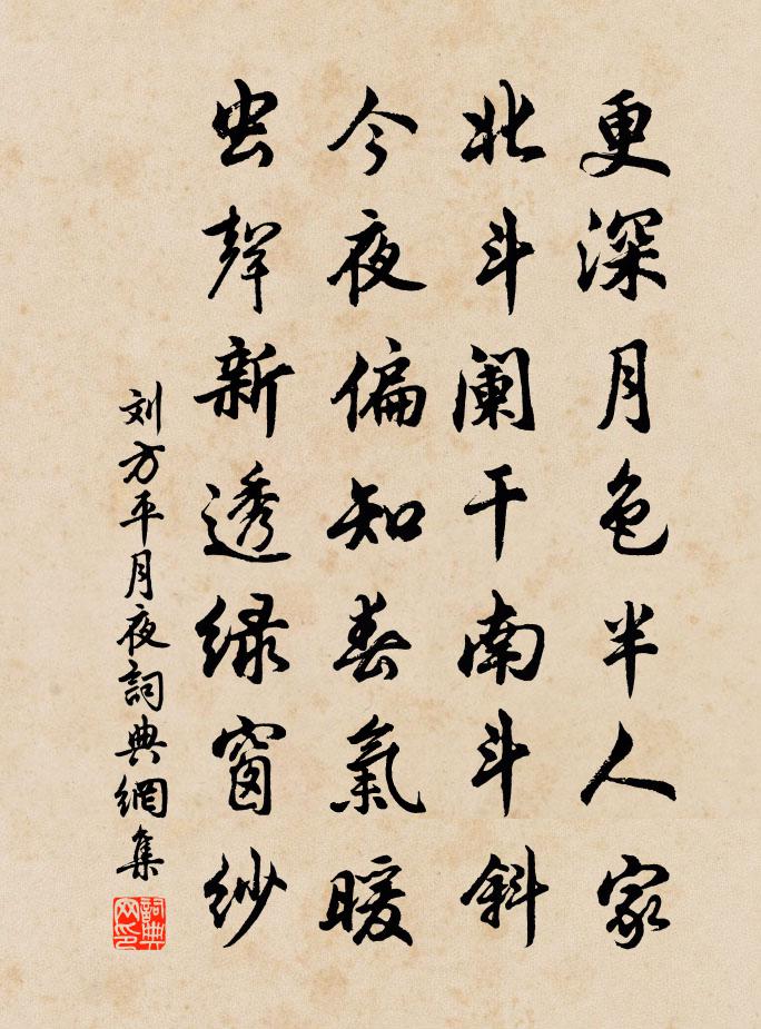 據皇甫冉說,劉方平善畫,“墨妙無前,性生筆先”(《劉方平壁畫山水》),這首詩的前兩句就頗有畫意。夜半更深,朦朧的斜月映照著家家戶戶,庭院一半沉浸在月光下,另一半則寵罩在夜的暗影中。這明暗的對比越發襯出了月夜的靜謐,空庭的闃寂。天上,北斗星和南斗星都已橫斜。這不僅進一步從視覺上點出了“更深”,而且把讀者的視野由“人家”引向寥廓的天宇,讓人感到那碧海青天之中也籠罩著一片夜的靜寂,只有一輪斜月和橫斜的北斗南斗在默默無言地暗示著時間的流逝。