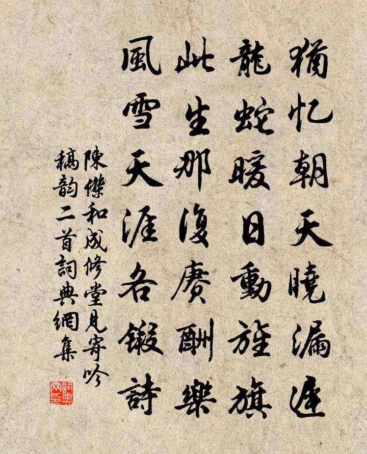 詩詞名句歷史字典書法欣賞書法字典國語詞典說文解字康熙字典古漢語字典標 題 作 者 詩 句 和成修堂見寄吟稿韻二首作者:陳杰 朝代:宋代和成修堂見寄吟稿韻二首原文猶憶朝天曉漏遲,龍蛇暖日動旌旗。此生那復賡酬樂,風雪天涯各鍛詩。詩詞問答問:和成修堂見寄吟稿韻二首的作者是誰?答:陳杰問:和成修堂見寄吟稿韻二首寫於哪個朝代?答:宋代陳杰和成修堂見寄吟稿韻二首書法欣賞和成修堂見寄吟稿韻二首書法作品詩詞推薦蓬萊客 贈門人馬鈺〔元代〕修仙急。超然一志非常客。非常客。值魔遭難,盪關沖隔。精微妙處心頭測。轉增開悟難迷溺。難迷溺。鶉居*食泛湖歸出樓中望月詩謝惠連〔南北朝〕日落泛澄瀛。星羅游輕橈。憩榭面曲汜。臨流對回潮。輟策共駢筵。並坐相招要。哀鴻鳴沙渚。悲猿響山椒。亭亭春日五首楊時〔宋代〕雨余殘日照窗明,風弄行雲點點輕。坐對庭陰人閴寂,時聞蛛網掛蟲聲。賢者之孝二百四十首原涉林同〔宋代〕所當約於已,豈忍儉其先。道立南陽表,人呼原氏阡。夜坐吟曹勛〔宋代〕空階夜滴秋宵雨,雨入芭蕉動窗戶。佳人愁絕坐幽閨,良人萬里勤征戍。勤征戍,在何處,濁酒狂歌醉朝暮。五載浪淘沙(覺度寺)韓元吉〔宋代〕席地賞殘紅。少駐孤蓬。一春不奈風和雨。雨自無情風有恨,花片西東。雲澹遠峰濃。綠遍高桐。神仙知在此山中凌雲寺李習〔唐代〕古寺臨江間碧波,石梯深入白雲窠。僧禪寂寂無人跡,滿地落花春又過。題西岩劉汲〔金代〕人愛名與利,我愛水與山。人樂紛而競,我樂靜而閒。所以西岩地,千古無人看。雖看亦不愛,雖賞亦不歡。欣然和陸伯微韻袁甫〔宋代〕皇都喜見天宇晴,好風拂掠條不鳴。幽人領袖二三子,適意涌金門外行。雲岫重重仍翼翼,舉頭不愧林間翮。賞心止戈堂張元乾〔宋代〕八州賢牧喜休兵,千騎重來竹馬迎。萬瓦連甍存比屋,十年回首賴長城。舉觴談笑精明甚,緩帶登臨步武輕。多是賀仲雨斗門陳藻〔宋代〕濯錦江邊唱絕強,孤青和者亦夔襄。歷年雖久地相遠,在寢豈止升渠堂。縱能帖石防頹岸,隨寓幽居供賞玩。何發無題徐再思〔元代〕一望二三里,煙村四五家。樓台六七座, * 十枝花。舟中醉題陸游〔宋代〕風吹蘆荻聲颼颼,晚潮入港浮孤舟。老民已掃市朝跡,造物全付江湖秋。項里廟前是魚市,禹會橋邊多酒樓。醉來水調歌頭(和彭明叔七夕)劉辰翁〔宋代〕不見古時月,何似漢時秋。朱陳村里新樣,新婦又騎牛。欲脫參前氐後,又說河邊河鼓,此會沒來由。何處設瓜果舟中元夕雨作三首楊萬里〔宋代〕此生萬事有期程,多取拋饒竟不曾。誰遣夜來南館裡,千花預借上元燈。題支山南峰僧皮日休〔唐代〕雲侵壞衲重隈肩,不下南峰不記年。池裡群魚曾受戒,林間孤鶴欲參禪。雞頭竹上開危徑,鴨腳花中擿廢泉。無限歲晚諸君送酒賦長歌以謝之李處權〔宋代〕我有經綸天下之大志,陶冶萬物之雄心。上書幾欲自藏達,君門無籍不可尋。歸來撫劍星斗近,老去援琴山水深。句利州路運〔宋代〕嘉陵橫其陰,劍門屹其陽。綠野宋江細,絕磴九隴長。黑水環禹跡,青原帶秦疆。蜀道萬里險,黎城千古荒。靈台鎮贈丘岑中丞竇庠〔唐代〕曉日天山雪半晴,紅旗遙識漢家營。近來胡騎休南牧,羊馬城邊春草生。代書寄宋州錢大監徐鉉〔唐代〕衰配經煩暑,慵將病共侵。北窗時企足,東望一披襟。秘監清罇滿,平台綠樹深。年來書信少,保以慰離心。名句推薦君子不器。孔子弟子《論語·為政篇》 忽然一夜清香發,散作乾坤萬里春。王冕《白梅》 無有定法如來可說。鳩摩羅什譯《金剛經·無得無說》 修己而不責人,則免於難。左丘明《左傳·閔公·閔公二年》 都道無人愁似我,今夜雪,有梅花,似我愁。蔣捷《梅花引·荊溪阻雪》 見一葉落,而知歲之將暮劉安及其門客《淮南子·說山訓》 猶喜閏前霜未下,菊邊依舊舞身輕。司空圖《白菊三首》 威成於禮,恃以刑,失之縱。來俊臣《羅織經·治下卷第三》 獨行獨坐,獨唱獨酬還獨臥。朱淑真《減字木蘭花·春怨》 匹馬南來渡浙河,汴城宮闕遠嵯峨。于謙《岳忠武王祠》