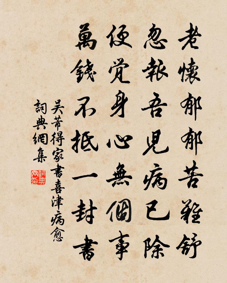 詩詞名句歷史字典書法欣賞書法字典國語詞典說文解字康熙字典古漢語字典標 題 作 者 詩 句 得家書喜津病癒作者:吳芾 朝代:宋代得家書喜津病癒原文老懷鬱郁苦難舒,忽報吾兒病已除。便覺身心無個事,萬錢不抵一封書。詩詞問答問:得家書喜津病癒的作者是誰?答:吳芾問:得家書喜津病癒寫於哪個朝代?答:宋代吳芾得家書喜津病癒書法欣賞得家書喜津病癒書法作品詩詞推薦黃鶴洞中仙 前後各喝馬一聲王哲〔元代〕趕退日中烏,捉取月中兔。便著晶光覆了身,金馬住。方是重陽做。交位顯真功,換質成真趣。到此還知自在游,靈壁驛有方公美少卿留題戲和於壁鄭剛中〔宋代〕君把使旌臨洛水,我參樞幕過潼關。秋風想見吹歸渡,先看淮南第一山。次韻和承旨侍郎宿齋太乙宮之什楊億〔宋代〕北斗城南太乙祠,羽人多著九霞衣。竹宮肅穆珠旒拜,華表飄颻鶴馭歸。繞殿步虛幢影密,登台酌獻珮聲微。質明勉諸子李呂〔宋代〕孔子昔當戹,良以桓{魑離換隹}故。韓信伏胯下,將壇起徒步。聖賢昔未遇,未免失常度。固知天地寬,出門多更漏子·本意王夫之〔清代〕斜月橫,疏星炯。不道秋宵真永。聲緩緩,滴泠泠。雙眸未易扃。 霜葉墜,幽蟲絮,薄酒何曾得醉。天下事,少聞蟬五絕句奉呈諸幕友曾豐〔宋代〕羽仙塵外學修行,未蛻那知身已輕。露里厭為無事飲,風前戲作不平鳴。搗練子王哲〔元代〕猿騎馬,呈顛傻。難擒難捉怎生舍。哩*,哩*。慧刀開,齊下殺。教君認得根源也。哩*,哩*。滿庭芳 住鐵杳山雲光洞作王處一〔元代〕俯視滄溟,屏山掩映,萬重松檜森然。金波滾滾,雲鎖翠峰巔。書對清光浩渺,更闌顯月印新鮮。圓明聚,紅霞影覽皮先輩盛制,因作十韻以寄,用伸款仰崔璐〔唐代〕河嶽挺靈異,星辰精氣殊。在人為英傑,與國作禎符。襄陽得奇士,俊邁真龍駒。勇果魯仲由,文賦蜀相如。渾浩次韻徐贊府蜚英八首方回〔宋代〕懸崖復嶺間岡坡,如此天邊遠碧何。誰道此中曾得句,道傍老樹閱人多。寓居小庵才袤丈戲作陸游〔宋代〕早衰甚畏寒,颼颼厭空館。登閣望東庵,亭亭長一繖。欣然願暫寓,竹底門可款。外看磔蝟毛,仰視覆鵠卵。席才江南弄 趙瑟曲沈約〔南北朝〕邯鄲奇弄出文梓。縈弦急調切流徵。玄鶴徘徊白雲起。白雲起。郁披香。離複合。曲未央。山中詠橘長詠陳舜俞〔宋代〕包橘古雲美,揚州地所宜。名存夏後貢,頌見楚人辭。雲夢分膏沃,璇星散陸離。洞庭仙壤接,震澤水煙被。柚酢豹李嶠〔唐代〕車法肇宗周,鼷文闡大猷。還將君子變,來蘊太公籌。委質超羊鞟,飛名列虎侯。若令逢雨露,長隱南山幽。次會再和杜范〔宋代〕古殿後多竹,虛檐前可床。炎歊於此卻,胸次要人當。自足蕭蕭意,時來細細香。曲肱無一事,閒為屬詩忙。枕上有感呈呂子約袁燮〔宋代〕俗學淺無源,澗谷才咫尺。志士務廣深,滄溟渺難測。俗子一作吏,書幾塵土積。志士雖涖官,群書玩無斁。廢書閒遊蔡沆〔宋代〕緩步荒郊外,杖藜看耨鋤。蓑衣蒙短褐,野飯摘殘苡。雨過苗花濕。雲深草樹疏。敲門無犬吠,何處覓樵漁。寄菊山陳梅〔宋代〕老發戴儒冠,黃金不愛官。江湖雙腳健,天地寸心寬。山月曉猶白,松風夏亦寒。小詩訊猿鶴,聊以慰平安。五月聞蛩有感李曾伯〔宋代〕南風先自作秋聲,蛩爾何知亦早吟。慵婦機邊重到耳,征人塞上頓驚心。索裘應解寒將晚,徹土須乘天未陰。聞此櫂歌九章寄彭鶴林白玉蟾〔宋代〕岸上酒旗舞,寒蕪生秋風。誰家六七童,手持金芙蓉。名句推薦花開堪折直須折,莫待無花空折枝。杜秋娘《金縷衣》 草木也知愁,韶華竟白頭。曹雪芹《唐多令·柳絮》 彩雲易散,皓月難圓。馮夢龍《警世通言·卷十》 眼覷著災傷教我沒是處,只落得雪滿頭顱。張養浩《一枝花·詠喜雨》 智者畏禍,愚者懼刑;言以誅人,刑之極也。來俊臣《羅織經·刑罰卷第十一》 窮巷多怪,曲學多辯。愚者之笑,智者哀焉;狂夫之樂,賢者喪焉。商鞅《商君書·更法》 明月出天山,蒼茫雲海間。李白《關山月》 記得別伊時,桃花柳萬絲。納蘭性德《菩薩蠻·新寒中酒敲窗雨》 紙灰飛作白蝴蝶,淚血染成紅杜鵑。高翥《清明日對酒》 紅臉青腰,舊識凌波女。晏幾道《蝶戀花·笑艷秋蓮生綠浦》
