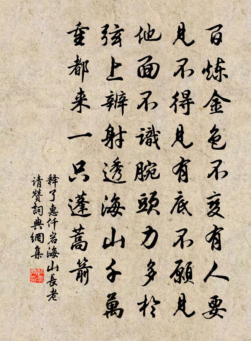 詩詞名句歷史字典書法欣賞書法字典國語詞典說文解字康熙字典古漢語字典標 題 作 者 詩 句 仟岩海山長老請贊作者:釋了惠 朝代:宋代仟岩海山長老請贊原文百鍊金色不變,有人要見不得見,有底不願見他面。不識腕頭力,多於弦上辨。射透海山千萬重,都來一隻蓬蒿箭。詩詞問答問:仟岩海山長老請贊的作者是誰?答:釋了惠問:仟岩海山長老請贊寫於哪個朝代?答:宋代釋了惠仟岩海山長老請贊書法欣賞仟岩海山長老請贊書法作品詩詞推薦春夜山居望月思故園有作張嵲〔宋代〕萬壑自清夜,春嵐昏眾星。明月麗霄漢,清風周四溟。獨立萬里外,飄然欲遐征。回首望江漢,中原氣冥冥。東北與韓侍御同尋李七舍人不遇,題壁留贈獨孤及〔唐代〕三徑何寂寂,主人山上山。亭空檐月在,水落釣磯閒。藥院雞犬靜,酒壚苔蘚班。知君少機事,當待暮雲還題高尚書夜山圖二首趙孟淳〔宋代〕江行山立月盤桓,有客無言樓上看。清興肯隨城漏盡,夜深風露恐高寒。句繆瑜〔宋代〕寒盟得問鷗。次韻盧致遠見示陳著〔宋代〕新春欲洗舊氛埃,並竹尋溪試一來。凍雨忽交疏霰下,嚴風不放寸雲開。主人雅量詩相住,老客歸心夢亦催。滑道觀魚楊萬里〔宋代〕老夫不柰熱,跣足坐瓦鼓。臨池觀游魚,定眼再三數。魚兒殊畏人,欲度不敢度。一魚試行前,似報無他故。眾魚王華僑卿所居甚隘而看山亭依浮圖之址卓然孤姜特立〔宋代〕吾憐廛市人,偪仄煙火隘。六月圍炎蒸,引吭思大噫。誰知蜂螘聚,卻躡鯨鰲背。近山羅前檐,遠岫落天外。浮圖桐廬江閣方乾〔唐代〕風煙百變無定態,緬想畫人虛損心。卷箔檻前沙鳥散,垂鉤床下錦鱗沈。白雲野寺凌晨磬,紅樹孤村遙夜砧。此地以道學諭鳳口有感詩寫物記事備極詞情不容繼張鎡〔宋代〕暖雲台觀繞歌弦,花底吹香翠鬢船。鬧處如今渾懶去,可能心緒數年前。木蘭花慢 送陳國材都目朱唏顏〔元代〕拂溪藤香潤,緘翠墨,寄深情。憶月滿簫台,春回炎海,驛騎宵征。相思頓成春夢,恰方州、接武敘前盟。愧我弓李氏園陳藻〔宋代〕開方數畝地,委曲多門牆。咫尺闤闠間,縈帶豀山傍。入巷見顏子,簞瓢想淒涼。變化若夢中,忽成摩詰莊。主人泊鴨步楊萬里〔宋代〕江流自在水風輕,雲去天來半欲晴。雨岸東西三十里,李花獨樹隔江明。忍辱仙人 春澤丘處機〔元代〕數載田苗長亢旱。今春雨雪何滋漫。嘉兆分明知過半。將來看。掀天大熟歌謳滿。二月花開成片段。千株柳發排堤夜到洛口入黃河儲光羲〔唐代〕河洲多青草,朝暮增客愁。客愁惜朝暮,枉渚暫停舟。中宵大川靜,解纜逐歸流。浦漵既清曠,沿洄非阻修。登艫江南春懷李白〔唐代〕青春幾何時,黃鳥鳴不歇。天涯失鄉路,江外老華發。心飛秦塞雲,影滯楚關月。身世殊爛漫,田園久蕪沒。歲晏昔游詩 其十三姜夔〔宋代〕既離湖口縣,未至落星灣。舟中三兩程,程程見廬山。廬山遮半天,五老云為冠。朝看金疊疊,暮看紫巉巉。瀑布古樂府文天祥〔宋代〕珊瑚香點胭脂雪,芙蓉帳壓春雲熱。明朝早弄燈前月,瀲灩九霞碧藕折。璇杓高聳婺女明,金波漾曉輝郎星。赤瓊鳳棲梧(癸未生日·五之四)張綱〔宋代〕老去光陰驚掣電。生長元豐,試數今誰健。多謝天公憐歲晚。清時乞得身閒散。憶昔生朝叨睿眷。台饋頒恩,內酒滿庭芳張耒〔宋代〕裂楮裁筠,虛明瀟灑,製成方丈屠蘇。草團蒲坐,中置一山爐。拙似春林鳩宿,易於□、秋野鶉居。誰相對,時煩絕句六十四首張伯端〔宋代〕虛心實腹義俱深,只為虛心要識心。莫若煉鉛先實腹,且教守取滿堂金。名句推薦懷家寒食夜,中酒落花天。趙長卿《臨江仙·暮春》 亦知合被才名折,二十三年折太多。白居易《醉贈劉二十八使君》 他鄉生白髮,舊國見青山。司空曙《賊平後送人北歸》 大丈夫處事,論是非,不論禍福王永彬《圍爐夜話·第二五則》 越女新妝出鏡心,自知明艷更沉吟。張籍《酬朱慶餘》 問君何能爾?心遠地自偏。陶淵明《飲酒·其五》 道人善,即是善。人知之,愈思勉。李毓秀《弟子規·泛愛眾》 順天意者,義政也;反天意者,力政也。墨子《墨子·26章 天志(上)》 誰知萬里客,懷古正躊躕。陳子昂《峴山懷古》 富潤屋,德潤身,心廣體胖曾子《禮記·大學》