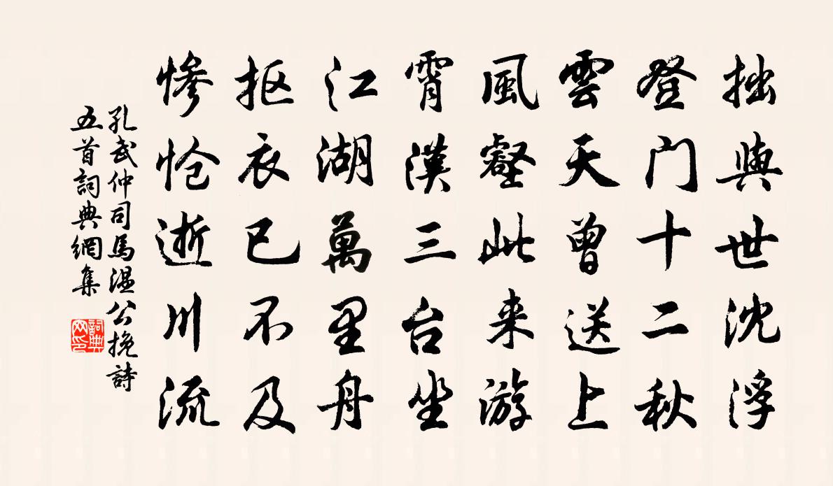 詩詞名句歷史字典書法欣賞書法字典國語詞典說文解字康熙字典古漢語字典標 題 作 者 詩 句 司馬溫公輓詩五首作者:孔武仲 朝代:宋代司馬溫公輓詩五首原文拙與世沈浮,登門十二秋。雲天曾送上,風壑此來游。霄漢三台坐,江湖萬里舟。摳衣已不及,慘愴逝川流。詩詞問答問:司馬溫公輓詩五首的作者是誰?答:孔武仲問:司馬溫公輓詩五首寫於哪個朝代?答:宋代孔武仲司馬溫公輓詩五首書法欣賞司馬溫公輓詩五首書法作品詩詞推薦書李學士北使集後梅堯臣〔宋代〕蘇武艱窮只四篇,五言風格到今傳。節旄零落都無詠,枉在胡中十九年。賀許宰伯詡再考王邁〔宋代〕宰官才具萬人豪,雞小如何下得刀。奏課再經書上上,理繁祗見辦多多。抽囊有卷牛腰重,裝橐無金馬骨高。欲賀酬王伯虎王安石〔宋代〕吾聞人之初,好惡尚無朕。帝與鑿耳目,賢愚遂殊品。爾來百千年,轉化薄愈甚。父翁相販賣,浮詐誰能審。睢盱故翰林彭學士輓歌司馬光〔宋代〕平生對交舊,萬日正如初。不復知榮賤,都能忘戚疏。遺靈瞻素幾,偽物屏塗車。家事何蕭縈,空餘萬卷書。次韻程說和許月卿〔宋代〕燈花昨夜為誰開,誰笑泉田處士來。不染一塵宜寶界,長如三月似天台。頻搖塵尾頻揮翰,每看蟾輪每舉杯。和氣出門劉駕〔唐代〕出門羨他人,奔走如得塗。翻思他人意,與我或不殊。以茲聊自安,默默行九衢。生計逐羸馬,每出似移居。客從偈頌一百三十六首釋惟一〔宋代〕天門一合,十方無路。似海之深,如山這固。如何造入,步。答陸澧張九齡〔唐代〕松葉堪為酒,春來釀幾多。不辭山路遠,踏雪也相過。第五十卷夜飲姜特立〔宋代〕風高霜挾月,酒暖夜生春。一曲清歌罷,華胥有醉人。浣溪沙顏奎〔宋代〕夢泊遊絲畫影移。水沈香宛紫煙微。玉笙才過畫樓西。天上人間花事苦,鏡中翠壓四山低。又成春過據鶯啼。宮詞宋白〔宋代〕雪鶻輕寵好六梢,五方供進內家調。靈和殿上乘颺,一點秋星印碧霄。應制賞花釣魚歐陽修〔宋代〕終闕晨霞照霧開,輕塵不動翠華來。魚游碧沼涵靈德,花馥清香薦壽杯。夢聽鈞天聲杳默,日長化國景徘徊。自◇喜李鶴田至次阮雲心韻兼寄張蘊〔宋代〕澆酒逋梅又幾回,愁吟舊雨獨登台。星星鶴語山窗曉,割得雲心古錦來。宗陽宮訪葉西莊亨宗飲尋杜南谷道堅不值留詩方回〔宋代〕我不識南谷,亦不識西莊。偶然詣仙境,一舉數十觴。南谷出何之,童子煎茗忙。柏林中有梅,不見惟聞香。周上人求語釋紹曇〔宋代〕憶昔周當仁,手握金剛杵。憤氣向南方,誓滅諸魔子。老婆驀劄點三心,走入龍潭恨轉深。掃蕩家私無一窖,胡揮頌證道歌證道歌釋印肅〔宋代〕我今解此如意珠,不論貧富灌頭舒。出沒往來無欠缺,四生六道入無餘。句釋曉瑩〔宋代〕不記登臨日幾回。田家女吳可〔宋代〕兩兩垂髫窈窕娘,含差無語蒔青身。翻思貴室千金女。笑倚紅樓抹曉妝。送趙判官趙師秀〔宋代〕三歲連華幕,何曾仕者同。開牆通野客,分樹借江鴻。與世如無味,於民自有功。神仙今已近,不畏引帆風。重贈徐天隱黃庭堅〔宋代〕建極臨萬邦,稽古陛下聖。除書日日下,有耳家相慶。滿意見昇平,父老扶杖聽。平生所傳聞,似仁祖德性。定鼎名句推薦蓄恩不倦,以一取萬。黃石公《三略·上略》 東風灑雨露,會入天地春。李白《送郄昂謫巴中》 市,朝則滿,夕則虛,非朝愛市而夕憎之也,求存故往,亡故去。劉向《戰國策·齊四·孟嘗君逐於齊而復反》 蟬鳴空桑林,八月蕭關道。王昌齡《塞下曲四首》 傍鄰聞者多嘆息,遠客思鄉皆淚垂。李頎《聽安萬善吹觱篥歌》 成事享其功,敗事委其過,且聖人弗能逾者,概人之本然也。來俊臣《羅織經·閱人卷第一》 易挑錦婦機中字。難得玉人心下事。劉克莊《玉樓春·戲林推》 自知者英,自勝者雄。王通《中說·卷四·事君篇》 月華如練,長是人千里。范仲淹《御街行·秋日懷舊》 岸邊兩兩三三,浣沙游女。柳永《夜半樂·凍雲黯淡天氣》