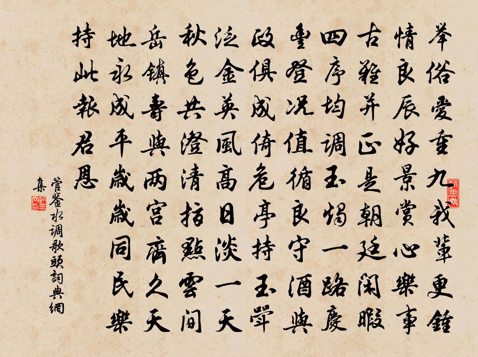 詩詞名句歷史字典書法欣賞書法字典國語詞典說文解字康熙字典古漢語字典標 題 作 者 詩 句 水調歌頭作者:管鑒 朝代:宋代水調歌頭原文舉俗愛重九,我輩更鐘情。良辰好景,賞心樂事古難並。正是朝廷閒暇,四序均調玉燭,一路慶豐登。況值循良守,酒與政俱成。倚危亭,持玉斝,泛金英。風高日淡,一天秋色共澄清。指點雲間岳鎮,壽與兩宮齊久,天地永成平。歲歲同民樂,持此報君恩。詩詞問答問:水調歌頭的作者是誰?答:管鑒問:水調歌頭寫於哪個朝代?答:宋代管鑒水調歌頭書法欣賞水調歌頭書法作品詩詞推薦送陳宗諭進叔晉接赴慶元添卒及乃弟泰來四首王邁〔宋代〕玉季吾心友,經行話舊遊。定知龍有種,又快鶚橫秋。對策空丹臆,為兄賽一籌。功名相迫遂只許片時留。南歌子(和章潮洲二首)劉子翬〔宋代〕卜夜容三獻,微歡極一時。風流太守未龐眉。放出筆頭光焰、壓金閨。藻麗花駢蕊,清高雪亞枝。曼聲恰與貫珠宜挽成峨峰牟巘五〔宋代〕吾叔聯姻好,當年記漢嘉。回頭一甲子,遺恨滿天涯。尚喜長庚老,俄聞大耋嗟。區區論疇昔,何處挹蜚霞。學詩陳普〔宋代〕先知老嫩辨精粗,又識寒酸與富腴。要落前人舊窠臼,也須作我大規模。英豪好是不緣酒,妥帖豈須由捻須。最好挽張全真詩二首張嵲〔宋代〕玉質清臞似列仙,人間亦合得長年。功名不竟如壺遂,沖淡空嗟似樂天。胡不憗遺緣國老,憂深殄瘁為時賢。含毫子產論政寬猛左丘明〔先秦〕鄭子產有疾。謂子大叔曰:“我死,子必為政。唯有德者能以寬服民,其次莫如猛。夫火烈,民望而畏之,故鮮死水調歌頭(和鄭舜舉蔗庵韻)辛棄疾〔宋代〕萬事到白髮,日月幾西東。羊腸九折歧路,老我慣經從。竹樹前溪風月,雞酒東家父老,一笑偶相逢。此樂竟誰覺東關陸游〔宋代〕路入東關物象奇,角巾老子曳筇枝。蠶如黑蟻桑生後,秧似青鍼水滿時。穿市不嫌微雨濕,過溪翻喜壞橋危。當年瀛岩薰荊楚〔宋代〕岩根商舸集高桅,岩頂朱門小殿開。未信瀛洲環弱水,始知鰲背負蓬萊。青山到海重重小,白鳥隨潮兩兩來。坐久次顏博士游紫羅洞五首李若水〔宋代〕金印如斗封王侯,何如爛漫江南遊。山能不老閱今古,雲自無心忘去留。我似孤松蟠澗底,斤斧之餘流落此。輕便題王朝英歇驢圖章甫〔宋代〕天寒山路長,年荒蹇驢瘦。風松適相遭,金石方互奏。是中有佳趣,舍鞍聊杖藜。童奴難與言,得句忘吾飢。懷遠減字木蘭花(讀《神仙傳》)李綱〔宋代〕茫茫雲海。方丈蓬壺何處在。擬泛輕舟。一到金鰲背上游。瓊樓珠室。千歲蟠桃初結實。月冷風清。試倩雙成吸玉江上主人文同〔宋代〕客路逢江國,人家占畫圖。青林隨遠岸,白水滿平湖。魚小猶論尺,鷗輕欲問銖。何時遂休去,來此伴潛夫。春集僧舍一首蘇籀〔宋代〕繡川藻野炫嫣姝,練縞穠殷亭育爐。二月峭寒輕抑勒,崇朝和氣畢昭蘇。紺青六幕無纖翳,綠縟多疇幾町區。居士句石延年〔宋代〕月如無恨月長圓。酬王判官和九日韻陳傅良〔宋代〕想懸郴桂一雲泥,夫子聲名正日躋。乞與早移河內粟,牙牌歸聽報班齊。送王西樞出鎮鄭圃八首之八賀鑄〔宋代〕袞繡行將復,沙堤百里東。病夫雖老矣,猶解賦豳風。題陳主管東牆三峴圖陳造〔宋代〕堂上不合得楓起煙霧,牆間江山更疑誤。千岩萬壑眩明滅,暖翠浮嵐滿窗戶。峴山鼎列屹相望,發地撐空鶱欲翔。陸墓寺万俟紹之〔宋代〕距城才五里,野景自蕭然。塘水清環寺,窰煙黑翳天。市多沽酒旅,橋列賣魚船。欲酹宣公冢,淵陵幾變遷。始覺楊冠卿〔宋代〕始覺躬耕晚,從誰話此情。但能安食息,敢復計聲名。留滯煩書信,驅馳愧友生。有懷愁不盡,歸鳥暮雲橫。名句推薦歲不寒無以知松柏,事不難無以知君子荀子《荀子·大略》 藍橋何處覓雲英。只有多情流水、伴人行。蘇軾《南歌子·寓意》 送客自傷身易老,不知何處待先生。劉滄《贈道者》 不鏡於水,而鏡於人,則吉凶可鑑也王永彬《圍爐夜話·第五二則》 以天下之所順,攻親戚之所畔;故君子有不戰,戰必勝矣。孟子《孟子·公孫丑章句下·第一節》 隱隱飛橋隔野煙,石磯西畔問漁船。張旭《桃花溪》 蜃散雲收破樓閣,虹殘水照斷橋粱。白居易《江樓晚眺景物鮮奇吟玩成篇寄水部張員外》 天外黑風吹海立,浙東飛雨過江來。蘇軾《有美堂暴雨》 義膽包天,忠肝蓋地,四海無人識。施耐庵《念奴嬌·天南地北》 淇則有岸,隰則有泮。佚名《氓》