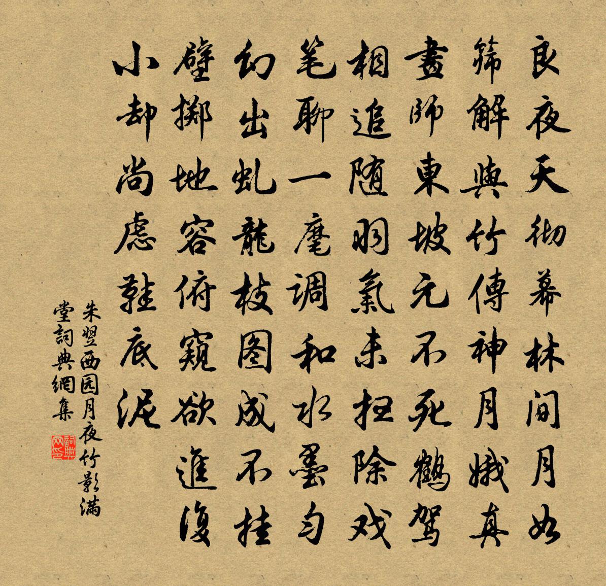 詩詞名句歷史字典書法欣賞書法字典國語詞典說文解字康熙字典古漢語字典標 題 作 者 詩 句 西園月夜竹影滿堂作者:朱翌 朝代:宋代西園月夜竹影滿堂原文良夜天徹幕,林間月如篩。解與竹傳神,月娥真畫師。東坡元不死,鶴駕相追隨。羽氣未掃除,戲筆聊一麾。調和水墨勻,幻出虬龍枝。圖成不掛壁,擲地容俯窺。欲進復小卻,尚慮鞋底泥。詩詞問答問:西園月夜竹影滿堂的作者是誰?答:朱翌問:西園月夜竹影滿堂寫於哪個朝代?答:宋代朱翌西園月夜竹影滿堂書法欣賞西園月夜竹影滿堂書法作品詩詞推薦禪宗無門關總頌釋慧開〔宋代〕大道無門,千羞有路。透得此關,乾坤獨步。南歌子姚述堯〔宋代〕素節秋強半,嘉名久最宜。霜風簌簌下天涯。幸有佳朋、何惜共登危。月窟諸仙子,天宮兩白眉。相逢不醉定無歸制置侍郎閣學台座俯從鄉論營求勝地改建貢闈度正〔宋代〕皇家科目釣英豪,手大方能得巨鰲。考論勛庸推虎榜,講求師友自鸞刀。泉翁竟被盲夫棄,雲叟空勞聖主褒。細看寄陳正已曾極〔宋代〕扊扅深閉斷經過,倒摺塵編且臥痾。九十日春晴景少,一千年事亂時多。吟成楚些翻愁絕,鬢染吳霜奈第何。心鐵玉漏遲·詠懷元好問〔金代〕淅江歸路杳,西南卻羨、投林高鳥。升斗微官,世累苦相縈繞。不似麒麟殿里,又不與、巢由同調。時自笑,虛名春日雜興胡仲弓〔宋代〕南岡北嶺對窗扉,看盡朝嵐與夕暉。社後未曾聞燕語,雨中誰不惜花飛。山醅約莫幾日熟,沙筍輪囷一尺圍。莫怨浣溪沙張綱〔宋代〕臘日銀罌翠管新。潘輿迎臘慶生辰。捲簾花簇錦堂春。百和寶薰籠瑞霧,一聲珠唱駐行雲。流霞深勸莫辭頻。謝寇員外準見示詩卷潘閬〔宋代〕一軸新詩意轉深,幾回看了又重尋。最憐積水浮秋漢,閒望滄溟盡日吟。鶯鳴十章寄戚伯瑞彭龜年〔宋代〕春花粲兮,兩山之間。誰與我適,觴詠以還。黍苗佚名〔先秦〕芃芃黍苗,陰雨膏之。悠悠南行,召伯勞之。我任我輦,我車我牛。我行既集,蓋雲歸哉。我徒我御,我師我旅。寄弟張喬〔唐代〕故里行人戰後疏,青崖萍寄白雲居。那堪又是傷春日,把得長安落第書。戲贈姬人(一作張祜與杜牧聯句詩)李群玉〔唐代〕骰子巡拋裹手拈,無因得見玉纖纖。但知謔道金釵落,圖向人前露指尖。聞鳩有感趙蕃〔宋代〕可憐鳩拙安無棲,雨來逐婦晴呼歸。我行願晴不願雨,憂樂殆與鳩同機。長安通衢多顯位,長江大艑謀崇利。我圖台山雜吟元好問〔金代〕山雲吞吐翠微中,淡綠深青一萬重,此景只應天上有,豈知身在妙高峰。送僧歸姑蘇釋智圓〔宋代〕姑蘇台畔樹含秋,蟬噪西風雨乍收。閒笑閒吟忽歸去,月明何處宿孤舟。石湖山居顧逢〔宋代〕越來溪上望,雨漲一篙深。折葦眠枯葉,老蓮生苦心。水連孤嶼遠,山入半湖陰。喜近行春路,時於月下吟。炊米繼戲作陸游〔宋代〕敢羨晨興費萬錢,口邊縱理信前緣。高年雖獲殿諸老,一飽常如登九天。架上有書吾已矣,甑中無飯亦陶然。蓬門余石月輓詞周必大〔宋代〕自我居洪府,從公父子游。至言今在耳,往事忍回頭。風急唐山壟,雲埋石月樓。生芻無路奠,灑淚寄東流。留別上元夫人〔唐代〕蕭郎不顧鳳樓人,雲澀回車淚臉新。愁想蓬瀛歸去路,難窺舊苑碧桃春。踏莎行王以寧〔宋代〕位正三槐,光生九族。人間一夢黃粱熟。邇來荊楚地行仙,卜居深在延原北。笑問從前,誰調玉燭。當筵鮑老那能名句推薦又似賈客蜀道間,千鐸萬磬鳴空山牛殳《琵琶行》 一朝春盡紅顏老,花落人亡兩不知。曹雪芹《紅樓夢·第二十七回》 昭昭若日月之明,離離如星辰之行劉勰《文心雕龍·宗經》 兒童散學歸來早,忙趁東風放紙鳶。高鼎《村居》 棄捐勿復道,努力加餐飯。佚名《行行重行行》 曾經滄海難為水,除卻巫山不是雲。元稹《離思五首·其四》 望雲慚高鳥,臨水愧游魚。陶淵明《始作鎮軍參軍經曲阿作》 遙想獨游佳味少,無方騅馬但鳴嘶。蘇轍《懷澠池寄子瞻兄》 八年十二月,五日雪紛紛。白居易《村居苦寒》 柳色參差掩畫樓,曉鶯啼送滿宮愁。司馬扎《宮怨 / 閨怨》