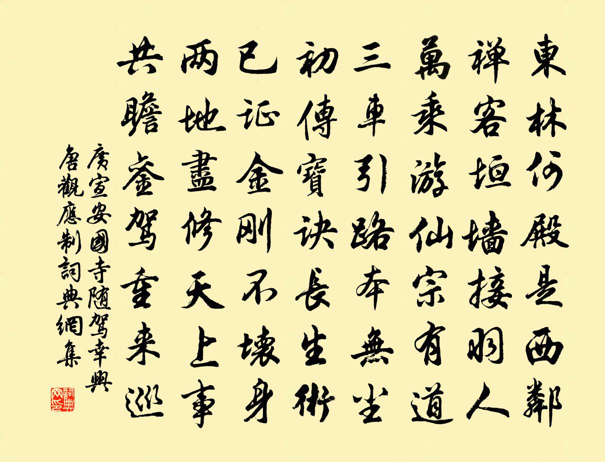 詩詞名句歷史字典書法欣賞書法字典國語詞典說文解字康熙字典古漢語字典標 題 作 者 詩 句 安國寺隨駕幸興唐觀應制作者:廣宣 朝代:唐代安國寺隨駕幸興唐觀應制原文東林何殿是西鄰,禪客垣牆接羽人。萬乘遊仙宗有道,三車引路本無塵。初傳寶訣長生術,已證金剛不壞身。兩地盡修天上事,共瞻鑾駕重來巡。詩詞問答問:安國寺隨駕幸興唐觀應制的作者是誰?答:廣宣問:安國寺隨駕幸興唐觀應制寫於哪個朝代?答:唐代問:安國寺隨駕幸興唐觀應制是什麼體裁?答:七律廣宣安國寺隨駕幸興唐觀應制書法欣賞安國寺隨駕幸興唐觀應制書法作品注釋全唐詩:卷822-10詩詞推薦嘉定庚辰正月二日楊尚書率同年團拜於西湖之崔與之〔宋代〕雪裡同騎白玉鰲,湖山人物一時高。銀潢下瀉波千頃,寶鑑帝開水半篙。我欲乘風驚老大,誰將翦水戲兒曹。梅花紅窗迥王哲〔元代〕到明年,大豐熟。這嶮巘心中,全然不燭。越越底,劫劫波波,貪名利逮逮。地變黃金由未足。因何卻不種、來生宣州雜詩二十首梅堯臣〔宋代〕諸葛久精妙,已能聞國都。紫毫搜老兔,蒼鼠拔長須。露筦何明淨,煙丸事染濡。班超投此去,死作玉關夫。王子晉廟白居易〔唐代〕子晉廟前山月明,人聞往往夜吹笙。鸞吟鳳唱聽無拍,多似霓裳散序聲。寄行宮監門王以通釋永頤〔宋代〕玉鉤簾外前朝柳,斬鴨闌邊小艷葩。莫道君王不曾問,好收銀鑰護宮花。戲題郡齋水墨坐屏二首楊萬里〔宋代〕兩客呼船一急行,樹林半落半猶青。諸峰最是中峰好我,欲峰頭築小亭。題胡逸老致虛庵黃庭堅〔宋代〕藏書萬卷可教子,遺金滿籯常作災。能與貧人共年穀,必有明月生蚌胎。山隨宴坐圖畫出,水作夜窗風雨來。觀水送鄭吏部出使二首曹勛〔宋代〕聖主東南眷念勞。繡衣行部輟名曹。喜尋物外人多竺,應遇山中相有陶。丹筆不搖吟筆健,頹風頓革古風高。如何種竹嘆。向在成都,種竹滿西園,偶苦寒疾朅范成大〔宋代〕宣華種萬竿,寒疾適相值。玉麟種千竿,偶復須藥餌。僮奴狃今昨,競道竹相祟。如將聖作狂,似以儒為戲。此君會友王冕〔元代〕昨夜朔風吹地動,起看長劍雪花明。讀書空墮英雄淚,得酒時澆磊塊情。相見抵須言客況,論交殊不愧前盟。漢家周五聲調曲 商調曲 一庾信〔南北朝〕君以宮唱。寬大而謨明。臣以商應。聞義則可行。有熊為政。訪道於容成。殷湯受命。委任於阿衡。忠其敬事。有田舍即事十首劉克莊〔宋代〕事國嘗陳力,明農晚乞骸。擊鮮兒勿費,執醬老難偕。僅可從沮溺,安能望賜回。幾曾識奇字,門外客休來。寄題求志堂陸游〔宋代〕古人不輕出,出則堯舜其君民;古人不輕隱,隱則坐使風俗淳。孰知後世乃不然,唐虞日遠如飛煙,異端欲出六籍浦中夜泊白居易〔唐代〕暗上江堤還獨立,水風霜氣夜稜稜。回看深浦停舟處,蘆荻花中一點燈。柄生日鄒浩〔宋代〕 * 中見老人,禪光垂照喜生春。身如龜鶴心如石,進德功夫常日新。驀山溪(村中閒作)馮時行〔宋代〕艱難時世。萬事休夸會。官宦誤人多,道是也、終須不是。功名事業,已是負初心,人老也,發白也,隨分謀生計補茅鴟(茅鴟四章,章八句)丘光庭〔唐代〕茅鴟茅鴟,無集我岡。汝食汝飽,莫我為祥。願彈去汝,來彼鳳凰。來彼鳳凰,其儀有章。茅鴟茅鴟,無啄我雀。太常引 如蘇台觀雪張可久〔元代〕斷塘流水洗凝脂。早起索吟詩。何處覓西施。垂楊柳、蕭蕭鬢絲。銀匙藻井,粉香梅譜,萬瓦玉參差。一曲樂天詞和袁望回王之道〔宋代〕千古風流憶孔明,老龍高臥志存身。強陪簪紱更三聖,安坐江湖又四春。便合痴狂稱達者,誰能窮悴作騷人。一杯故致政宣義葉公輓詞韓元吉〔宋代〕植德由來不自知,成家今風聹馨兒。名駒有種能千里,仙桂騰芳定五枝。彩綬螭坳方致養,素車雲路忽興悲。死生名句推薦蓬鬢哀吟長城下,不堪秋氣入金瘡。盧綸《逢病軍人》 最喜小兒亡賴,溪頭臥剝蓮蓬。辛棄疾《清平樂·村居》 孤雁飛南遊,過庭長哀吟。曹植《雜詩六首·其一》 秋木萋萋,其葉萎黃,有鳥處山,集於苞桑。王昭君《怨詞》 衣懶換,酒難賒。可憐此夕看梅花。吳文英《思佳客·癸卯除夜》 樹木何蕭瑟,北風聲正悲。曹操《苦寒行》 金風細細。葉葉梧桐墜。晏殊《清平樂·金風細細》 冷艷全欺雪,余香乍入衣。丘為《左掖梨花》 惻隱之心,人皆有之孟子《孟子·告子章句上·第六節》 天蒼蒼,野茫茫。風吹草低見牛羊。佚名《敕勒歌》