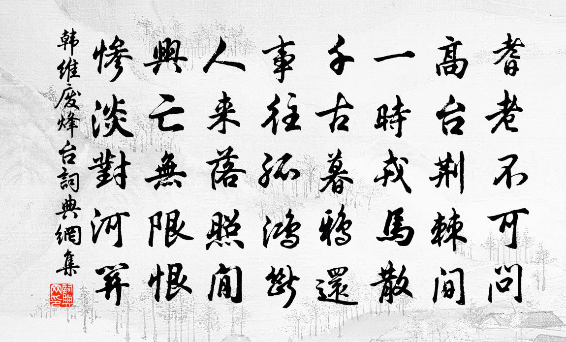 詩詞名句歷史字典書法欣賞書法字典國語詞典說文解字康熙字典古漢語字典標 題 作 者 詩 句 廢烽台作者:韓維 朝代:宋代廢烽台原文耆老不可問,高台荊棘間。一時戎馬散,千古暮鴉還。事往孤鴻斷,人來落照閒。興亡無限恨,慘澹對河關。詩詞問答問:廢烽台的作者是誰?答:韓維問:廢烽台寫於哪個朝代?答:宋代韓維廢烽台書法欣賞廢烽台書法作品詩詞推薦對月有懷吳錫疇〔宋代〕破晴斜月入簾陰,鬢影蕭騷老不禁。九十日春風與雨,百千年事後猶今。牡丹紅褪殘妝面,杜宇聲寒故國心。眼底無夢令 五更寄趙居士馬鈺〔元代〕一鼓孤眠內守。寶陸用雲耕透。密種紫芝苗,自是洞天無漏。無漏。無漏。坎虎離龍 * 。書湯兄詩卷後並呈丹陽大夫三首劉宰〔宋代〕令尹胸襟隘五湖,狂言時肯聽迂儒。未知他日翹材館,可著當年鄭介夫。石扶山喻良能〔宋代〕玲瓏怪石巧相扶,奇絕無人作畫圖。要是飛來嫡孫行,恨君生不近西湖。胡笳曲五拍文天祥〔宋代〕北庭數有關中使,飄飄遠自流沙至。胡人高鼻動成群,仍唱胡歌飲都市。中原無書歸不得,道路只今多擁隔。身欲青玉案佚名〔宋代〕紅嬌綠軟芳菲遍。正荏苒、春方半。簾幕任垂花影亂。年年此日,月娥仙子,來赴瑤池宴。綺羅暗簾成行滿。盡酌寄紫微高侍郎三首岳珂〔宋代〕力勞效寡是窮途,贈策無人生大愚。三刖尚迷藏櫝寶,六街幾誤脫巾呼。味言已轉廷中轂,歸興難忘隴上鋤。欲問續賦家園七詠萬石亭劉子翬〔宋代〕嵐光近卻無,一徑緣崖斷。危亭勢欲飛,翠石雲中亂。小山閟清游,懷人髮長嘆。次韻吳興李行中秀才見寄並求醉眠亭詩二首蘇轍〔宋代〕才堪簿領更無餘,贏得十年閒讀書。寵辱何須身自試,窮愁不待酒驅除。故人歸去無訊息,佳句新來屢卷舒。前日西湖晚歸楊萬里〔宋代〕際晚遊人也合歸,畫船猶自弄斜暉。西湖兩岸千株柳,絮不因風暖自飛。送吳中復守長沙郭獬〔宋代〕初登西漢文章府,便領吳王第一州。繞郭白雲衡岳近,滿帆明月洞庭秋。送歸江州友人初下第(一作送友人下第歸)項斯〔唐代〕名高不俟召,收采獻君門。偶屈應緣數,他人盡為冤。新春城外路,舊隱水邊村。歸去無勞久,知君更待論。姜總管輓詞樓鑰〔宋代〕及見開元盛,曾聞正始音。雕蟲徒壯歲,冠鶡豈初心。論事風生席,疏恩帶錫金。精神空滿腹,愁絕病沈沈。西江月夏元鼎〔宋代〕道,金魚要換金丹,龜齡鶴算不知年,子其勉之,當遇赤城人矣。後於祝融峰遇聖師,指迷金丹大道,果應存無守武夷一曲陳普〔宋代〕虹橋一斷幾午齡,親手文公再造成。何事遊人尚迷路,亂尋無楫渡船撐。淮西池濠石銘佚名〔唐代〕井底一竿竹,竹色深綠綠。雞未肥,酒未熟,障車兒郎且須縮。游杭州山蘇軾〔宋代〕山平村塢迷,野寺鐘相答。晚陰雲失莽,落日猶在塔。行招兩社僧,共步青山月。送客渡石橋,迎客出林樾。幽尋郊廟歌辭。梁郊祀樂章。慶隆張袞〔唐代〕恭祀上帝,於國之陽。爵醴是荷,鴻基永昌。酬王主簿示道中所作釋紹嵩〔宋代〕蓼花紅淡葦條黃,洛岸秋晴夕照長。雪羽褵褷立倒影,酒旗搖曳出篁。雲邊雁斷湖邊月,圩上人牽水上航。輸與能阮郎歸姜夔〔宋代〕旌陽宮殿昔徘徊。一壇雲葉垂。與君閒看壁間題。夜涼笙鶴期。茅店酒,壽君時。老楓臨路歧。年年強健得追隨。名句推薦百年歌自苦,未見有知音。杜甫《南征》 把吳鉤看了,欄桿拍遍,無人會,登臨意。辛棄疾《水龍吟·登建康賞心亭》 拱木不生危,松柏不生埤。左丘明《國語·晉語·醫和視平公疾》 野火燒不盡,春風吹又生。白居易《草 / 賦得古原草送別》 傷心重見,依約眉山,黛痕低壓姜夔《慶宮春·雙槳蓴波》 王者之宰民也,莫不同四海,一遠近, 為父母而子之。令狐德棻《周書·本紀·卷四》 首夏猶清和,芳草亦未歇。謝靈運《游赤石進帆海》 知我者,謂我心憂;不知我者,謂我何求。佚名《黍離》 若待明朝風雨過,人在天涯!春在天涯。虞集《南鄉一剪梅·招熊少府》 憑畫檻,雨洗秋濃人淡。厲鶚《謁金門·七月既望湖上雨後作》