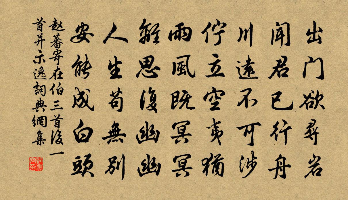 詩詞名句歷史字典書法欣賞書法字典國語詞典說文解字康熙字典古漢語字典標 題 作 者 詩 句 寄在伯三首後一首並示逸作者:趙蕃 朝代:宋代寄在伯三首後一首並示逸原文出門欲尋岩,聞君已行舟。川遠不可涉,佇立空夷猶。雨風既冥冥,離思復幽幽。人生苟無別,安能成白頭。詩詞問答問:寄在伯三首後一首並示逸的作者是誰?答:趙蕃問:寄在伯三首後一首並示逸寫於哪個朝代?答:宋代趙蕃寄在伯三首後一首並示逸書法欣賞寄在伯三首後一首並示逸書法作品詩詞推薦惜別五首程公許〔宋代〕憂患磨人鬢易皤,近來更覺別懷難。霜筠雪柏圖堅耐,願保貞心共歲寒。送建州徐生洪邁〔宋代〕人羈天地間,誰非一浮萍。泛然偶相值,便有離合情。君家武夷下,歸路塵眼明。我生愛山者,夢寐秀色橫。秋風賜丁謂宋真宗〔宋代〕懿辭碩畫播朝中,造膝詢謀禮遇豐。文石延登彰順美,高牙前導表疇庸。書生仗鉞今尤貴,舊里分符古罕逢。晝錦同顏六少府旅宦秋中之作高適〔唐代〕傳君昨夜悵然悲,獨坐新齋木落時。逸氣舊來凌燕雀,高才何得混妍媸。跡留黃綬人多嘆,心在青雲世莫知。不是【正宮】端正好_俺便似畫圖鄧玉賓〔元代〕俺便似畫圖中,幃屏上,雲遊遍林影湖光。閒中氣味三千丈,抵多少歸去來的陶元亮。 【滾繡球】想這皇帝王郊廟歌辭。武后大享拜洛樂章。又歸和武則天〔唐代〕調雲闋兮神座興,驂雲駕兮儼將升。騰絳霄兮垂景祜,翹丹懇兮荷休徵。逢謝偃高適〔唐代〕紅顏愴為別,白髮始相逢。唯餘昔時淚,無復舊時容。戲贈詹安世楊時〔宋代〕彩舟書駐閶門,書初與子相書識。長空書翥秋隼,爽氣橫八極。摛辭鏤圭璋,吐論森劍戟。鄧侯不願仕,志在書竹浣溪沙(求年例貢余香)張元乾〔宋代〕花氣薰人百和香。少陵佳句是仙方。空教蜂蝶為花忙。和露摘來輕換骨,傍懷聞處惱迴腸。去年時候入思量。送蘇八給事出牧徐州用芳韻盧僎〔唐代〕金鼎屬元方,瑣闈連季常。畏盈聊出守,分命乃維良。曉騎辭朝遠,春帆向楚常。賢哉謙自牧,天下詠餘芳。前所詠諸花皆托物以賦者爾未若眼花乃吾身之舒岳祥〔宋代〕春去花亦去,何如見此花。青山飛靄合,白日亂煙遮。望月惟昏鏡,看書似隔紗。瀟湘聞夜雨,此景屬誰家。酬蕭侍中春園聽妓(一作李元操詩)陳子良〔唐代〕微雨散芳菲,中園照落暉。紅樹搖歌扇,綠珠飄舞衣。繁弦調對酒,雜引動思歸。愁人當此夕,羞見落花飛。皇后閣春帖子許應龍〔宋代〕椒殿霞觴舉,金花拆勝鮮。年年慶佳節,眉壽祝綿延。三年宋祁〔宋代〕三年宦牒托東侯,旌盪危心斛貯愁。一命鴻毛徒許國,單身螢火若驚秋。偶作楊簡〔宋代〕當敬不敬謂之悖,當正不正謂之諛。是中適莫俱難著,意態微生已覺疏。恭和御製詩馬廷鸞〔宋代〕直廬峻在九霄高,雨露恩光切仰膏。夜炬恩濃超賜錦,春船思澀怯提鰲。日磚有影占花隱,風鐸無聲引索綯。昭代余將南歸燕趙諸公子攜妓把酒錢別醉中作把酒汪元量〔宋代〕我把酒,聽君歌。美人娟娟花灼灼,月照金樽光綽約。有酒有歌君亦愁,把酒聽歌君亦樂。我有鸚鵡杯,君有鸕鶿寄題上強山精舍寺(見王象之《輿地紀勝》)白居易〔唐代〕慣游山水住南州,行盡天台及虎丘。惟有上強精舍寺,最堪游處未曾游。水調歌頭(隱靜山觀雨)張孝祥〔宋代〕青嶂度雲氣,幽壑舞迴風。山神助我奇觀,喚起碧宵龍。電掣金蛇千丈,雷震靈鼉萬壘,洶洶欲崩空。盡瀉銀潢水冬至汪炎昶〔宋代〕草草歡娛共一觴,葭灰昨夜煦初陽。民貧絕喜冬獨煖,客倦翻嫌日漸長。造化不停聊闔癖,人情自此隔炎涼。欲占名句推薦別院深深夏席清,石榴開遍透簾明。蘇舜欽《夏意》 鳥銜野田草,誤入枯桑里。李白《樹中草》 長江後浪推前浪,世上新人趕舊人。佚名《增廣賢文·上集》 今我來思,雨雪載途。佚名《出車》 零落成泥碾作塵,只有香如故。陸游《卜運算元·詠梅》 天街小雨潤如酥,草色遙看近卻無。韓愈《早春呈水部張十八員外 / 初春小雨 / 早春》 河邊獨自看星宿,夜織天絲難接續。王建《七夕曲》 靜言庸違,像恭滔天。佚名《尚書·虞書·堯典》 梅花雪,梨花月,總相思。張惠言《相見歡·年年負卻花期》 凡事當留餘地,得意不宜再往。朱柏廬《朱子家訓·全文》