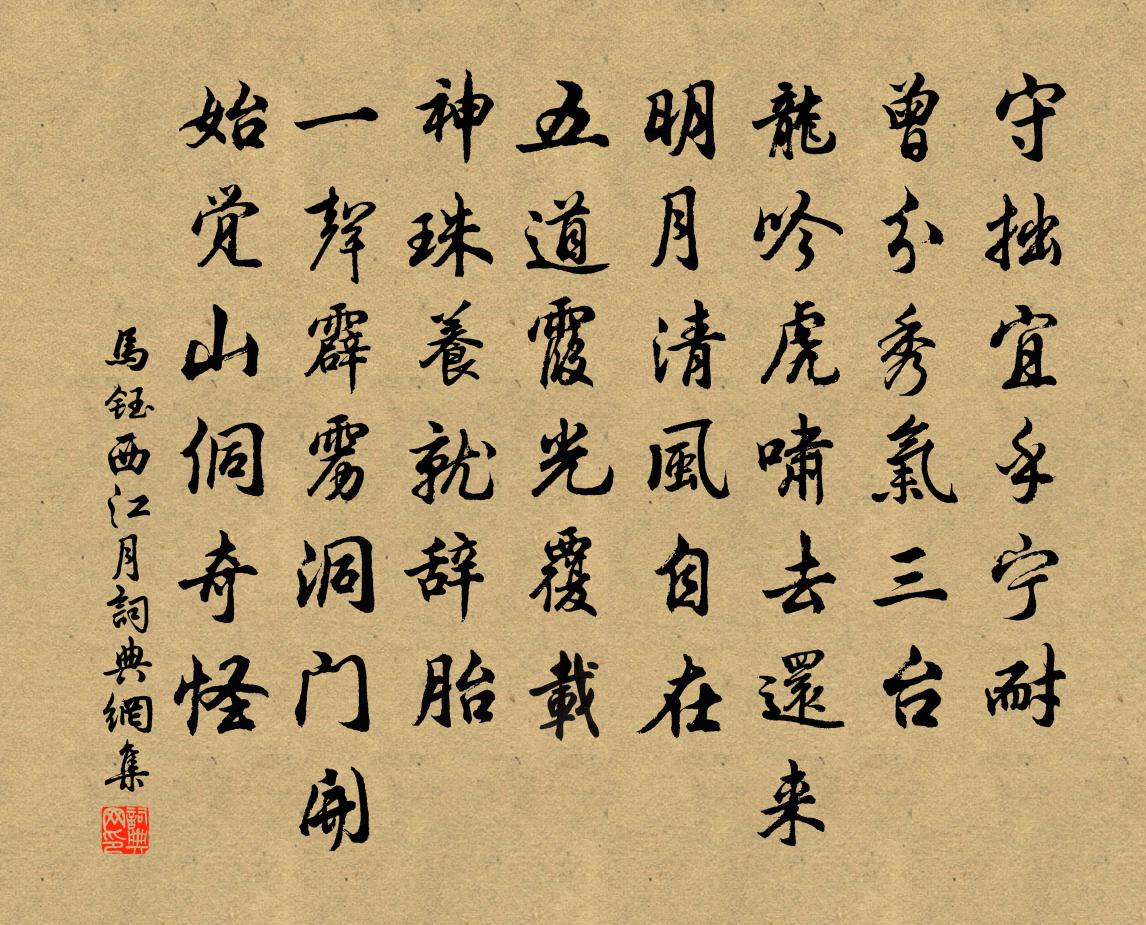 詩詞名句歷史字典書法欣賞書法字典國語詞典說文解字康熙字典古漢語字典標 題 作 者 詩 句 西江月作者:馬鈺 朝代:元代西江月原文守拙宜乎寧耐。曾分秀氣三台。龍吟虎嘯去還來。明月清風自在。五道霞光覆載。神珠養就辭胎。一聲霹靂洞門開。始覺山侗奇怪。詩詞問答問:西江月的作者是誰?答:馬鈺問:西江月寫於哪個朝代?答:元代問:西江月是什麼體裁?答:詞馬鈺西江月書法欣賞西江月書法作品詩詞推薦山礬花董嗣杲〔宋代〕萬花開遍鄭花明,風墮纖纖萼頻□。小白挼香傳七里,繁英篩雪餞三春。無言甘作凌波弟,有意端凝老子身。葉染聽箏柳中庸〔唐代〕抽弦促柱聽秦箏,無限秦人悲怨聲。似逐春風知柳態,如隨啼鳥識花情。誰家獨夜愁燈影,何處空樓思月明。更入遣興陸游〔宋代〕外物元知等一塵,浮生何事最關身?江山好處得新句,風月佳時逢故人。有酒一樽聊自適,藏書萬卷未為貧。聖賢賣花聲(憶舊)黃升〔宋代〕秋色滿層霄,剪剪寒飆。一襟殘照兩無聊。數盡歸鴉人不見,落木蕭蕭。往事欲魂消。夢想風標。春江綠漲水平橋漁歌姚所韶〔宋代〕自得元無趣,悠然與世忘。一聲來欸乃,孤棹在滄浪。雲斷暮空碧,江清秋思長。欲將湘笛和,無調入宮商。旅中即事寄友生釋智圓〔宋代〕欹枕不成夢,寒蟲叫壁陰。高梧深夜雨,遠客故鄉心。分與浮名背,年將白髮侵。終須約宗炳,結社向東林。題新定紅渠閣張伯玉〔宋代〕菸捲龍綃豔格殊,彩霞翻處好風俱。幾杯仙露含秋色,一曲蟾宮在畫圖。再次前韻四首蘇轍〔宋代〕野鶴應疑鳧雁苦,夏蟲未慣雪霜寒。隱居顏氏終安巷,垂釣嚴生自有灘。破宅不歸塵可掃,下田初種水應漫。退耕至和雜書五首八月二日蔡襄〔宋代〕濃雲瞥過雙鳳飛,清顏照射朝日輝。畫船南畔煙成陣,鮮荷掩護仙銖衣。凝魂杳眇不知處,花醺香破驚新知。一聲王荊公讀書堂吳龍翰〔宋代〕六籍紛紛盡可奴,翻騰字說乃菑畲。可知山半青燈夜,唯讀商君一卷書。松月軒釋道璨〔宋代〕白雲岩上月,太平松下影。東山大導師,指作一片境。若作境會孤東山,不作境會隔重關。蓋天蓋地這一著,分明題浯溪趙某〔宋代〕元頌顏書□□□,好風吹我過三吾。倚空□□煙雲□,□古興亡草木枯。讀盡□□留□□,□□□□較錙銖。重過京口邵亢〔宋代〕今春揚子渡,江柳拂人頭。轉面庭幃遠,傷心歲月流。練塘荷芰晚,甘露黍禾秋。此日南歸路,雲閒醉壽丘。【越調】寨兒令_九日登高過張可久〔元代〕九日登高過柳洲,喚蘭舟,長空雁聲啼暮愁。樽俎風流,笑語溫柔,乘興的三甌。帶黃花人質紅樓,整烏紗自笑白和程給事贈虞道判六首秦觀〔宋代〕紫府沉沉掩夜關,竹陰清掃月中壇。歲星偷得桃枝碧,董奉栽成李子丹。建德破後入長安詠秋蓬示辛學士王績〔唐代〕遇坎聊知止,逢風或未歸。孤根何處斷,輕葉強能飛。甫里王令〔宋代〕甫里先生得古風,放身全入隱淪中。足磨漢榻星辰動,筆挫吳天物象空。往事欲尋人寂寂,舊田安在雨濛濛。當時贈陸稼村陳深〔宋代〕風雨雞鳴江上村,只今遺叟幾人存。煎茶陸羽忘塵世,學稼攀遲老聖門。百尺蒼松心不朽,千年古井水無渾。丹崖病起王安石〔宋代〕稚金敷新涼,老火灺殘濁。桃枝暖淟涊,散發曦曉捉。煩痾脫然愈,靜若遺身覺。移榻欹獨眠,欣佳恐難數。送柴大諫赴闕張士遜〔宋代〕一萬餘家留戀意,二三十里管弦聲。惠加潼水流難盡,鞭指金門望轉清。名句推薦夜寒驚被薄,淚與燈花落納蘭性德《菩薩蠻·蕭蕭幾葉風兼雨》 行人日暮少,風雪亂山深。孔平仲《寄內·試說途中景》 特君不以為政,而士不以為行故也。墨子《墨子·15章 兼愛(中)》 軍合力不齊,躊躇而雁行。曹操《蒿里行》 試上超然台上看,半壕春水一城花。蘇軾《望江南·超然台作》 單于北望拂雲堆,殺馬登壇祭幾回。王之渙《涼州詞二首》 臣聞君子樂得其志,小人樂得其事。姜子牙《六韜·文韜·文師》 觀棋不語真君子,把酒多言是小人。馮夢龍《醒世恆言·卷九》 親戚不附,無務外交。墨子《墨子·02章 修身》 笛中聞折柳,春色未曾看。李白《塞下曲六首·其一》