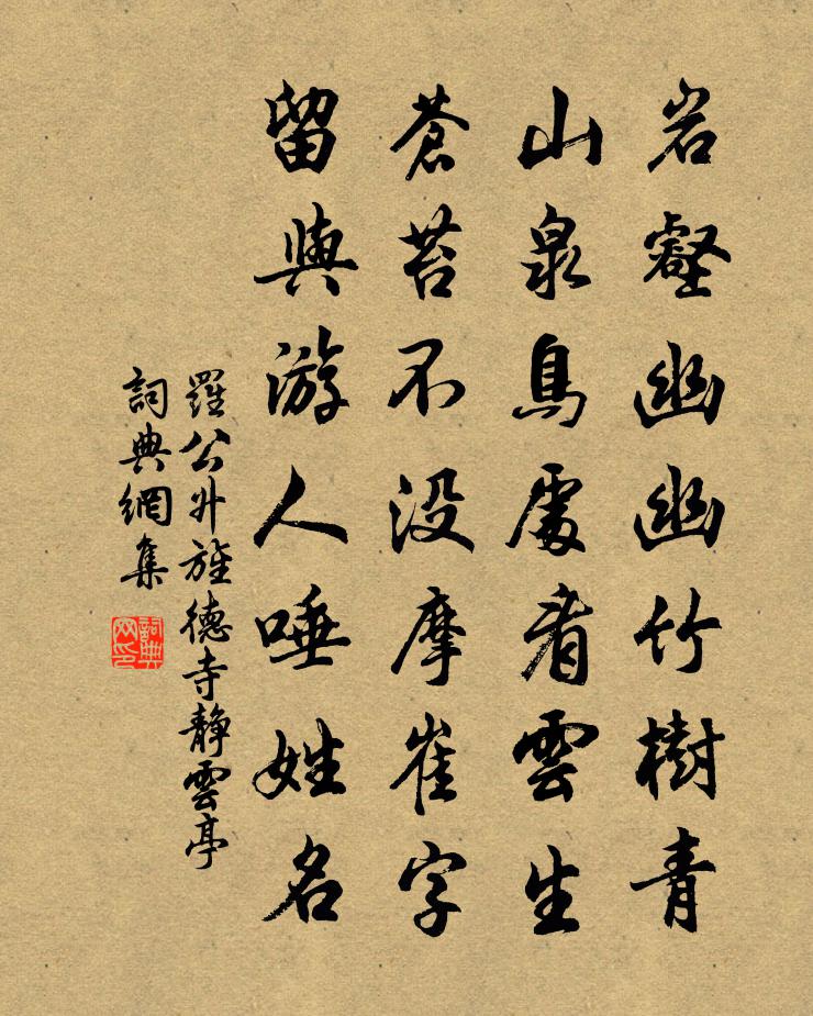 詩詞名句歷史字典書法欣賞書法字典國語詞典說文解字康熙字典古漢語字典標 題 作 者 詩 句 旌德寺靜雲亭作者:羅公升 朝代:宋代旌德寺靜雲亭原文岩壑幽幽竹樹青,山泉鳥處看雲生。蒼苔不沒摩崔字,留與遊人唾姓名。詩詞問答問:旌德寺靜雲亭的作者是誰?答:羅公升問:旌德寺靜雲亭寫於哪個朝代?答:宋代羅公升旌德寺靜雲亭書法欣賞旌德寺靜雲亭書法作品詩詞推薦所思代人李中〔唐代〕巫峽雲深湘水遙,更無訊息夢空勞。夢回深夜不成寐,起立閒庭花月高。字耕顧逢〔宋代〕此田無水旱,只在硯池中。善作諸家體,能成八 * 。墨痕生夏雨,筆潁熟秋風。蓑笠辛勤者,常憂歲不豐。次韻張畹蘇軾〔宋代〕新落霜余兩岸隆,塵埃舉袂識西風。臨淮自古多名士,樽酒相從樂寓公。半日偷閒歌嘯,百年暗盡往來中。知君不贈劉進父監廟四首趙蕃〔宋代〕彼美南山石,槎牙更貫之。道雖橫至寶,誰復賞奇姿。嘆息已雲屢,寫摹嘗有詩。吾曹從行者,名字亦俱垂。答尉遲少監水閣重宴白居易〔唐代〕人情依舊歲華新,今日重招往日賓。雞黍重回千里駕,林園暗換四年春。水軒平寫琉璃鏡,草岸斜鋪翡翠茵。聞道池亭小酌李覯〔宋代〕客思都無著,臨池一醉歌。喚春呈物象,移性入天和。月影碎荊玉,波紋緯蜀羅。相看盡仙骨,俗態已無多。念奴嬌·避地溢江書於新亭王瀾〔宋代〕憑高遠望,見家鄉、只在白雲深處。鎮日思歸歸未得,孤負殷勤杜宇。故國傷心,新亭淚眼,更灑瀟瀟雨。長江萬山中胡仲弓〔宋代〕世情紛醉夢,抱獨入山林。有竹堪翳俗,無弦誰賞音。松蘿青嶂合,雞犬白雲深。未必幽居者,能賡梁甫吟。詩應璩〔魏晉〕丈夫要雄戟。更來宿紫庭。今者宅四海。誰復有不幷。游廬山觀道士石室吳邁遠〔南北朝〕蒙茸眾山里,往來行跡稀。尋嶺達仙屋,道士披雲歸。似著周時冠,狀披漢時衣。安知世代積,服古人不衰。得我和山房夾谷僉事韻二首何夢桂〔宋代〕蒼生下土望天仙,乞得君恩易地然。繡斧聿來霄漢上,丹書先到浙江邊。學徒免隸夫征法,官品寧輸戶役錢。愧死都堂試貢士日慶春雪李景〔唐代〕密雪分天路,群才坐粉廊。靄空迷晝景,臨宇借寒光。似暖花消地,無聲玉滿堂。灑池偏誤曲,留硯忽因方。幾處送元晟歸潛山所居(一作送王山人歸別業)皇甫冉〔唐代〕深山秋事早,君去復何如。裛露收新稼,迎寒葺舊廬。題詩即招隱,作賦是閒居。別後空相憶,嵇康懶寄書。設醮太平宮竣事呈偕行諸君二首岳珂〔宋代〕星壇仙簴韻瓊瑤,仿佛神{游去氵}下九霄。龍駕清都三境接,蜺旌絳節百靈朝。霜澄夜氣俱明徹,雲澹秋容想泬丘處士輓詞戴栩〔宋代〕自移小陶寄西闤,終是高人 * 閒。夢到春潮生荻渚,眼看舊友上蓬山。棋聲忽背樵風遠,書影空涵櫂月彎。令子偈頌七十一首釋了惠〔宋代〕五月端午令節,艾人苦痛不徹。可憐病有膏肓,又被邪神所惑。撞著太上老君,也是赤口白舌。山僧反覆思量,別緣識宋太宗〔宋代〕道門長嘯扣玄關,咀嚼盈虛口不閒。峰頂怡情松作笠,五湖來往看人間。樂府曹植〔魏晉〕膠漆至堅。浸之則離。皎皎素絲。溺色染移。君不我棄。讒人所為。別林和卿二首曾豐〔宋代〕甚矣身如幻,加之跡若浮。妙山孤倜儻,良友貳遨遊。水挾月涵夜,風推雨郁秋。物來吾不拒,隨件以詩收。吳江楊備〔宋代〕松陵水國面松江,學弄漁竿對酒缸。驚起鴛鴦是旗鼓,背帆飛去一雙雙。名句推薦獨自莫憑欄,無限江山,別時容易見時難。李煜《浪淘沙令·簾外雨潺潺》 一騎紅塵妃子笑,無人知是荔枝來。杜牧《過華清宮絕句三首》 兵可千日而不用,不可 一日而不備。李大師、李延壽《南史·列傳·卷六十一》 紅粉佳人休使老,風流浪子莫教貧。佚名《增廣賢文·上集》 人生到處知何似,應似飛鴻踏雪泥。蘇軾《和子由澠池懷舊》 久廢山行疲犖确,尚能村醉舞淋浪。蘇軾《捕蝗至浮雲嶺山行疲苶有懷子由弟二首·其二》 冉冉年時暮,迢迢天路征。陸機《梁甫吟》 閒坐悲君亦自悲,百年多是幾多時。元稹《遣悲懷三首·其三》 雲鬢花顏金步搖,芙蓉帳暖度春宵。白居易《長恨歌》 大道如青天,我獨不得出。李白《行路難三首》