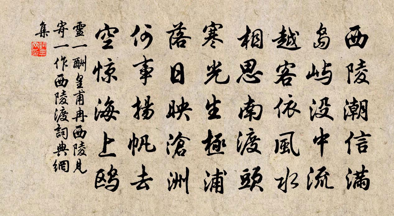 詩詞名句歷史字典書法欣賞書法字典國語詞典說文解字康熙字典古漢語字典標 題 作 者 詩 句 酬皇甫冉西陵見寄(一作西陵渡)作者:靈一 朝代:唐代原文西陵潮信滿,島嶼沒中流。越客依風水,相思南渡頭。寒光生極浦,落日映滄洲。何事揚帆去,空驚海上鷗。詩詞問答問:《酬皇甫冉西陵見寄(一作西陵渡)》的作者是誰?答:靈一問:該詩寫於哪個朝代?答:唐代書法欣賞酬皇甫冉西陵見寄(一作西陵渡)書法作品詩詞推薦和陳先輩陪陸舍人春日游曲江黃滔〔唐代〕劉超游召郄詵陪,為憶池亭舊賞來。紅杏花旁見山色,詩成因觸鼓聲回。黑漆弩·游金山寺王惲〔元代〕鄰曲子嚴伯昌,嘗以《黑漆弩》侑酒。省郎仲先謂余曰:“詞雖佳,曲名似未雅。若就以‘江南煙雨’目之何如?農家六言楊萬里〔宋代〕插秧已蓋田面,疏苗猶逗水光。白鷗飛處極浦,黃犢歸時夕陽。寒夜溪行舟中作獨孤及〔唐代〕日沉諸山昏,寂歷群動宿。孤舟獨不系,風水夜相逐。雲歸恆星白,霜下天地肅。月 * 如盤,金波入空谷。魏闕明招雜詩四首呂祖謙〔宋代〕風檐裊茶煙,銅瓶語相泣。清陰一疎箔,不礙飛花入。偈頌二百零五首釋正覺〔宋代〕一陣清霜,千峰寒色,里許是誰看轉側。家風克紹紹非功,撫背忽驚兒脫白。虞美人劉辰翁〔宋代〕壽安樓子重重蕊。少見如魚尾。向來染得渭脂紅。又自細搖花浪、動春風。赬鱗似是人誰信。但向殘紅認。若教隨念奴嬌 中秋月次姚孝寧韻張玉娘〔元代〕冰輪駕海,破寒煙、萬點蒼山凝綠。清逼嫦娥秋殿靜,桂樹香飄金粟。萬頃琉璃,一天素練,光徹飛瓊屋。楚雲無滿庭芳佚名〔宋代〕盡說煙消,皆言火滅,觸來總是無明。不知不覺,怎得離眾生。道本易行易曉,奈心迷、難曉難行。心魔障,未成益壽美金花侯善淵〔元代〕潛龍初九。九五飛龍群無首。大哉乾元。物物亨純得自然。性相以近。道顯諸仁藏諸用。精粹含光。神易窮通沒定寄都官劉員外章八元〔唐代〕舊宅平津邸,槐陰接漢宮。鳴騶馳道上,寒日直廬中。白雪歌偏麗,青雲宦早通。悠然一縫掖,千里限清風。句林逋〔宋代〕算吟千萬首,方得兩三聯。題有餘齋釋崇岳〔宋代〕日月雙螢火,乾一做鵲巢。大千沙界外,總在目前包。句蘇舜元〔宋代〕斷香浮缺月,古像守昏燈。朝中措張掄〔宋代〕午陰多處□□□。楊柳□□□。翠羽無情飛去,紅蕖有意□□。□□□□,□□□□,□□吾生。為報凌煙□□,再用韻十首楊公遠〔宋代〕村深林密處,路向小橋分。屋老誅茅葺,腸枯借酒醺。廢興隨反掌,富貴等浮雲。近更澆漓甚,傷懷不忍聞。登廬山晁補之〔宋代〕丹碧沉沉虎豹閒,松幢引度九重關。人間未覺渾無路,天上還驚更有山。瑤草紅泉供挹酌,金風白露送躋攀。良游觀八陣圖說岳珂〔宋代〕八陣初興黃帝時,貙劉在漢紀乘之。流形龍虎隨雷雨,定位鳥蛇分坎離。地以雲升高復下,天從風別正之奇。自然白頭翁鳥張鎡〔宋代〕檜叢叢囀愜新晴,巧好春林百鳥聲。羽輩誤教推皓首,細聽多是少年情。予與微之,老而無子,發於言嘆,著在詩篇。白居易〔唐代〕常憂到老都無子,何況新生又是兒。陰德自然宜有慶,皇天可得道無知。[於公陰德。其後蕃昌。皇天無知,伯道名句推薦至言忤於耳而倒於心,非賢聖莫能聽韓非及後人《韓非子·難言》 明月,明月,胡笳一聲愁絕。戴叔倫《轉應曲·邊草》 正是浴蘭時節動。菖蒲酒美清尊共。歐陽修《漁家傲·五月榴花妖艷烘》 淑氣催黃鳥,晴光轉綠蘋。杜審言《和晉陵陸丞早春遊望》 賢達哀樂,不在窮通禍福之間。脫脫《遼史·列傳·卷三十四》 野竹分青靄,飛泉掛碧峰。李白《訪戴天山道士不遇》 守節自誓,親誨之學。歐陽修《畫地學書》 河海不擇細流,故能就其深;李斯《諫逐客書》 東風不與周郎便,銅雀春深鎖二喬。杜牧《赤壁》 馬上相逢無紙筆,憑君傳語報平安。岑參《逢入京使》