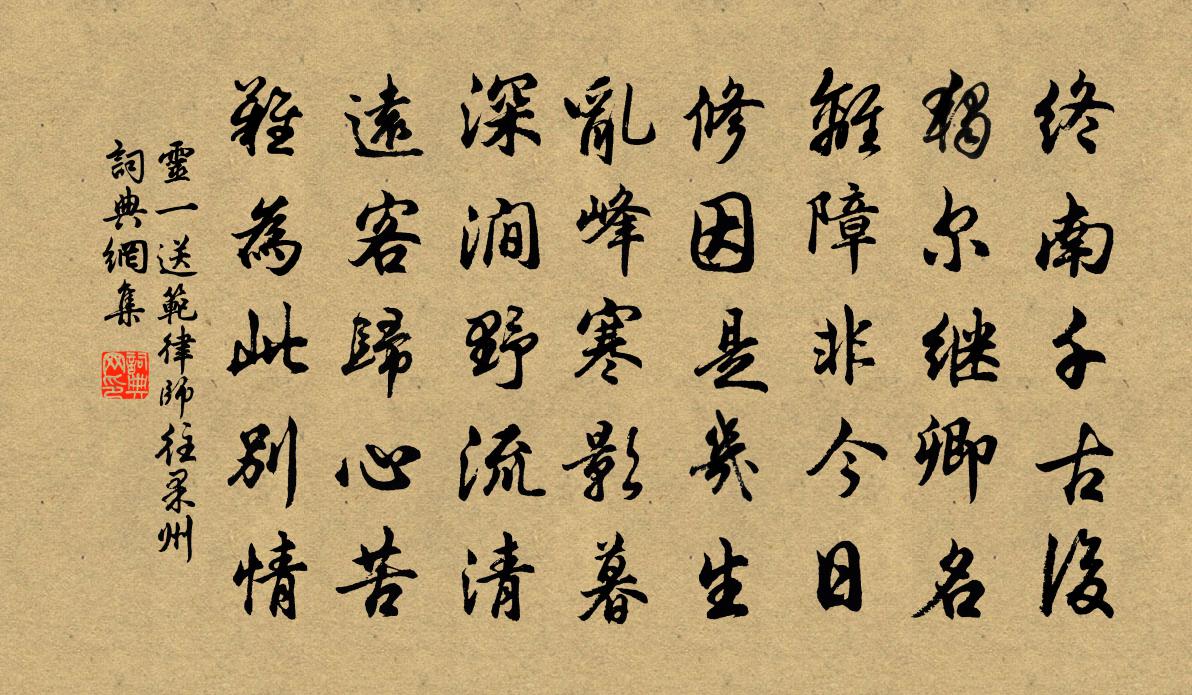 詩詞名句歷史字典書法欣賞書法字典國語詞典說文解字康熙字典古漢語字典標 題 作 者 詩 句 送范律師往果州作者:靈一 朝代:唐代送范律師往果州原文終南千古後,獨爾繼卿名。離障非今日,修因是幾生。亂峰寒影暮,深澗野流清。遠客歸心苦,難為此別情。詩詞問答問:送范律師往果州的作者是誰?答:靈一問:送范律師往果州寫於哪個朝代?答:唐代問:送范律師往果州是什麼體裁?答:五律靈一送范律師往果州書法欣賞送范律師往果州書法作品注釋全唐詩:卷809-22詩詞推薦四時田園雜興范成大〔宋代〕種園得果僅償勞,不奈兒童鳥雀搔。已插棘針樊筍徑,更鋪漁網蓋櫻挑。李良相清德碑良相百藥四世孫也天寶中為尉氏李廌〔宋代〕旌廉以廉寡,樹碑勵貪夫。後人慕前躅,當令德不孤。第無愧屋漏,斯能遠苞苴。番禺惟飲水,合浦自還珠。蝶戀花方千里〔宋代〕碎玉飛花寒食後。薄影行風,終日穿疏牖。有客思歸還把酒。閒吹倦絮輕黏手。雪滿愁城寒欲透。飄盡殘英,翠幄乙酉社日偶題楊萬里〔宋代〕愁邊節里兩相關,茶罷呼兒撿歷看。社日雨多晴較少,春風晚暖曉猶寒。也思散策郊行去,其柰緣溪路未乾。綠暗太陽丘葵〔宋代〕太陽一入地,亦足蒸成霞。老學儻能勉,聲績豈不華。與子野過永仙觀循西城以歸邂逅李戒甫夕山西仇遠〔宋代〕一笑相逢李伯時,樹陰匝地綠雲低。林梢落日猶余丈,天下好山多在西。我醉欲歸須客送,君裝已趣尚鵑啼。明朝笛家弄/笛家朱雍〔宋代〕瓖質仙姿,縞袂清格,天然疏秀。靜軒煙鎖黃昏後。影瘦零亂,艷冷瓏璁,雪肌瑩暖,冰枝縈繡。更賦風流,幾番次韻周畏知問訊城東梅塢七首張栻〔宋代〕短筇遍歷溪山,款段時尋鄰里。遇酒聊一中之,得句亦偶然耳。送簡壽玉主簿之官臨桂二首楊萬里〔宋代〕蘭溪傾蓋杏風殘,桂嶺離裾菊露寒。聽子新詩過夜半,吹儂秋思入雲端。往吟平地千蒼玉,還憶孤舟一釣竿。四海洞仙歌朱彝尊〔清代〕謝娘春曉,借貧家螺黛。須拗花枝與伊戴。傍妝檯,見了已慰相思。原不分,雲母船窗同載。叢祠燈火下,暗祝心對雪張鎡〔宋代〕溫記今年雪,先慳半月晴。乍飄偏有熊,猛下卻無聲。水繞長春圃,人居 * 。弄寒群犬戲,驚曉獨雞鳴。橋凍朝天子(周師從小閣)楊無咎〔宋代〕小閣寬如掌。占螺浦、山川夷曠。千奇萬狀。見雲煙收放。更永夜、風生明月上。用取真成無盡藏。誰共賞。徙倚惜花來鵠〔唐代〕東風漸急夕陽斜,一樹夭桃數日花。為惜紅芳今夜裡,不知和月落誰家。和陶怨詩示龐鄧蘇軾〔宋代〕當歡有餘樂,在戚亦頹然。淵明得此理,安處故有年。嗟我與先生,所賦良奇偏。人間少宜適,惟有歸耘田。我昔寄賀周子充除左相留正除右相王謙仲除參政趙蕃〔宋代〕淳熙十六年,正月十九日。雪余雨更作,有客方抱疾。忽傳底處書,昏暮叩蓬蓽。問之何許人,乃是吾家侄。書中與謬栓法同行口占分水嶺詩駱羅憲〔宋代〕盡道今年雨意稠,踏歌芒時偏東疇。微官祗有半豐願,一飽高眠萬事休。酬喬世材推官李復〔宋代〕地僻人來少,公庭吏散時。亂蟬號晚日,涼葉下高枝。仰羨知歸鳥,先書寄遠詩。只應今夜月,偏解照相思。鄰峰艮上人2釋紹曇〔宋代〕短筇扶瘦扣煙蘿,款問東山瓦鼓歌。老倦不能謳唱得,隔窗幽鳥語尤多。和元耘軒賦木蕖來字韻陳翊〔唐代〕碧樹籠秋池,錦帳迎風開。水光曳倒影,矮菊紛輿台。春風木芍藥,是花豈雲來。淡妝絕脂粉,獨秀牆之隈。仿佛初除尚書郎,脫刺史緋白居易〔唐代〕親賓相賀聞何如?服色恩光盡反初。頭白喜拋黃草峽,眼明驚拆紫泥書。便留朱紱還鈴閣,卻著青袍侍玉除。無奈名句推薦大江東去,浪淘盡,千古風流人物。蘇軾《念奴嬌·赤壁懷古》 禮尚往來。往而不來,非禮也;來而不往,亦非禮也。戴聖《禮記·曲禮上》 寒山吹笛喚春歸,遷客相看淚滿衣。李益《春夜聞笛》 海闊山遙,未知何處是瀟湘柳永《玉蝴蝶·望處雨收雲斷》 弔影分為千里雁,辭根散作九秋蓬。白居易《望月有感》 富貴必從勤苦得,男兒須讀五車書。杜甫《柏學士茅屋》 天下未有不學而成者也。王通《中說·卷六·禮樂篇》 桃花盡日隨流水,洞在清溪何處邊。張旭《桃花溪》 詩家清景在新春,綠柳才黃半未勻。楊巨源《城東早春》 巧言令色,鮮矣仁。孔子弟子《論語·學而篇》