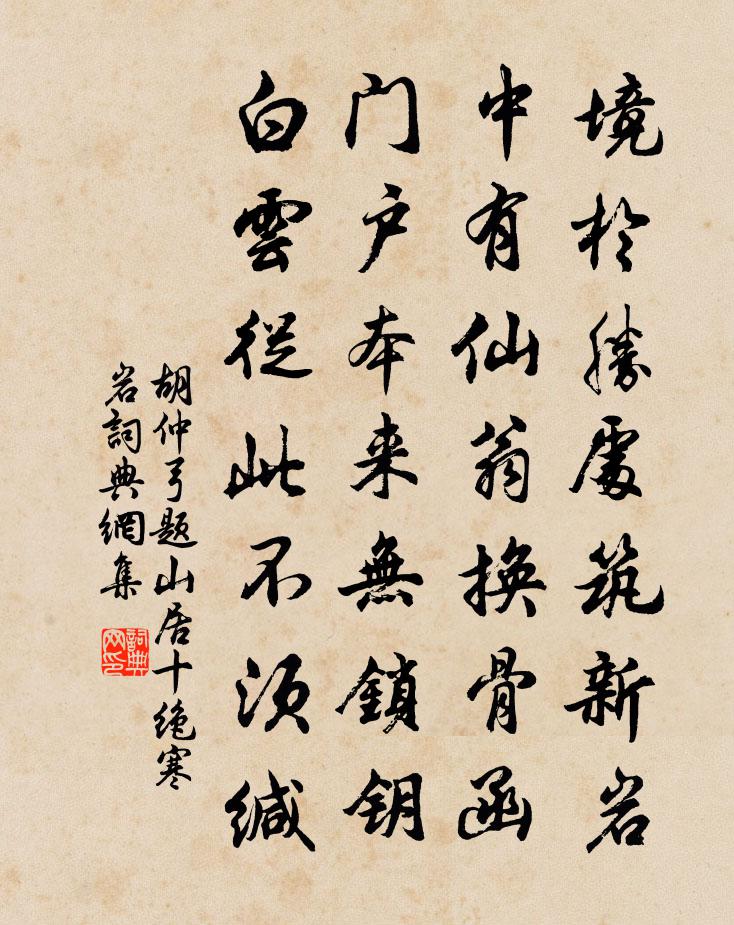 詩詞名句歷史字典書法欣賞書法字典國語詞典說文解字康熙字典古漢語字典標 題 作 者 詩 句 題山居十絕寒岩作者:胡仲弓 朝代:宋代題山居十絕寒岩原文境於勝處築新岩,中有仙翁換骨函。門戶本來無鎖鑰,白雲從此不須緘。詩詞問答問:題山居十絕寒岩的作者是誰?答:胡仲弓問:題山居十絕寒岩寫於哪個朝代?答:宋代胡仲弓題山居十絕寒岩書法欣賞題山居十絕寒岩書法作品詩詞推薦夜泊彭蠡風大作黎廷瑞〔宋代〕卸帆月欲墮,泊岸風轉急。驚砂傳鐵箭,飛霰散瓊粒。重湖太古水,帝遣龍下吸。潛鱗失故穴,蒼黃望舟入。寧知寒食有懷楚都項安世〔宋代〕北士重寒食,東風吹故鄉。不知清野後,還有踏青無。荻筍烹魚美,萎蒿裹飯腴。異鄉悲節物,歸夢近檣鳥。憶東山二首李白〔唐代〕不向東山久,薔薇幾度花。白雲還自散,明月落誰家。我今攜謝妓,長嘯絕人群。欲報東山客,開關掃白雲。偈頌一百二十三首釋崇岳〔宋代〕絕羅籠,脫羈鎖。雖是善因,而招惡果。夏中病痁作溫庭筠〔唐代〕山鬼揚威正氣愁,便辭珍簟襲狐裘。西窗一夕悲人事,團扇無情不待秋。自唐安之成都陸游〔宋代〕出門猶苦雨,度塹喜新晴。日正車無影,風高蓋有聲。疏疏稚苗立,鬱郁晚桑生。宿醉行猶倦,無人為解酲。贈台倅徐太博釋長吉〔宋代〕瓊樹從芳蕤,靈根植仙圃。懿哲蘊英才,妙幾沖雲路。曲台峻清秩,峨冠凜奇趣。霞城倅郡條,惠愛春榮布。心陂競渡詩 / 及第後江寧觀競渡寄袁州剌史成應元盧肇〔唐代〕石溪久住思端午,館驛樓前看發機。鼙鼓動時雷隱隱,獸頭凌處雪微微。衝波突出人齊譀,躍浪爭先鳥退飛。向道行住坐臥三十二頌釋印肅〔宋代〕摩尼無價汝當收,金玉浮財誓莫求。戴角披毛從此入,百千萬劫作驢牛。蘆葦江八詠東橋柳色羅仲舒〔宋代〕河橋數株柳,偏受東風多。柔條慎扔折,生意全天和。牡丹詩十首宋白〔宋代〕□應春處即□春,粉面□相□番新。語得必傳天上事,摘來真是掌中身。百花推戴教為主,□日妖□欲□人。無可夜行船(京口南園)黃機〔宋代〕紅濺羅裙三月二。露桃開、柳眠又起。百尺遊絲,罥鶯留燕,判與南園一醉。歷歷斜陽明野水。倚危闌、暮雲千里頌古四十四首釋法泰〔宋代〕百丈開田說大義,理事圓融無不備。梵音清徹十方聞,草樹鋤鍬皆聳起。末後雙拳再展開,拖泥帶水為痴呆。船流郊廟歌辭。釋奠文宣王樂章。肅和佚名〔唐代〕粵惟上聖,有縱自天。傍周萬物,俯應千年。舊章允著,嘉贄孔虔。王化茲首,儒風是宣。海棠俞桂〔宋代〕海棠裊裊弄胭脂,雨入枝頭睡正宜。最是高人有遺恨,杜陵因甚卻無詩。次黃存之東皋韻黃文雷〔宋代〕藝木東皋下,新榮冒水涯。錦機分箔鬧,青子亞枝斜。犢角初生筍,龍鬚正引瓜。吸清雙玉井,留客品嘗茶。奉和聖制從蓬萊向興慶閣道中留春雨中春望之作應制王維〔唐代〕渭水自縈秦塞曲,黃山舊繞漢宮斜。鑾輿迥出千門柳,閣道回看上苑花。雲里帝城雙鳳闕,雨中春樹萬人家。為乘超宗道人請贊釋宗杲〔宋代〕一條白棒,佛祖俱打。超宗禪人,大膽不怕。畫我來乞贊,鬼門上帖卦。三十年後此話大行,任一切人鑽龜打瓦。送王嘉叟侍郎使虜仍用其韻胡銓〔宋代〕蘇張姓字炳如丹,遍歷遐荒覺世寬。龍勒殊勛標絕域,麟宮奇節障狂瀾。二千里外河源遠,十九年間海上寒。二子巫山高李鹹用〔唐代〕通蜀連秦山十二,中有妖靈會人意。鬥豔傳情世不知,楚王魂夢春風裡。雨態雲容多似是,色荒見物皆成媚。露泫名句推薦不種閒花,池亭畔、幾竿修竹。陸容《滿江紅·詠竹》 村北村南,穀雨才耕遍。秀麥連岡桑葉賤。范成大《蝶戀花·春漲一篙添水面》 故大國之攻小國也,是交相賊也,過必反於國。墨子《墨子·49章 魯問》 世治不輕,世亂不沮;同弗與,異弗非也。戴聖《禮記·儒行》 小酌酒巡銷永夜,大開口笑送殘年。白居易《雪夜小飲贈夢得》 茶者,南方之嘉木也,一尺二尺,乃至數十尺。其巴山峽川有兩人合抱者,伐而掇之陸羽《茶經·一之源》 金陵津渡小山樓,一宿行人自可愁。張祜《題金陵渡》 馬思邊草拳毛動,雕眄青雲睡眼開。劉禹錫《始聞秋風》 別院深深夏席清,石榴開遍透簾明。蘇舜欽《夏意》 葉落根偏固,心虛節更高。憨山德清《詠竹五首》