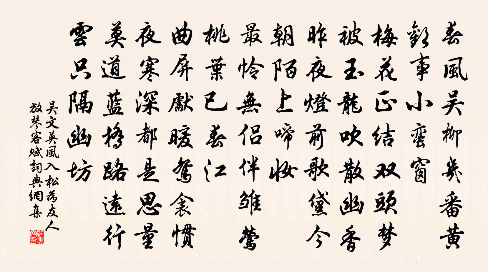 《風入松》,古琴曲有《風入松》,傳為晉嵇康所作。又唐僧皎然有《風入松歌》,見《樂府詩集》卷五十九,調名由此而來。《宋史·樂志》入“林鐘商”,調見晏幾道《小山詞》。又名《風入松慢》、《遠山橫》。雙調,七十四字、七十六字,亦有七十二字型的。前後片各六句四平韻。《夢窗詞》系七十六字型。