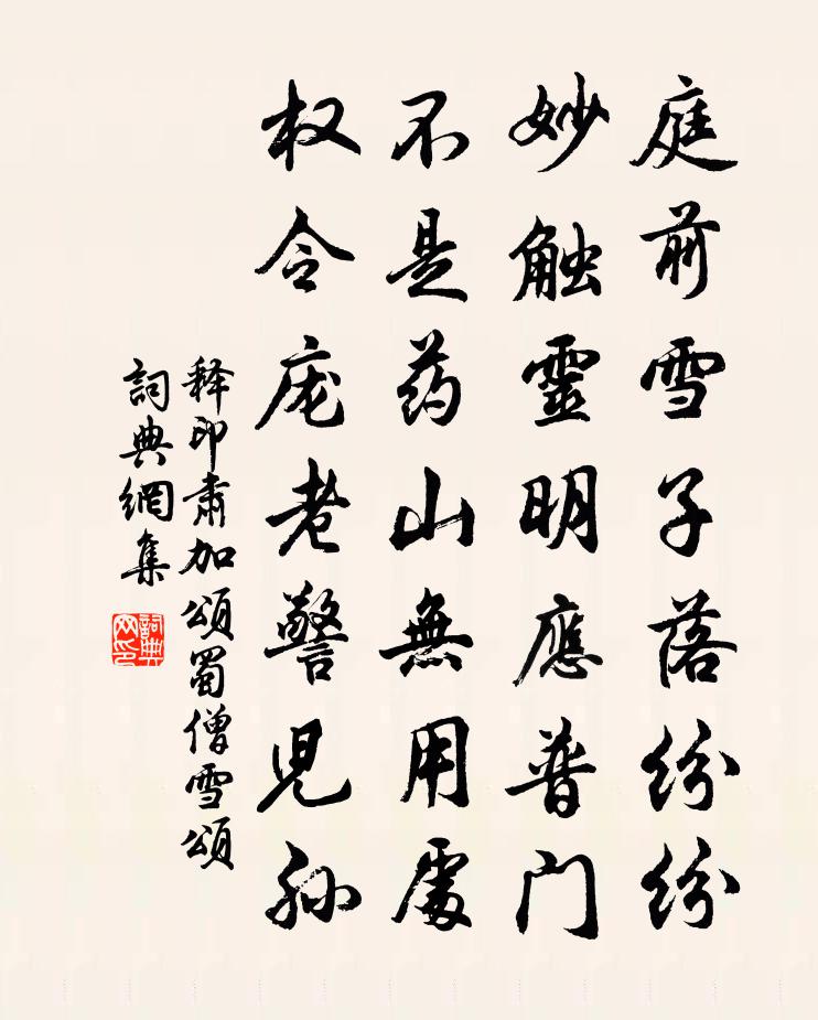 詩詞名句歷史字典書法欣賞書法字典國語詞典說文解字康熙字典古漢語字典標 題 作 者 詩 句 加頌蜀僧雪頌作者:釋印肅 朝代:宋代加頌蜀僧雪頌原文庭前雪子落紛紛,妙觸靈明應普門。不是藥山無用處,權令龐老警兒孫。詩詞問答問:加頌蜀僧雪頌的作者是誰?答:釋印肅問:加頌蜀僧雪頌寫於哪個朝代?答:宋代釋印肅加頌蜀僧雪頌書法欣賞加頌蜀僧雪頌書法作品詩詞推薦送鄭尚書守建安十首彭龜年〔宋代〕自從秉節簉明廷,讜論忠言四海傾。何事不關天下念,此心無著世間名。送李君上洞天鄧肅〔宋代〕北風於喁萬竅號,落雪紛紛燖鵠毛。好向高堂護帷幕,新醪入臉殷春桃。居士何為囂不顧,叩戶長歌辭我去。行行三月十七日以檄出行賑貸旬日而復反自州門至趙蕃〔宋代〕世奇粵水與湘山,此地元居楚粵間。盡日覓詩終莫就,有時游目不能還。驟來遙點雨初過,忽爾數峰雲自閒。遠碧次韻子瞻題郭熙平遠二絕蘇轍〔宋代〕亂山無盡水無邊,田舍漁家共一川。行遍江南識天巧,臨窗開卷兩茫然。斷雲斜日不勝秋,付與騷人滿目愁。父老贈裴處士許渾〔唐代〕為儒白髮生,鄉里早聞名。暖酒雪初下,讀書山欲明。字形翻鳥跡,詩調合猿聲。門外滄浪水,知君欲濯纓。同孫子直和李參政東園韻十絕洪咨夔〔宋代〕治國宜將治圃看,墾除容易整齊難。沼泉莫放源頭濁,種竹先教地步寬。偈頌七十六首釋師觀〔宋代〕結夏又十日,個事作麽生。無風荷葉動,決定有魚行。度浮橋至南台陸游〔宋代〕客中多病廢登臨,聞說南台試一尋。九軌徐行怒濤上,千艘橫系大江心。寺樓鐘鼓催昏曉,墟落雲煙自古今,白髮杜中丞書院新移小竹王建〔唐代〕此地本無竹,遠從山寺移。經年求養法,隔日記澆時。嫩綠卷新葉,殘黃收故枝。色經寒不動,聲與靜相宜。愛護次韻次尹俊卿梅花絕句王灼〔宋代〕袖寒倚修竹,暗起著人香。聯影黃昏月,亭亭上璧璫。偈頌一百二十三首釋祖欽〔宋代〕你有一丈還你一丈,你有一尺還你一尺。若只咬定不肯回頭,白日青天霹靂。王承可有招隱黃龍之意朱翌〔宋代〕通途無寧軌,世綱闊遮邏。九遷食肉榮,一餉在堂賀。泥深跡逾深,時過事亦過。要之鐘鼎飽,不及薇蕨餓。吾知記小圃花果二十首劉克莊〔宋代〕老景歡悰少,看花偶出嬉。相隨惟一肩,錦傘欲何施。贈范君用筆工五首方回〔宋代〕畫工如山赤墀下,調子之筆丹青勻。一洗萬古空凡馬,曹將軍外更無人。和皇甫郎中秋曉同登天宮閣言懷六韻白居易〔唐代〕碧天忽已高,白日猶未短。玲瓏曉樓閣,清脆秋絲管。張翰一杯酣,嵇康終日懶。塵中足憂累,雲外多疏散。病木和六弟苦雨韓維〔宋代〕雷激霆奔夜復晨,天街流潦沒車輪。清風皎日收無跡,妖{左蟲右戾}頑蛟亦有神。洊至已驚占習坎,汨陳深鞏敗減字木蘭花(好惡)沈瀛〔宋代〕瞻烏愛止。不是檐前聞鵲喜。上下鳴風。以類相從自感通。嫌茶愛酒。惡彼芝焚夸柏壽。說汝言何。一切人言口眾挑燈杖駱賓王〔唐代〕稟質非貪熱,焦心豈憚熬。終知不自潤,何處用脂膏。巴東西仇遠〔宋代〕巴東有杜鵑,杜鵑啼春花正妍。巴西有杜鵑,杜鵑啼血花可憐。巴東巴西久為客,目斷江南歸未得,月明滿地山花天柱山贈峨嵋田道士施肩吾〔唐代〕古稱天柱連九天,峨嵋道士棲其巔。近聞教得玄鶴舞,試憑驅出青芝田。名句推薦寥落古行宮,宮花寂寞紅。元稹《行宮》 不要人夸顏色好,只留清氣滿乾坤。王冕《墨梅》 不知天外雁,何事樂長征?徐禎卿《在武昌作》 杜鵑再拜憂天淚,精衛無窮填海心。黃遵憲《贈梁任父母同年 / 題梁任父同年》 想得此時情切,淚沾紅袖黦。韋莊《應天長·別來半歲音書絕》 畫圖恰似歸家夢,千里河山寸許長。辛棄疾《鷓鴣天·送元濟之歸豫章》 一切福田,不離方寸;從心而覓,感無不通。袁黃《了凡四訓·立命之學》 我見青山多嫵媚,料青山見我應如是。辛棄疾《賀新郎·甚矣吾衰矣》 方慚不耕者,祿食出閭里。韋應物《觀田家》 雪似梅花,梅花似雪。呂本中《踏莎行·雪似梅花》