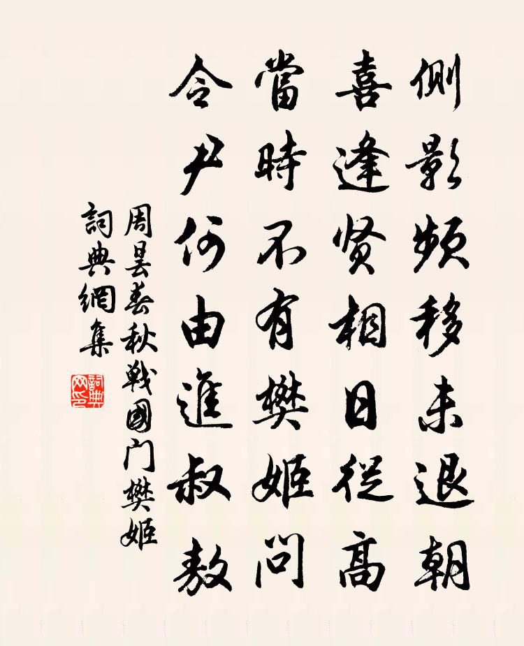 詩詞名句歷史字典書法欣賞書法字典國語詞典說文解字康熙字典古漢語字典標 題 作 者 詩 句 春秋戰國門樊姬作者:周曇 朝代:唐代春秋戰國門樊姬原文側影頻移未退朝,喜逢賢相日從高。當時不有樊姬問,令尹何由進叔敖。詩詞問答問:春秋戰國門樊姬的作者是誰?答:周曇問:春秋戰國門樊姬寫於哪個朝代?答:唐代周曇春秋戰國門樊姬書法欣賞春秋戰國門樊姬書法作品注釋全唐詩:卷728-89詩詞推薦次韻杜安行見寄憶梅之什郭印〔宋代〕穠華桃李容,不梁雙眸淨。唯有愛梅心,夢中行庾嶺。安得移瓊林,月下對清影。坐想冰雪姿,蕭然幽興永。我欲偶見·深山曲路見徐禎卿〔明代〕深山曲路見桃花,馬上匆匆日欲斜。可奈玉鞭留不住,又銜春恨到天涯。 晉子生日葉茵〔宋代〕今朝阿晉紀桑弧,郎罷持杯勉讀書。斷莫繞家覓梨栗,更須為國習耕鋤。義方授汝心還愧,陰德於予計肯疏。學取贈張繪秘教九題詩將林逋〔宋代〕風騷推上將,千古聳威名。子美嘗登拜,昌齡合按行。籠紗疑旆影,擊缽認金聲。唱和知誰敵,長驅勢已成。翌日趙守轉以酴醿惠予用前韻謝之鄭剛中〔宋代〕染露檀心嫌粉白,數花欲作鵝兒色。圃中不為客分春,使君自有分春力。雲龍歌調陸務觀楊萬里〔宋代〕墨池楊子云,雲間陸士龍。天憎二子巧言語,只遣相別無相逢。長安市上忽再值,向來一別三千歲。王母桃花落幾答僧見呂岩〔唐代〕三千里外無家客,七百年來雲水身。行滿蓬萊為別館,道成瓦礫盡黃金。待賓榼里常存酒,化藥爐中別有春。積德和端式十題垂崖鞭司馬光〔宋代〕山竹引春根,垂透蒼崖底。綢直老龍鬚,佶屈修蛇尾。支郎雖畜馬,不忍裁為箠。豀魚舒岳祥〔宋代〕紅白豀魚也可憐,夜涼沙靜枕流眠。澄潭百尺無機事,自古何人作釣船。點絳唇(妙香檐卜)王十朋〔宋代〕毗舍遙遙,異香一炷馳名久。妙香稀有。鼻觀深參透。問訊東來,知□誰先後。稱仙友。十花為偶。近有江西守。自戲三絕句。心重答身白居易〔唐代〕因我疏慵休罷早,遣君安樂歲時多。世間老苦人何限,不放君閒奈我何。詠夾徑菊薛能〔唐代〕夾徑盡黃英,不通人並行。幾曾相對綻,元自兩行生。叢比高低等,香連左右並。畔搖風勢斷,中夾日華明。間隔數日不出門偶賦陸游〔宋代〕十二年來一日同,飯蔬略似誦經翁。居家不擬依鄰富,報國惟思祝歲豐。冰澗乍通寒溜碧,蘭叢新放露芽紅。閒門次韻泮宮直宿早秋四首傅察〔宋代〕皎皎清波滿岬空,疏林散影弄朦朧。援毫欲賦陽台夢,振袂欣乘玉宇風。已覺素秋來席上,卻疑仙景落壺中。凌雲北歸三首曾鞏〔宋代〕江海多年似轉蓬,白頭歸拜未央宮。堵牆學士驚相問,何處塵埃瘦老翁。送客一歸襄陽二歸潯陽韓翃〔唐代〕南驅匹馬會心期,東望扁舟愜夢思。熨斗山前春色早,香爐峰頂暮煙時。空林欲訪龐居士,古寺應懷遠法師。兩地粵王台懷古廖燕〔清代〕粵嶠猶存拜漢台,東南半壁望中開。命歸亭長占王業,人起炎方見霸才。日月行空從地轉,蛟龍入海卷潮回。山川洞庭題詠十一首廣福上真宮王阮〔宋代〕水色窗碧滄茫,山勢青周遭。壯哉杳渺峰,據此第一高。蕭梁古道場,歲月湮蓬蒿。有來天師孫,遠與朱葉曹。十贈道者張蠙〔唐代〕得道疑人識,都城獨閉關。頭從白後黑,心向鬧中閒。饑渴唯調氣,兒孫亦駐顏。始知仙者隱,殊不在深山。王元龍惠新制輒依末後耘田韻敘謝曹勛〔宋代〕雕章琢句茂家聲,如閱龍跳讀快晴。秀韻凌虛天外立,春熙及物坐中生。只應翳鳳游八極,但覺儀韶聞九成。原看名句推薦碧溪影里小橋橫,青簾市上孤煙起。謝逸《踏莎行·柳絮風輕》 聞道長安燈夜好,雕輪寶馬如雲。毛滂《臨江仙·都城元夕》 射人先射馬,擒賊先擒王。杜甫《前出塞九首·其六》 郭門臨渡頭,村樹連谿口。王維《新晴野望》 寧可枝頭抱香死,何曾吹落北風中。鄭思肖《畫菊》 明歲秋風知再會,暫時分手莫相思。曹雪芹《殘菊》 一身猶在,亂山深處,寂寞溪橋畔。黃公紹《青玉案·年年社日停針線》 致君堯舜上,再使風俗淳。杜甫《奉贈韋左丞丈二十二韻》 但使情親千里近,須信。無情對面是山河。辛棄疾《定風波·席上送范廓之游建康》 今夫山一卷石之多,及其廣大,草木生之,禽獸居之,寶藏興焉。子思《中庸·第二十六章》