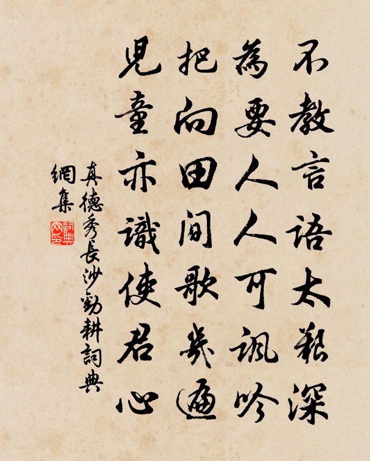 詩詞名句歷史字典書法欣賞書法字典國語詞典說文解字康熙字典古漢語字典標 題 作 者 詩 句 長沙勸耕作者:真德秀 朝代:宋代長沙勸耕原文不教言語太艱深,為要人人可諷吟。把向田間歌幾遍,兒童亦識使君心。詩詞問答問:長沙勸耕的作者是誰?答:真德秀問:長沙勸耕寫於哪個朝代?答:宋代真德秀長沙勸耕書法欣賞長沙勸耕書法作品詩詞推薦永康山張嵲〔宋代〕嵯峨千仞永康山,石路終朝轉屈盤。政恐乘高傷遠目,忽然煙霧鎖峰巒。休沐述懷寄秘閣錢少卿楊億〔宋代〕風號電笑雨平階,紈素微涼暗入懷。晝枕乍成園吏夢,晨蔬聊學太常齊。名慚引籍通丹地,心愧移文刻翠崖。大隱昱嶺范成大〔宋代〕竹輿搖兀走婆娑,石滑泥融側足過。昱嶺不高人已困,晚登新嶺奈君何!柳梢青許楨〔元代〕疊嶂浮嵐。澄江拖練,遠浦歸帆。橙蟹分甘,蓴鱸專美,露酒霜柑。登高聊憩禪庵。採菊蕊、茱萸滿籃。丹桂飄香嘉定六年皇后閣春貼子詞五首真德秀〔宋代〕輦回從五福宮庭,管弦聲里萬花紅。熙熙和氣皇州滿,都在乾坤橐籥中。答維溪趙崇鉘〔宋代〕維溪插架三千軸,葺茝紉蘭得自娛。會須握手論活法,靜看碧水生玄珠。楚狂接輿歌先秦無名〔先秦〕鳳兮鳳兮何德之衰。往者不可諫。來者猶可追。已而已而。今之從政者殆而。宿澄泉蘭若鄭谷〔唐代〕山半古招提,空林雪月迷。亂流分石上,斜漢在松西。雲集寒庵宿,猿先曉磬啼。此心如了了,即此是曹溪。頌古五十七首釋道昌〔宋代〕天雷如鼓,雲騰致雨。雨霽雲收,新月一鉤,至道無難,惟嫌揀擇。五年分疏太隔胍,東海鯉魚多赤梢,南山大蟲送新茶釋重顯〔宋代〕乘春雀舌占高名,龍麝相資笑解醒。莫訝山家少為送,鄭都官謂草中英。送春吳錫疇〔宋代〕惆悵春歸自不禁,日長門巷靜沈沈。應知不止為花地,沃沃桑麻雨露深。倒押前韻韓偓〔唐代〕白下同歸路,烏衣枉作鄰。珮聲猶隔箔,香氣已迎人。酒勸杯須滿,書羞字不勻。歌憐黃竹怨,味實碧桃珍。翦燭和永叔思白兔戲答公儀憶鶴雜言王珪〔唐代〕兔自明月窟中出,鶴從群玉峰頭下。人間俗眼未嘗窺,已為兩家藏以詫。玉堂詞人本仙材,光芒偶落銀河罅。謫向私願晁說之〔宋代〕胡塵未動朔雲浮,行在多歡見小侯。願保三冬資我樂,更無一事使人愁。挽致政朱司戶二首王邁〔宋代〕枕上功名淚不乾,鏡中勳業老猶看。起家喜有千金子,入手纏沾九品官。袞袞天朝來晚賁,匆匆人事異悲歡。最憐柳花白玉蟾〔宋代〕閒傍珠簾散漫初,垂垂欲下得風扶。繡床漸滿圓還碎,醉目遙看有似無。只見魚吞池面水,不知萍滿岸頭湖。往來玉樓春 次韻王豢彥博右丞詠梅程文海〔元代〕梁園賦客情無奈。嚼到梅花和蠟愛。偏憐初日透宮黃,怕染春風成野黛。游蜂怪底隨飛蓋。撿得繁枝償酒債。玉堂湘弦曲莊南傑〔唐代〕楚雲錚錚戛秋露,巫雲峽雨飛朝暮。古磬高敲百尺樓,孤猿夜哭千丈樹。雲軒碾火聲瓏瓏,連山卷盡長江空。鶯啼題浯溪中興頌二首陳容〔宋代〕六等勝如誅獨柳,二張縱活亦何顏。太師死後猶書法,水部刑章托頌間。最憶海青投樂器,絕憐甄濟隱青山。中興沁園春(西岩三澗)劉子寰〔宋代〕雲壑泉泓,小者如杯,大者如罌。更石筵平瑩,寬容數客,淙流回激,環繞飛觥。三澗交流,兩崖懸瀑,搗雪飛霜名句推薦夫尚賢者,政之本也。墨子《墨子·08章 尚賢(上)》 養弟子如養閨女,最要嚴出入,謹交遊。洪應明《菜根譚·概論》 卻看妻子愁何在,漫捲詩書喜欲狂杜甫《聞官軍收河南河北》 年年躍馬長安市。客舍似家家似寄。劉克莊《玉樓春·戲林推》 民之無良,相怨一方,受爵不讓,至於己斯亡。荀子《荀子·儒效》 三萬里河東入海,五千仞岳上摩天。陸游《秋夜將曉出籬門迎涼有感》 山舞銀蛇,原馳蠟象,欲與天公試比高 * 《沁園春·雪》 終日兩相思。為君憔悴盡,百花時。溫庭筠《南歌子·倭墮低梳髻》 清風朗月,輒思玄度。劉義慶《世說新語·言語》 長風連日作大浪,不能廢人運酒舫。元結《石魚湖上醉歌》