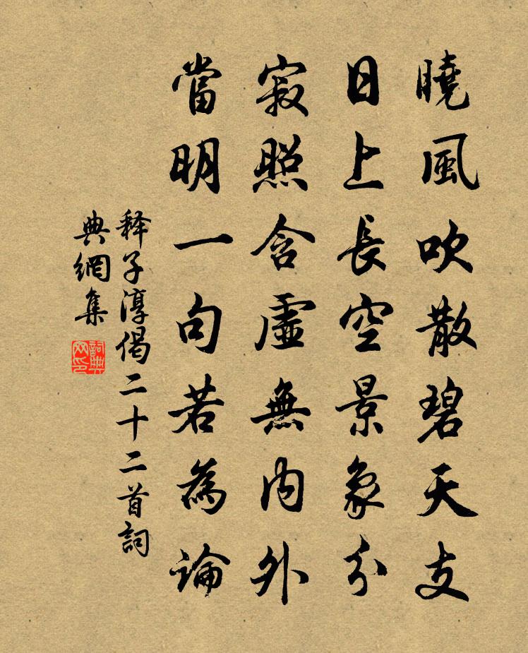 詩詞名句歷史字典書法欣賞書法字典國語詞典說文解字康熙字典古漢語字典標 題 作 者 詩 句 偈二十二首作者:釋子淳 朝代:宋代偈二十二首原文曉風吹散碧天支,日上長空景象分。寂照含虛無內外,當明一句若為論。詩詞問答問:偈二十二首的作者是誰?答:釋子淳問:偈二十二首寫於哪個朝代?答:宋代釋子淳偈二十二首書法欣賞偈二十二首書法作品詩詞推薦雁兒落帶過得勝令高克禮〔元代〕尋致爭不致爭,既言定先言定。論至誠俺至誠,你薄倖誰薄倖?豈不聞舉頭三尺有神明,忘義多應當罪名!海神廟溫成皇后輓詞二首蔡襄〔宋代〕翟彩開新禮,金文易大名。真游上仙路,故物感皇情。月落辭丹禁,春前引素旌。宮闈嗚挽鐸,不是佩環聲。紙鳶韓元吉〔宋代〕排風決起鬧群兒,勢力由來一線微。天上鵷鸞徒似耳,卻驚遮日傍雲飛。送季平道中四絕鄭剛中〔宋代〕田夫擊喜祀田神,盤案相呼盡欲醺。我願四郊無犬吠,常令此輩樂耕耘。登縣圃小樓王遂〔宋代〕山有青黃臼紵山,謝公已起謫仙還。至今猶有文章焰,放入高樓戶牖間。呈呂使君二首方回〔宋代〕紛紛{衣中加八}{衣中加八}笑儒酸,獨愛虀鹽遠綺紈。國手文章無敵手,將壇家世上詩壇。海艘蕩寇鯨波靜,秋晚湖上陸游〔宋代〕已過西成賽廟期,家家下麥不容遲。夕陽遍野人歸後,秋水生灘鷺集時。靈藥不治懷抱惡,好詩空益鬢毛衰。從來禪人並化主寫真求贊釋正覺〔宋代〕漆點兩眼,雪絲半頭。嗒然亡耦,轉處還幽。一等高閒兮余雲斂霽,十方清白兮片月摩秋。法雲孚上座求詩陸游〔宋代〕老人痴鈍避嫌猜,終日柴門閉不開。堪笑山僧能好事,乞碑才去覓詩來。甲辰除夜吟范成大〔宋代〕一年三百六十日,日日三椽臥衰疾。旁人揶揄還嘆咨,問我如何度四時?我言平生老行李,蓐食趁程中夜起。當時登黃鶴樓張詠〔宋代〕重重軒檻與雲平,一度登臨萬想生。黃鶴信稀煙樹老,碧雲魂亂晚風清。何年紫陌紅塵息,終日空江白浪聲。莫道呈豹林伯進齋表叔陳宗遠〔宋代〕曲逕禪房午,幽風動古林。泉聲落澗靜,磬韻隔雲深。空谷留禽語,青山洗客心。頓然忘谷想,來此不妨吟。梅山二首吳居厚〔宋代〕連雲絕壁山無路,濺石潺湲水有花。試問昔時畲粟麥,何如今日種桑麻。旅遊陸游〔宋代〕壯志蹉跎雪滿頭,久將余日付滄洲。閒雲不入老人夢,鄰笛似知孤客愁。小築聊須傍蘭渚,片帆那復到梓樓?生涯龍巖寺孫懋〔宋代〕蒼林翠碧龍巖寺,縣令三年兩度來。從此岩前花與草,只今時與夢徘徊。夏夜不寐有賦陸游〔宋代〕急雨初過天宇濕,大星磊落才數十。飢鶻掠檐飛磔磔,冷螢墮水光熠熠。丈夫無成忽老大,箭羽凋零劍鋒澀。徘徊閻子常求琴弦晁補之〔宋代〕先生三尺琴,斷絕弦上音。欲求鳳喙膠,弱水毛猶沉。興元府園亭雜詠四照亭文同〔宋代〕巒嶺附梁山,汀洲隨漢水。秋容上屏障,左右二百里。此景誰能論,殘霞獨憑几。杏花天慢(杏花)曹勛〔宋代〕桃蕊初謝,雙燕來後,枝上嫩苞時節。絳萼滋浩露,照曉景、裁翦冰綃禁格。煙傳靚質。似淡拂、妝成香頰。看暖金縷曲顧貞觀〔清代〕我亦飄零久!十年來,深恩負盡,死生師友。宿昔齊名非忝竊,只看杜陵窮瘦,曾不減,夜郎孱愁,薄命長辭知已名句推薦黃鶴一去不復返,白雲千載空悠悠。崔顥《黃鶴樓 / 登黃鶴樓》 馬嘶經戰地,雕認打圍山。王鎡《塞上曲》 百戰沙場碎鐵衣,城南已合數重圍。李白《從軍行》 淚彈不盡臨窗滴。就硯旋研墨。晏幾道《思遠人·紅葉黃花秋意晚》 野曠天低樹,江清月近人。孟浩然《宿建德江》 二分塵土,一分流水蘇軾《水龍吟·次韻章質夫楊花詞》 停車數行日,勸酒問回期。王建《送人游塞》 物舍其所長,之其所短,堯亦有所不及矣劉向《戰國策·齊三·孟嘗君有舍人而弗悅》 鞭個馬兒歸去也,心急馬行遲。辛棄疾《武陵春·走去走來三百里》 強欲登高去,無人送酒來。岑參《行軍九日思長安故園》