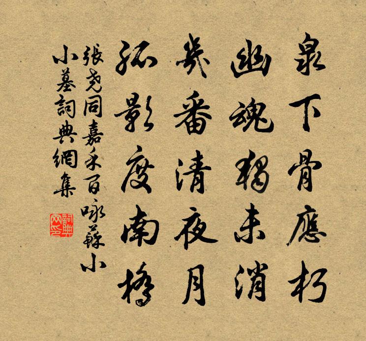 詩詞名句歷史字典書法欣賞書法字典國語詞典說文解字康熙字典古漢語字典標 題 作 者 詩 句 嘉禾百詠蘇小小墓作者:張堯同 朝代:宋代嘉禾百詠蘇小小墓原文泉下骨應朽,幽魂獨未消。幾番清夜月,孤影度南橋。詩詞問答問:嘉禾百詠蘇小小墓的作者是誰?答:張堯同問:嘉禾百詠蘇小小墓寫於哪個朝代?答:宋代張堯同嘉禾百詠蘇小小墓書法欣賞嘉禾百詠蘇小小墓書法作品詩詞推薦陳丞以南安寨上所得二詩及到龍泉聞余戍地最趙蕃〔宋代〕郴州何許是,山遠水仍多。江徼重重柵,田夫戶戶戈。雷同嗟不早,嘆我亦奔波。未必甘如此,而今敢謂何。寄衛拾遺乞酒姚合〔唐代〕老人罷卮酒,不醉已經年。自飲君家酒,一杯三日眠。味輕花上露,色似洞中泉。莫厭時時寄,須知法未傳。送郡守徐元傑〔宋代〕郎圍師閫重王人,朝績民庸簡帝宸。屈此偏州何小小,偉哉仁牧自肫肫。下車福十餘萬戶,褒璽朞三百六旬。廉恕貽張生齊己〔唐代〕日日見入寺,未曾含酒容。閒聽老僧語,坐到夕陽鍾。竹里行多影,花邊偶過蹤。猶言謝生計,隨我去孤峰。岳忠弄祠三首袁甫〔宋代〕背嵬軍馬戰無儔,壓盡當年幾列侯。先輩有聞多散軼,後生誰識發潛幽。傷心咄咄權臣事,滿眼滔滔債帥流。槌剝昭君怨(送人赴上庠)卓田〔宋代〕千里功名岐路。幾糹兩英雄草屨,八座與三台。箇中來。壯士寸心如鐵。有淚不沾離別。劍未斬樓蘭。莫空還。蚊子皮日休〔唐代〕隱隱聚若雷,噆膚不知足。皇天若不平,微物教食肉。貧士無絳紗,忍苦臥茅屋。何事覓膏腴,腹無太倉粟。送潘湖南二首趙蕃〔宋代〕名世公今第一流,百年端見幾人不。臨民不作子桑簡,好善鹹推樂正優。侍從近臣方妙選,林園勝事未宜休。曾聞宿江寺齊己〔唐代〕島僧留宿慰衰顏,舊住何妨老未還。身共錫聲離鳥外,跡同雲影過人間。曾無夢入朝天路,憶有詩題隔海山。珍重和南豐先生出山之作陳師道〔宋代〕側徑籃舁兩眼明,出山猶帶骨毛清。白雲笑我還多事,流水隨人合有情。不及鳥飛渾自在,羨他僧住便平生。未能頌古二十一首釋心月〔宋代〕奇特老尊宿,大無慚愧人。盤陀石上藕,喜見一番新。送撫倅林評事歸班許月卿〔宋代〕分月年將滿,朝天早戒嚴。芝函新紫詔,棘寺舊青氈。梅雨商岩識,槐花宰路占。應留等漏院,揮翰屬名賢。狂夫劉叉〔唐代〕大妻唱舜歌,小妻鼓湘瑟。狂夫遊冶歸,端坐仍作色。不讀關雎篇,安知后妃德。成相院王之道〔宋代〕山前羅萬松,邀我行數里。不知幽人居,便家亂峰峙。新晴翠似潑,乍熱汗如洗。幸獲聽潺湲,何妨濯清泚。觀諸北子射石孫七齡亦能二十四步四十的方岳〔宋代〕飽聞吾季藝穿楊,試手春風百步強。赤白羽飛低日月,東西朋立凜冰霜。共觀棲鵠如環堵,亦笑童烏敢擅場。莫計雍熙享先農六首佚名〔宋代〕明國紺壇,靈風肅然。登歌已闕,神馭將旋。道光帝籍,禮備公田。鑒茲躬家,永賜豈年。聽薛陽陶吹蘆管張祜〔唐代〕紫清人下薛陽陶,末曲新笳調更高。無奈一聲天外絕,百年已死斷腸刀。送何清賈主簿歸任梅堯臣〔宋代〕不遠水雲間,悠悠泝鷁還。分亭接雞犬,舉酒對河山。殘雪依荒磧,寒煙入暝灣。借人鸞枳嘆,一併在離顏。次呂居仁九日群集韻朱翌〔宋代〕衣冠交上郡,氣象有中州。九日一尊酒,千岩萬壑秋。星方聚吳分,魚已躍王舟。即事感今昔,乃情無去留。憂時青山買舟虞儔〔宋代〕落日千烏外,青山一望中。買舟群仆喜,兀坐與誰同。旅店孤煙起,田家曲港通。鷗盟暫時乞,又踏軟塵紅。名句推薦表獨立兮山之上,雲容容兮而在下;屈原《九歌》 食其食者不毀其器,食其實者不折其枝劉安及其門客《淮南子·說林訓》 鳥銜野田草,誤入枯桑里。李白《樹中草》 鞭影落春堤,綠錦鄣泥卷。納蘭性德《生查子·鞭影落春堤》 急來抱佛腳,閒時不燒香。施耐庵《水滸傳·第十七回》 同欲者相憎,同憂者相親。劉向《戰國策·中山·犀首立五王》 目之於色也,有同美焉。孟子《孟子·告子章句上·第七節》 桐葉晨飄蛩夜語。旅思秋光,黯黯長安路。陸游《蝶戀花·桐葉晨飄蛩夜語》 無言獨上西樓,月如鉤。寂寞梧桐深院鎖清秋。李煜《相見歡·無言獨上西樓》 碧水浩浩雲茫茫,美人不來空斷腸。李白《早春寄王漢陽》