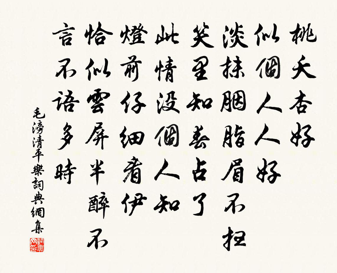 詩詞名句歷史字典書法欣賞書法字典國語詞典說文解字康熙字典古漢語字典標 題 作 者 詩 句 清平樂作者:毛滂 朝代:宋代清平樂原文桃夭杏好。似個人人好。淡抹胭脂眉不掃。笑里知春占了。此情沒個人知。燈前仔細看伊。恰似雲屏半醉,不言不語多時。詩詞問答問:清平樂的作者是誰?答:毛滂問:清平樂寫於哪個朝代?答:宋代問:清平樂是什麼體裁?答:詞問:毛滂的名句有哪些?答:毛滂名句大全毛滂清平樂書法欣賞清平樂書法作品詩詞推薦三聖殿陳良翰〔宋代〕巨鎮標閩越,靈蹤肇晉齊。空壇仙一去,古洞佛雙棲。化石龜猶在,燒丹井已迷。塵襟誰復悟,惟聽曉猿啼。頌古二十一首釋心月〔宋代〕鏡清湖心拋一餌,錦鱗躍浪上鉤來。幾乎掣斷午頭線,引得傍觀下釣台。初歸雜詠陸游〔宋代〕雪滿漁蓑雨墊巾,超然無處不清真。胸中那可有一事,天下故應無兩人。騎馬每行秋棧路,喚船還渡暮江津。酒樓驀山溪 賦崇福荷花,崇福在太原晉溪趙可〔元代〕雲房西下,天共滄波遠。走馬記狂游,正芙蕖、平鋪鏡面。浮空闌檻,招我倒芳尊,看花醉,把花歸,扶路清香滿南柯子譚處端〔元代〕雲去南山靜,風來渭水寒。凌波凝結一團團。萬里晴空,清爽此時觀。雄劍鳴開匣,人頭落玉盤。一輪明月上欄桿船子鈞灘葛天民〔宋代〕澤國茫茫水接天,孰雲無法與人傳。見成風月難迴避,盡在華亭一釣船。減字木蘭花吳則禮〔宋代〕斑斑小雨。初入高梧黃葉暮。又是重陽。昨夜西風作許涼。鮮鮮叢菊。只解凋人雙鬢綠。試傍清尊。分付幽香與斷頌古二十首釋了一〔宋代〕鐘樓上念贊,床腳下種菜。猛虎當路蹲,時人俱不會。黃蘗花開自有時,明州有個憨布袋。齊州送祖二(一作送別)王維〔唐代〕送君南浦淚如絲,君向東州使我悲。為報故人憔悴盡,如今不似洛陽時。謝皇太子三月十九日召晏榮觀堂,頒賜金杯襭楊萬里〔宋代〕春草池塘太液旁,水精宮殿牡丹香。慚非綺里攀鴻翼,也侍承華宴鳳莊。玉唾銀鉤看落筆,繡袍金碗拜盈箱。迎門句趙湘〔唐代〕天遠草離離。上十四吟十首劉克莊〔宋代〕兒縈薄宦女從夫,誰伴龐翁擁地爐。頗憶都嘗煨芋否,肯歸同賣漉籬無。春遊捉轡惟宗武,晨起稱觴僅阿奴。一句題城山晚對軒壁范成大〔宋代〕一枕清風夢綠蘿,人間隨處是南柯。也知睡足當歸去,不奈溪山留客何!提舉生辰仲並〔宋代〕東井遙觀盾日升,南風猶入舜弦鳴。鵬程九萬豈終息,椿歲八千方再榮。平世功名期鳳鳥,一時文采應長庚。浮瓜十月十五日觀月黃樓席上次韻蘇軾〔宋代〕中秋天氣未應殊,不用紅紗照座隅。山下白雲橫匹素,水中明月臥浮圖。未成短棹還三峽,已約輕舟泛五湖。為問次韻鄭夾漈題林時隱霆芹齋詩方翥〔宋代〕鄧侯牽挽政難留,六十年來亦倦遊。至竟眼高無俗韻,不因人喚始回頭。江湖白鳥緣應熟,塵土烏靴心少休。可笑苔徑釋善珍〔宋代〕苔徑長年斷俗蹤,亦無交舊可過從。閒憂頹墮自鉏菜,老尚怪奇惟種松。履破背時翻著襪,詩狂見月亂撞鐘。千年和顏長官百詠山居朱繼芳〔宋代〕擁樹溪雲迷近遠,低檐山果亂紅青。莫言身外都無事,早晚焚香看道經。書所見聞示諸友魏了翁〔宋代〕金繒啗虜已無謀,況恃空言廢內修。師卦在中惟九二,曾聞帷幄授成籌。題六和塔秀江亭張煒〔宋代〕秀江亭上駐吟懷,苔蘚軒窗四面開。潮怒挾風吹海立,櫨聲搖月下天來。浮漚世事等出沒,泛梗羈人幾去回。待寫名句推薦試問鄉關何處是,水雲浩蕩迷南北。趙鼎《滿江紅·丁未九月南渡泊舟儀真江口作》 欲祭疑君在,天涯哭此時。張籍《沒蕃故人》 野鴉無意緒,鳴噪自紛紛。杜甫《孤雁 / 後飛雁》 曾與美人橋上別,恨無訊息到今朝。劉禹錫《楊柳枝 / 柳枝詞》 不充詘於富貴,不遑遑於所欲。姚察、姚思廉《梁書·列傳·卷五十》 微風搖紫葉,輕露拂朱房。沈約《詠芙蓉》 道千乘之國,敬事而信,節用而愛人,使民以時。孔子弟子《論語·學而篇》 丈夫志四海,萬里猶比鄰。曹植《贈白馬王彪·並序》 始憐幽竹山窗下,不改清陰待我歸。錢起《晚春歸山居題窗前竹 / 暮春歸故山草堂詩》 兩鬢可憐青,只為相思老。晏幾道《生查子·關山魂夢長》