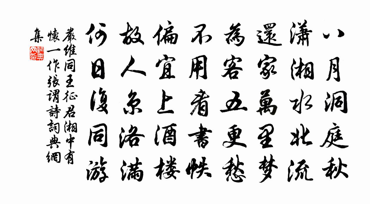 開篇一聯即扣緊題意,寫洞庭秋色。“八月洞庭秋”,對景興起,著重在點明時間。“瀟湘水北流”,抒寫眼前所見的空間景物,表面上沒有驚人之語,卻包孕了豐富的感情內涵:秋天本是令人善感多懷的季候,何況是家鄉在北方的詩人面對洞庭之秋。湘江北去本是客觀的自然現象,但多感的詩人聯想到自己還不如江水,久久地滯留南方。因此,這兩句是寫景,也是抒情,引發了下面的懷人念遠之意。頷聯直抒胸臆,不事雕琢,然而卻時間與空間交感,對仗工整而自然。“萬里夢”,點空間,魂飛萬里,極言鄉關京國之遙遠,此為虛寫:“五更愁”,點時間,竟夕縈愁,極言客居他鄉時憶念之殷深,此為實寫。頸聯宕開一筆,以正反夾寫的句式進一步抒發自己的愁情:在鄉愁的困擾下,翻開愛讀的書籍已然無法 * ,登酒樓而醉飲或者可以忘憂。這些含意詩人並沒有明白道出,但卻使人於言外感知。同時,詩人連用了“不用”、“偏宜”這種具有否定與肯定意義的虛字斡旋其間,不僅使人情意態表達得更為深婉有致,而且使篇章開合動宕,令句法靈妙流動。登樓把酒,應該有友朋相對才是,然而現在卻是詩人把酒獨酌,即使是“上酒樓”,也無法解脫天涯寂寞之感,也無法了結一個“愁”字。於是,尾聯就逼出“有懷”的正意,把自己的愁情寫足寫透。“故人京洛滿”的熱鬧與詩人獨處異鄉的冷清形成鮮明對照。在章法上,“京洛滿”和“水北流”相照,“同游”與“為客”相應,首尾環合,結體綿密。從全詩來看,沒有穠麗的詞藻和過多的渲染,信筆寫來,皆成妙諦,流水行雲,悠然雋永。
