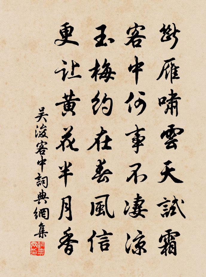 詩詞名句歷史字典書法欣賞書法字典國語詞典說文解字康熙字典古漢語字典標 題 作 者 詩 句 客中作者:吳浚 朝代:宋代客中原文斷雁嘯雲天試霜,客中何事不淒涼。玉梅約在春風信,更讓黃花半月香。詩詞問答問:客中的作者是誰?答:吳浚問:客中寫於哪個朝代?答:宋代吳浚客中書法欣賞客中書法作品詩詞推薦通叟年兄視以柳侯廟詩三首輒亦有作所謂增來晁說之〔宋代〕當世容讒賊,他年柰我何。文編興舊學,詩價重東坡。木槲開能幾,子規啼謾多。羅池碑字滅,猶解徹庭莎。諷諫歌蕭瑟瑟〔遼代〕勿嗟塞上兮暗紅塵,勿傷多難兮畏夷人;不如塞奸邪之路今,選取賢臣。直須臥薪嘗膽兮,激壯士之捐身,可以朝送蹇道士歸廬山蘇軾〔宋代〕物之有知蓋恃息,孰居無事使出入。心無天游室不空,六鑿相攘婦爭席。法師逃人入廬山,山中無人自往還。往者代門生作立春書門貼子詩四首范成大〔宋代〕日朋添收帙,湖山引杖藜。剩周花甲子,多醉玉東西。劉王花塢方信孺〔宋代〕綠陰到處小舟藏,淺水漂紅五里香。不見芳華舊亭宛,桃花應解笑劉郎。送周子靜葉適〔宋代〕地深湘渚浪,天遠桂陽城。故里楸花別,諸生柳絮迎。一夔開跡後,六舞待時行。子自調新律,吾衰閟舊聲。陳方大弟寵父將省侍潮陽以詩約別王邁〔宋代〕逆旅頻連風雨床,歸來蹤跡兩參商。誰知纏隔路三舍,不似相從天一方。壺山白認梅將雪,潮水黃知菊已霜。便去減字木蘭花黃庭堅〔宋代〕黔中士女游晴晝。花信輕寒羅袖透。爭尋穿石道宜男,更買江魚雙貫柳。竹枝歌好移船就。依倚風光垂翠袖。滿傾奉和趙王詩庾信〔南北朝〕花徑日相攜。花林鳥未棲。比看中郎醉。堪聞烏夜啼。豁然亭王之望〔宋代〕何處開軒檻,凌虛香靄間。胸中吞百粵,眼界抵三山。曉日賓滄海,秋潮俯碧灣。登臨一舒嘯,宇宙頓寬閒。和徐季功舒蘄道中二十首王之道〔宋代〕灊皖歸來麥已秋,相從時說白雲遊。八年不踐同安境,夢裡山溪記舊由。春江曲二首張仲素〔唐代〕家寄征河岸,征人幾歲游。不如潮水信,每日到沙頭。乘曉南湖去,參差疊浪橫。前洲在何處,霜里雁嚶嚶。壽傅憲李商叟〔宋代〕籍甚何陽地,江山秀色連。家聲自岩野,帝夢協台躔。彝鼎功鐫勒,衣冠喜接聯。相門當出相,賢父又生賢。歲必和帑院叔趙孟堅〔宋代〕久居朝跡遲遷次,雖在琴齋頗寂寥,交少自應無援拔,地寒安得有肥饒。桃花落處春風緊,梅蕊開時臘雪銷。畢竟錢儒珍家賞桂仇遠〔宋代〕客至當飲酒,醉此金粟堆。秋風何時到,叢樹參差開。馨香逆人鼻,蓓蕾藏聖胎。攀枝折其榮,落穗浮酒杯。後夜應天長楊 * 〔宋代〕夭桃弄粉,繁杏透香,依然舊日顏色。奈彼妒花風雨,連陰過寒食。金釵試尋妙客。正晝永、院深人寂。善歌更解送梵才大師歸天台傅瑩〔宋代〕結廬深山頂,遂懷安隱心。安隱如之何,道勝塵慮沈。青霞白雲致,茂樹修竹陰。悠然北山上,令人思重尋。途葉二絕杜范〔宋代〕腳踏京塵動數旬,歸途又復見書雲。群陰已放陽來復,看取新年別有春。再贈陳高眼二首姚勉〔宋代〕高眼先生本姓陳,閱人多矣妙通神。地爐傳得 * 法,恐是希夷身後身。立春前二日雪王禹偁〔宋代〕一夕滿淮海,莎階曉欲平。氣寒知臘在,勢猛共春爭。飄泊殘梅妬,龍鍾老檜擎。隨風無定態,入竹有繁聲。倚檻名句推薦人而無信,不知其可也。孔子弟子《論語·為政篇》 冷冷水向橋東去。漠漠雲歸溪上住。劉鎮《玉樓春·東山探梅》 寄相思,寒雨燈窗,芙蓉舊院。吳文英《宴清都·秋感》 去年元夜時,花市燈如晝。歐陽修《生查子·元夕》 叢菊兩開他日淚,孤舟一系故園心。杜甫《秋興八首·其一》 暗室虧心,神目如電。徐田臣《戲文·殺狗記》 清漏漸移相望久,微雲未接過來遲。李商隱《辛未七夕》 花谷依然,秀靨偷春小桃李。吳文英《荔枝香近·送人游南徐》 兒女此情同。往事朦朧。湘娥竹上淚痕濃。辛棄疾《浪淘沙·賦虞美人草》 昭君拂玉鞍,上馬啼紅頰。李白《王昭君二首》