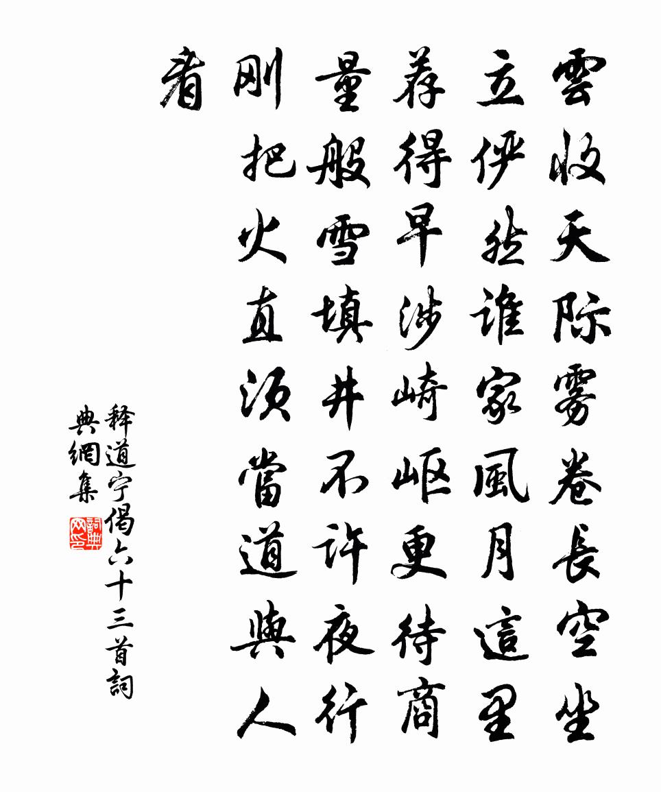 詩詞名句歷史字典書法欣賞書法字典國語詞典說文解字康熙字典古漢語字典標 題 作 者 詩 句 偈六十三首作者:釋道寧 朝代:宋代偈六十三首原文雲收天際,霧卷長空。坐立儼然,誰家風月。這裡薦得,早涉崎嶇。更待商量,般雪填井。不許夜行剛把火,直須當道與人看。詩詞問答問:偈六十三首的作者是誰?答:釋道寧問:偈六十三首寫於哪個朝代?答:宋代釋道寧偈六十三首書法欣賞偈六十三首書法作品詩詞推薦同臨漳紀明府孤雁盧照鄰〔唐代〕三秋違北雁。萬里向南翔。河洲花稍白,關塞葉初黃。避繳風霜勁,懷書道路長。水流疑箭動,月照似弓傷。橫夭新建秘書省呈李秘監曹勛〔宋代〕道山賢范久摧藏,聖德重興接耿光。招隱稍來周俊造,紬書行見漢文章。掛檐玉榜昭新渥,插架芸簽識舊香。喜見無相贊釋師範〔宋代〕重如山,靜如水。輕輕觸著,雙眉剔起。偈六十九首釋道寧〔宋代〕子只見風清月白,焉知洞裡花香。曾看江上弄潮人,未聞愛水嫌波浪。人慾李商隱〔唐代〕人慾天從竟不疑,莫言圓蓋便無私。秦中已久烏頭白,卻是君王未備知。十三四用喜雪韻四首吳潛〔宋代〕雪邊好景說涵虛,欲往從之掣簿書。王道平平須有象,皇風浩浩恐無初。舉遮正恐渠難耐,罷掃緣憂彼作疎。翠浪題桃源圖錢選〔宋代〕始信桃源隔幾秦,後來無復問津人。武陵不是花開晚,流到人間卻暮春。送別呂令聖與楊萬里〔宋代〕一門三相千子孫,後有公家前諸袁。有治國譜無縣譜,種愛在堂銘在門。誰能不徼鬻爵恩,民乃不識田畝錢。姓名歲晚相與饋問為饋歲酒食相邀呼為別歲至除夜蘇軾〔宋代〕思歸而不可得故為此三詩寄子由饋歲農功各已收,歲事得相佐。為歡恐無具,假物不論貨。山川隨出產,貧富稱小句嚴中和〔宋代〕畫扇題詩鸞背濕,銅彝煎腦鴨心香。己丑二月三日大風雨雪 其二王冕〔元代〕今年二月氣候別,十日大雪寒於冬。民人正坐凍餒苦,燕雀如何意味濃?風俗可知南北早,山河空鎖百千重。草堂六月六日夜陳與義〔宋代〕蘊隆豈不壞,涼氣亦徐還。獨立清夜半,疏星蒼檜間。晦明莽相代,天地本長閒。四顧何寥落,微風時動關。張持道生辰三首郭印〔宋代〕妙喜生摩詰,長庚夢謫仙。寶階三道降,涼月九分圓。黑髮功名地,紅塵世俗緣。乾坤思整頓,休慕竹林賢。栝城林景熙〔宋代〕寒芒曾動少微星,一水溶溶疊嶂橫。落日漁舟吹遠笛,斷煙戍屋帶荒城。沙鷗欲近如招隱,關樹無多亦厭兵。卻憶秋日侍宴婁苑湖應詔詩江總〔隋代〕翠渚還鑾輅。瑤池命羽觴。千門響雲蹕。四澤動榮光。玉軸昆池浪。金舟太液張。虹旗照島嶼。鳳蓋繞林塘。野靜浣溪沙·霜日明霄水蘸張孝祥〔宋代〕霜日明霄水蘸空。鳴鞘聲里繡旗紅。淡煙衰草有無中。 萬里中原烽火北,一尊濁酒戍樓東。酒闌揮淚向悲風。望海亭袁正規〔宋代〕沆瀣亭前景最豪,委輸江漢任滔滔。盪雲處處千層浪,沃日重重萬里濤。析木有津連地下,蓬萊堆玉插天高。飄然送句容王少府簿領赴上都權德輿〔唐代〕上國路綿綿,行人候曉天。離亭綠綺奏,鄉樹白雲連。江露濕征袂,山鶯宜泊船。春風若為別,相顧起尊前。二月二十四日至魏塘七首張嵲〔宋代〕今朝今撤窗前柵,決眥雙鳧沒綺塍。便是提封無限界,不憂閩陌誤東陵。壽湖南宗憲五首廖行之〔宋代〕湘俗日窳敝,嗜惡甘如飴。良心豈初然,物慾或迫之。經正 * 興,靡事窮誅夷。桑麻遂生業,四海治可推。名句推薦綠葉翠莖,冒霜停雪。左思《三都賦》 玉樓天半起笙歌,風送宮嬪笑語和。顧況《宮詞五首·其二》 恨舊愁新。有淚無言對晚春。淮上女《減字木蘭花·淮山隱隱》 君子修道立德,不謂窮困而改節佚名《孔子家語·在厄》 千里之馬時一有,其利緩;駑馬日售,其利急。韓非及後人《韓非子·說林下》 三冬暫就儒生學,千耦還從父老耕。陸游《觀村童戲溪上》 錦里開芳宴,蘭缸艷早年。盧照鄰《十五夜觀燈》 蕙風如薰,甘露如醴。左思《三都賦》 城邊有古樹,日夕連秋聲。李白《沙丘城下寄杜甫》 渡頭餘落日,墟里上孤煙。王維《輞川閒居贈裴秀才迪》