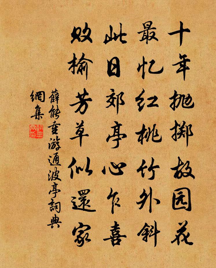 詩詞名句歷史字典書法欣賞書法字典國語詞典說文解字康熙字典古漢語字典標 題 作 者 詩 句 重遊通波亭作者:薛能 朝代:唐代重遊通波亭原文十年拋擲故園花,最憶紅桃竹外斜。此日郊亭心乍喜,敗榆芳草似還家。詩詞問答問:重遊通波亭的作者是誰?答:薛能問:重遊通波亭寫於哪個朝代?答:唐代問:重遊通波亭是什麼體裁?答:七絕薛能重遊通波亭書法欣賞重遊通波亭書法作品注釋全唐詩:卷561-64詩詞推薦題汪水雲詩卷嚴日益〔宋代〕紫皇宮殿紅雲低,春歸天上日欲西。瑤池催花撾羯鼓,姚魏在香分雨露。沉香亭北雉尾高,詩成先奪雲錦袍。縱橫樓居狂吟吳龍翰〔宋代〕偃月爐深紫氣浮,紅鉛黑汞六丹頭。梅翁欲挹浮丘訣,顓為黃山作此樓。寓言三首·其三李白〔唐代〕長安春色歸,先入青門道。綠楊不自持,從風欲傾例。海燕還秦宮,雙飛入簾櫳。相思不相見,託夢遼城東。丙辰季夏避暑山中長松修竹恍若蓬萊異人之居釋斯植〔宋代〕六月厭煩襟,縱步情未足。愛此石徑長,緲緲清溪曲。古道何人居,門頭對修竹。好鳥發新聲,靜極成幽獨。山風齊天樂(同前)曹勛〔宋代〕芙蓉凝露青霞護,朝日綺疏風細。正是中秋,時候喜逢,中宮蔥蔥佳氣。雲龍慶會。贊真主當陽,輔成天地。暇日寄秋懷趙蕃〔宋代〕兩月巴陵郡,搜詩朝暮間。空能飲江水,恨不上君山。昔者聞何至,今焉興盡還。才名或遭罵,坎軻分低顏。雜詩二首孔融〔兩漢〕岩岩鐘山首,赫赫炎天路。高明曜雲門,遠景灼寒素。昂昂累世士,結根在所固。呂望老匹夫,苟為因世故。管仲逍遙詠宋太宗〔宋代〕知之修練但辛勤,苦志由來離六塵。金鼎乍分紅燄火,月魂高鎖碧潭津。深思五嶺凡間路,好作三天物外人。萬里和陳君儀讀太真外傳五首黃庭堅〔宋代〕梁州一曲當時事,記得曾拈玉笛吹。端正樓空春晝永,小桃猶學淡燕支。渡揚子江丁仙芝〔唐代〕桂楫中流望,空波兩岸明。林開揚子驛,山出潤州城。海盡邊陰靜,江寒朔吹生。更聞楓葉下,淅瀝度秋聲。寄隱靜山懷賢長老梅堯臣〔宋代〕山有枇杷樹,樹多獼猴群。高僧心不著,一似五峰雲。隨飈來溪口,石上起氤氳。果熟獼猴去,自向瀑澗分。偈頌一百零二首釋紹曇〔宋代〕是是,荊棘叢林,黃金田地。非非,伊蘭旃蔔,甘露蒺藜。是不是,非不非,鶴健將雛去,猿閒抱子歸。又觀打魚杜甫〔唐代〕蒼江魚子清晨集,設網提綱萬魚急。能者操舟疾若風,撐突波濤挺叉入。小魚脫漏不可記,半死半生猶戢戢。大魚秋江四絕滕岑〔宋代〕風色蕭蕭日色晴,晚潮未到水波平。系槎艇子關蓬睡,不管溪南喚渡聲。題龍鶴菜帖陸游〔宋代〕先生直玉堂,日羞太官羊。如何夢故山,曉枕春蔬香?春蔬尚云爾,況我舊朋友。萬里一紙書,殷勤問安否。先生禪人寫真請贊十二首釋曇華〔宋代〕波濤千尺冷颼颼,誰向滄溟泛逆流。唯有渠儂諳水脈,卷舒出沒任遨遊。淳祐祭海神十六首佚名〔宋代〕南溟浮天,旁通百茲。風檣迅疾,琛舶來還。民商永賴,坐消寇奸。薦茲嘉觴,弭矣驚潤。寄張君玉喻良能〔宋代〕橘亭一別五回冬,寤寐何曾置此翁。二十五聲秋後點,八千里外月明中。夫君不寄平安信,而我方棲簿領叢。三峽酬謝謙山所寄張埴〔宋代〕老農群兒去聚沙,不知桃子結西華。歸來鄉井半鬼錄,依舊湖山一會家。白蓋年深蝸浼浼,綠陰人靜鵲槎槎。江流天寒晚起引酌詠懷寄許州王尚書汝州李常侍白居易〔唐代〕葉覆冰池雪滿山,日高慵起未開關。寒來更亦無過醉,老後何由可得閒?四海故交唯許汝,十年貧健是樊蠻。相思名句推薦無情不似多情苦。一寸還成千萬縷。晏殊《玉樓春·春恨》 江南無所有,聊贈一枝春。陸凱《贈范曄詩》 痴兒不知父子禮,叫怒索飯啼門東。杜甫《百憂集行》 向來冰雪凝嚴地,力斡春回竟是誰?陸游《落梅》 君子內省不疚,無惡於志。君子之所不可及者,其唯人之所不見乎。子思《中庸·第三十三章》 東風動百物,草木盡欲言。李白《長歌行》 隔戶楊柳弱裊裊,恰似十五女兒腰。杜甫《絕句漫興九首·其一》 鳥雀呼晴,侵曉窺檐語。周邦彥《蘇幕遮·燎沉香》 孝當竭力,忠則盡命。周興嗣《千字文·全文》 千磨萬擊還堅勁,任爾東西南北風。鄭燮《竹石》
