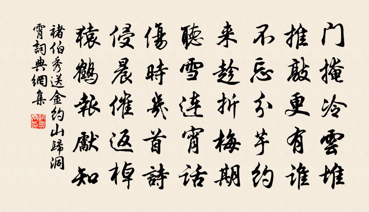詩詞名句歷史字典書法欣賞書法字典國語詞典說文解字康熙字典古漢語字典標 題 作 者 詩 句 送金約山歸洞霄作者:褚伯秀 朝代:宋代送金約山歸洞霄原文門掩冷雲堆,推敲更有誰。不忘分芋約,來趁折梅期。聽雪連宵話,傷時幾首詩。侵晨催返棹,猿鶴報先知。詩詞問答問:送金約山歸洞霄的作者是誰?答:褚伯秀問:送金約山歸洞霄寫於哪個朝代?答:宋代褚伯秀送金約山歸洞霄書法欣賞送金約山歸洞霄書法作品詩詞推薦答王定國問疾蘇轍〔宋代〕五年竄南荒,頑質不伏病。吸清吐濁穢,氣練骨隨勁。澹然久忘歸,寂寂就遐屏。國恩念流落,牽挽畀鄰境。葉舟夜宿靈台寺寄郎士元錢起〔唐代〕西日橫山含碧空,東方吐月滿禪宮。朝瞻雙頂青冥上,夜宿諸天 * 中。石潭倒獻蓮花水,塔院空聞松柏風。萬里圩丁詞十解楊萬里〔宋代〕圩上人牽水上航,從頭點檢萬農桑。即非使者秋行部,乃是圩翁曉挼莊。黃檗覽秀閣和韻黃祖舜〔宋代〕飛閣凌雲翠,幽尋一徑微。峰巒長競秀,煙水莽相圍。景色塵囂外,詩情領略歸。標題屬大手,價重勝留衣。次韻和君貺會趙叔平少師元絳〔宋代〕黃髮逍遙並舊臣,燕間加意占先春。成龍天外惟三友,積雪筵中止數人。昔日薦才聞最課,當年誦賦得魁倫。會須玉蝴蝶晁補之〔宋代〕暗憶少年豪氣,爛南國、蓬島風光。醉倚吳王宮殿,不解悲涼。舞猶慵、小腰似柳,歌尚怯、嬌語如簧。好林塘。四明山中十絕木蘭戴表元〔宋代〕七里黃泥紅樹岡,西風果熟一村香。居人只道山深好,三百年來是戰場。西平樂慢/西平樂吳文英〔宋代〕岸壓郵亭,路敧華表,堤樹舊色依依。紅索新晴,翠陰寒食,天涯倦客重歸。嘆廢綠平煙帶苑,幽渚塵香盪晚,當子禮和道者寮古詩復遣一絕鄭剛中〔宋代〕蒼璧方漸白鹿皮,瓊瑤更似木瓜詩。從來持得吟詩戒,此是愚翁破戒時。織圖二十四首經樓璹〔宋代〕素絲頭緒多,羨君好安排。青鞋不動塵,緩步交去來。眽眽意欲亂,眷眷首重回。王言正如絲,亦付經綸才。宮詞一百首岳珂〔宋代〕圍場望幸絕長楊,汴水塵高御柳黃。成姓爭傳天子聖,新來有旨罷鷹坊。酬令狐相公雪中游玄都見憶劉禹錫〔唐代〕好雪動高情,心期在玉京。人披鶴氅出,馬踏象筵行。照耀樓台變,淋漓松桂清。玄都留五字,使入步虛聲。五月齋戒,罷宴徹樂,聞韋賓客、皇甫郎中飲白居易〔唐代〕妓房匣鏡滿紅埃,酒庫封瓶生綠苔。居士爾時緣護戒,車公何事亦停杯。散齋香火今朝散,開素盤筵後日開。隨意胡笳十八拍十八首王安石〔宋代〕春風似舊花仍笑,人生豈得長年少。我與兒兮各一方,憔悴看成兩鬢霜。如今豈無騕褭與驊騮,安得送我置汝傍。山家李檝〔宋代〕日長無客到山家,蘚暈封苔一逕斜。睡美不知中夜雨,起來驚落半岩花。豳州文同〔宋代〕昔年戎馬盡南豳,今日風光已太文。雅吹夜喧金府月,靚妝春艷玉峰雲。泉亭柳色濃將滴,水寨荷香遠更薰。邏候題洛陽觀音院牡丹李建中〔宋代〕花譜名將第一論,洛中最是此花繁。不當更道木芍藥,枝上恐傷妃子魂。送制機豐德馨赴堂召二首李曾伯〔宋代〕元佑豐家幾世孫,依然風概至今存。著鞭自許河南逖,舉酒相期洛北溫。聯句有詩留月觀,御戎何策告天閽。切毋三言擬五雜組二首顏真卿〔唐代〕五雜組,繡與錦。往復還,興又寢。不得已,病伏枕。五雜組,甘鹹醋。往復還,烏與兔。不得已,韶光度。通山李傳正〔宋代〕我愛愛羊好,清無一點塵。峭山多洞戶,樵牧識仙人。名句推薦珍重主人心,酒深情亦深。韋莊《菩薩蠻·勸君今夜須沈醉》 聞道故林相識多,罷官昨日今如何李頎《送陳章甫》 宴爾新婚,以我御窮。佚名《谷風》 萬里乘雲去復來,隻身東海挾春雷。秋瑾《黃海舟中日人索句並見日俄戰爭地圖》 我來圯橋上,懷古欽英風。李白《經下邳圯橋懷張子房》 酒未開樽句未裁,尋春問臘到蓬萊。曹雪芹《訪妙玉乞紅梅》 目送征鴻飛杳杳,思隨流水去茫茫。孫光憲《浣溪沙·蓼岸風多橘柚香》 易漲易退山溪水,易反易覆小人心。佚名《增廣賢文·上集》 言不可盡信,必揆諸理;事未可遽行,必問諸心。王永彬《圍爐夜話·第二OO則》 過五關,斬六將馮夢龍《喻世明言·卷三十一》
