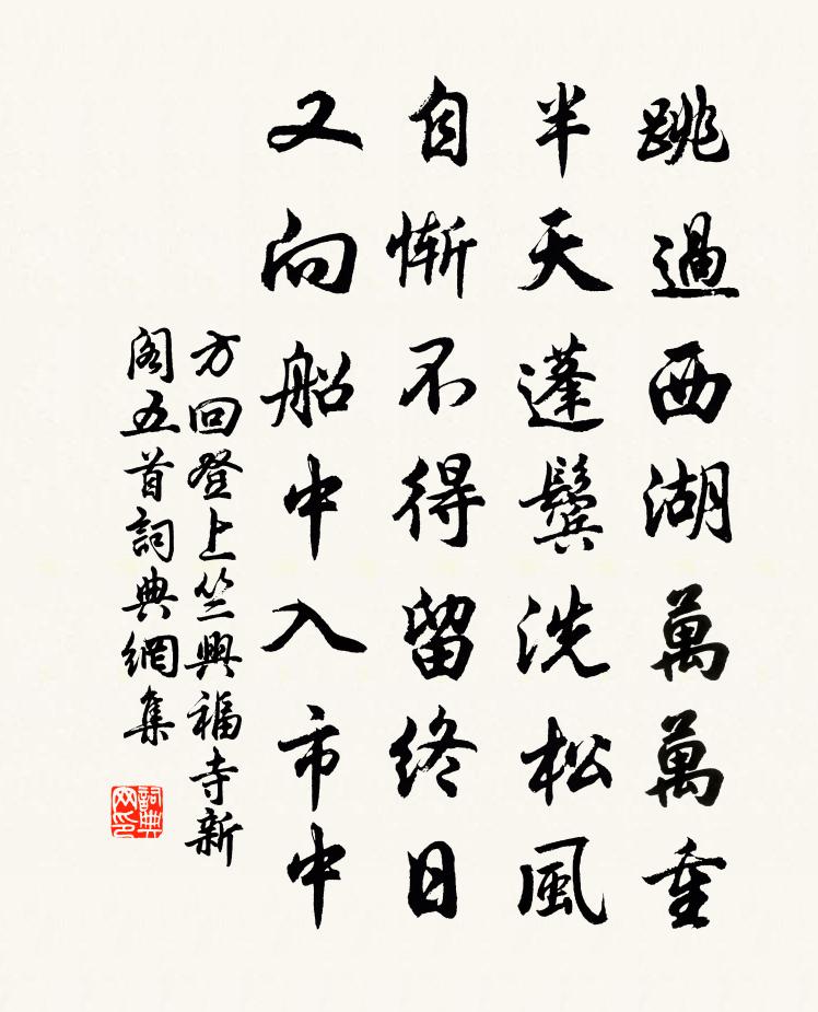 詩詞名句歷史字典書法欣賞書法字典國語詞典說文解字康熙字典古漢語字典標 題 作 者 詩 句 登上竺興福寺新閣五首作者:方回 朝代:宋代登上竺興福寺新閣五首原文跳過西湖萬萬重,半天蓬鬢洗松風。自慚不得留終日,又向船中入市中。詩詞問答問:登上竺興福寺新閣五首的作者是誰?答:方回問:登上竺興福寺新閣五首寫於哪個朝代?答:宋代方回登上竺興福寺新閣五首書法欣賞登上竺興福寺新閣五首書法作品詩詞推薦汪起潛謝送唐詩用韻再送劉滄小集陳起〔宋代〕二年不覿盂山賢,戌客打門驚幽禪。手持姑溪之雙鯉,中藏片玉龍鸞鐫。弘璧天球匠意古,未數大曆郎與錢。自非望江南陳允平〔宋代〕嬌滴滴,聰B62B在秋波。六幅香裙拖細縠,一鉤塵襪翦輕羅。春意動人多。臨寶鑑,石黛拂修蛾。燕子樓頭蝴蜘蛛釋普濟〔宋代〕一絲掛得虛空住,百憶絲頭殺氣生。上下四維羅織了,一無漏綱話方行。夏日感舊陸游〔宋代〕五侍仙祠兩掛冠,此生略有半生閒。嘯歌雨笠煙蓑底,來往山村縣郭間。一粒何當換凡骨,數杯且復駐頹顏。胡塵偈頌一百零二首釋紹曇〔宋代〕仙苑名花取次妝,冬冬羯鼓謾催芳。春風不費纖毫力,拂掠枝頭便有香。玉交枝/憶秦娥佚名〔宋代〕蕙子蘭孫小樣兒。化工簇就寄南枝。笑他蘭蕙,雖韻帶輕肥。香靄紫檀和霧重,色攢黃蠟界金徽。有人瀟灑,插向寄周子察院楊萬里〔宋代〕向者豺當路,如今虎在山。百年諸老盡,一段好風還。誰謂永嘉末,人猶慶曆間。班心公定可,更可押廷班。虎丘勸農虞儔〔宋代〕風月聯翩別駕分,雙鳧飛舄總能文。苔痕點綠山頭石,花影浮紅水面雲。一舸鴟夷聊爾爾,千岩啼鳥自欣欣。徘徊寄袁皓侍郎羅隱〔唐代〕東台失路岐,榮辱事堪悲。我寢牛衣敝,君居豸角危。風塵慚上品,才業愧明時。千里芙蓉幕,何由話所思。日中吟邵雍〔宋代〕日中為噬嗑,交易是尋常。彼各不相識,何復更思量。留別徐斯遠時斯遠將赴朱晦庵之約三首趙蕃〔宋代〕君質故甚美,加之仍得師。今為李君御,何後老人期。念欲通名姓,還憂辱棄遺。何當武夷下,與子共追隨。無弦琴顧逢〔宋代〕三尺孤桐古,其中趣最優。只須從意會,不必以聲求。袖手時橫膝,忘言自點頭。孫登猶未悟,多卻一絲留。和陶擬古九首蘇軾〔宋代〕少年好遠遊,盪志隘八荒。九夷為藩籬,四海環我堂。盧生與若士,何足期渺茫。稍喜海南州,自古無戰場。奇峰奉和虢州劉給事使君三堂新題二十一詠鏡潭韓愈〔唐代〕非鑄復非熔,泓澄忽此逢。魚蝦不用避,只是照蛟龍。游洞宵汪立中〔宋代〕洞天福地萃名山,我喜登臨昔所慳。五殿香嚴如在帝,九山青銷若為關。岩前鳴鳳當年事,野外驤龍反掌間。自顧怨春郎歐陽修〔宋代〕為伊家,終日悶。受盡恓惶誰問。不知不覺上心頭,悄一霎身心,頓也沒處頓。惱愁腸,成寸寸。已恁莫把人縈損雜劇·好酒趙元遇上皇高文秀〔元代〕第一折(外扮孛學老同卜兒、搽旦上)(孛老雲)發若銀絲兩鬢秋,老來腰曲便低頭。月過十五光明少,人過中年歸自南康寄懷朱使君李呂〔宋代〕過盡重湖復過山,陰凝忽變雪花團。路迷曲折易成遠,風助橫斜巧送寒。憶昨片帆離渡口,特煩千騎駐江乾。如今玉山嶺上作皇甫曾〔唐代〕悠悠驅匹馬,征路上連岡。晚翠深雲竇,寒台淨石樑。秋花偏似雪,楓葉不禁霜。愁見前程遠,空郊下夕陽。喜雨虞儔〔宋代〕雲氣翻車蓋,天河注瓦溝。滂沱三日雨,登濟一年秋。旱火掃無跡,狂雷怒不收。腐儒營一飽,卒歲恐優遊。名句推薦曲屏先暖鴛衾慣,夜寒深、都是思量。吳文英《風入松·為友人放琴客賦》 近水樓台先得月,向陽花木易為春。蘇麟《斷句》 獨自淒涼還自遣,自製離愁。龔自珍《浪淘沙·寫夢》 貂不足,狗尾續。房玄齡《晉書·列傳·第二十九章》 春城無處不飛花,寒食東風御柳斜。韓翃《寒食 / 寒食日即事》 燕子來時新社,梨花落後清明。晏殊《破陣子·春景》 爭奈愁來,一日卻為長賀鑄《行路難·縛虎手》 敕勒川,陰山下。天似穹廬,籠蓋四野佚名《敕勒歌》 竹馬踉蹡沖淖去,紙鳶跋扈挾風鳴。陸游《觀村童戲溪上》 疑怪昨宵春夢好,元是今朝鬥草贏晏殊《破陣子·春景》
