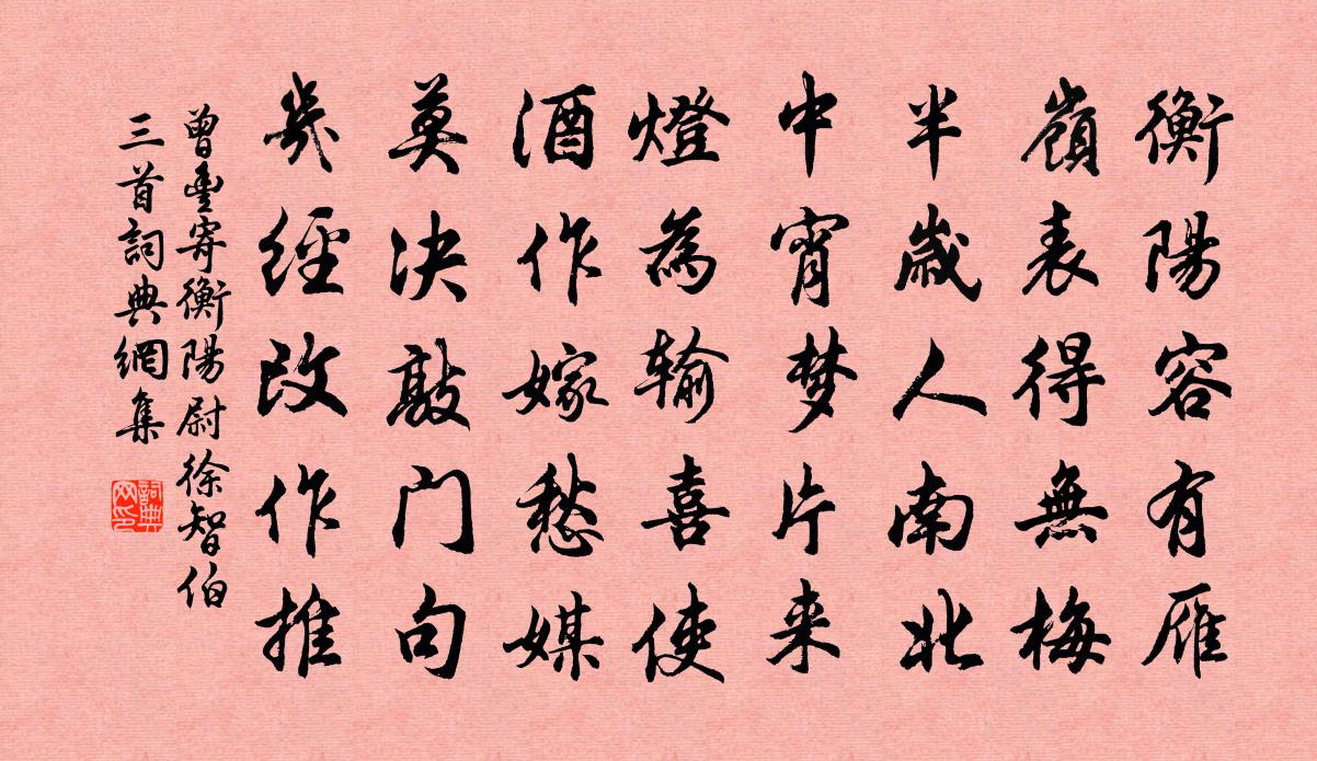 詩詞名句歷史字典書法欣賞書法字典國語詞典說文解字康熙字典古漢語字典標 題 作 者 詩 句 寄衡陽尉徐智伯三首作者:曾豐 朝代:宋代寄衡陽尉徐智伯三首原文衡陽容有雁,嶺表得無梅。半歲人南北,中宵夢片來。燈為輸喜使,酒作嫁愁媒。莫決敲門句,幾經改作推。詩詞問答問:寄衡陽尉徐智伯三首的作者是誰?答:曾豐問:寄衡陽尉徐智伯三首寫於哪個朝代?答:宋代曾豐寄衡陽尉徐智伯三首書法欣賞寄衡陽尉徐智伯三首書法作品詩詞推薦送趙叔靜教授閩中四首陳傅良〔宋代〕烱烱出萬壑,冰壺縣清秋。孰與玉瓚中,穆然養黃流。孤松高半天,蘭芷復過幽。看君最雍容,柰何短自謀。訴衷情·送春万俟詠〔宋代〕一鞭清曉喜還家。宿醉困流霞。夜來小雨新霽,雙燕舞風斜。山不盡,水無涯。望中賒。送春滋味,念遠情懷,分稽山行陸游〔宋代〕稽山何巍巍,浙江水湯湯,千里亘大野,勾踐之所荒。春雨桑柘綠,秋風粳稻香。村村作蟹椴,處處起魚梁。陂放戒飲三詩陳造〔宋代〕中古避世者,或以飲自名。世網未易脫,顛眩寧其情。嗟哉竹林子,嚌茹日瓶甖。時既謝周漢,顧肯羨久生。中聖泛舟和持國梅堯臣〔宋代〕綠源去未窮,夾岸樹蒙蒙。弱蔓低侵水,殘芳不隱叢。浣衣思越婦,折筍擬江童。薄暮回船處,潭魚動鏡中。和松坡劉迂詩二首廖行之〔宋代〕碌碌隨人未足旌,折腰趨走太清生。絕憐抗直陳公子,晚欲憑書入帝城。贈陳虞卿蔣堂〔宋代〕寵秩拜春坊,歸休識慮長。掃門卑魏勃,設醴謝元王。一水蓴鱸國,群山橘柚鄉。喜群添老社,煙駕尚徜徉。禪人並化主寫真求贊釋正覺〔宋代〕個住山人,平生慣貧。寒枯青嶂骨,閒淡白雲身。無影樹頭兮露鶴夢月,不萌枝上兮華蜂採春。開歲半月湖村梅開無餘偶得五詩以煙濕落梅村陸游〔宋代〕斗柄忽東指,開盡湖邊梅,偉觀天下無,四顧雪千堆。時至當歛退,勿受曉角催。安知桃李輩,於子無嫌猜?小園即事五首劉克莊〔宋代〕稍轉陽和解積陰,暫停湯熨事微吟。翠禽娛客有佳哢,金鯽知人無殺心。一片不留花著樹,數竿忽見筍成林。野蹊種植詩張嵲〔宋代〕魏塘草樹環佛宮,兩春不識花白紅。但有柳絮迷晴空,今年始種木芙蓉。間以寒菊助丰容,新栽黃葵已蒙茸。坐待四和劉克莊〔宋代〕亂書案上慵料理,長物齋中悉屏除。乍可假□□□甫,安能佞佛把隨如。虎皮晚歲羞爭席,豹尾當年扈屬車。冬暖句劉接〔宋代〕湛湛直通龍渡水,虢虢傍過鹿頭山。【雙調】碧玉簫(十首)關漢卿〔元代〕一黃召風虔,蓋下麗春園。員外心堅,使了販茶船。金山寺心事傳,豫章城人月圓。蘇氏賢,嫁了雙知縣。天,稱和表之清陰亭作李彌遜〔宋代〕西山朝來多爽氣,露沐風梳發新翠。泄雲無力占山腰,初日分光上山背。遠山蒼茫近山紫,四面鐘魚談佛事,人間鷓鴣天 村里黃幡綽,家中白侍郎,石曼卿詩元好問〔金代〕總道狙公不易量。朝三暮四盡無妨。舊時鄴下劉公幹,今日家中白侍郎。歌浩蕩,酒淋浪。浮雲身世兩相忘。孤峰雲門寺西六七里聞符公蘭若最幽與薛八同往①孟浩然〔唐代〕謂余獨迷方,逢子亦在野。結交指松柏,問法尋蘭若。小溪劣容舟,怪石屢驚馬。②所居最幽絕,所住皆靜者。密閉門徐夤〔唐代〕閉卻閒門臥小窗,更何人與療膏肓。一生有酒唯知醉,四大無根可預量。骨冷欲針先覺痛,肉頑頻灸不成瘡。漳濱月蝕方岳〔宋代〕老兔酣眠一夜霜,妖蟆健啖未渠央。人間今欠玉川子,生語聱牙滿世香。放舟風復不順,再泊馬當,對岸夾中馬當水府范成大〔宋代〕萬里江隨倦客東,馬當山嘴勒孤篷。無才解賦珠簾雨,誰肯相賒一席風。名句推薦鏡水夜來秋月,如雪。溫庭筠《荷葉杯·鏡水夜來秋月》 四海皆兄弟,誰為行路人。佚名《舊題蘇武詩 / 別詩四首·其一》 故木受繩則直,金就礪則利,君子博學而日參省乎己,則知明而行無過矣。荀子《荀子·勸學》 誰念西風獨自涼,蕭蕭黃葉閉疏窗,沉思往事立殘陽。納蘭性德《浣溪沙·誰念西風獨自涼》 不信妾斷腸,歸來看取明鏡前。李白《長相思·其二》 花徑不曾緣客掃,蓬門今始為君開。杜甫《客至》 漢兵已略地,四方楚歌聲。虞姬《和項王歌》 長歌吟松風,曲盡河星稀。李白《下終南山過斛斯山人宿置酒》 不語含嚬深浦里,幾回愁煞棹船郎,燕歸帆盡水茫茫。薛昭蘊《浣溪沙·紅蓼渡頭秋正雨》 千載琵琶作胡語,分明怨恨曲中論。杜甫《詠懷古蹟五首·其三》