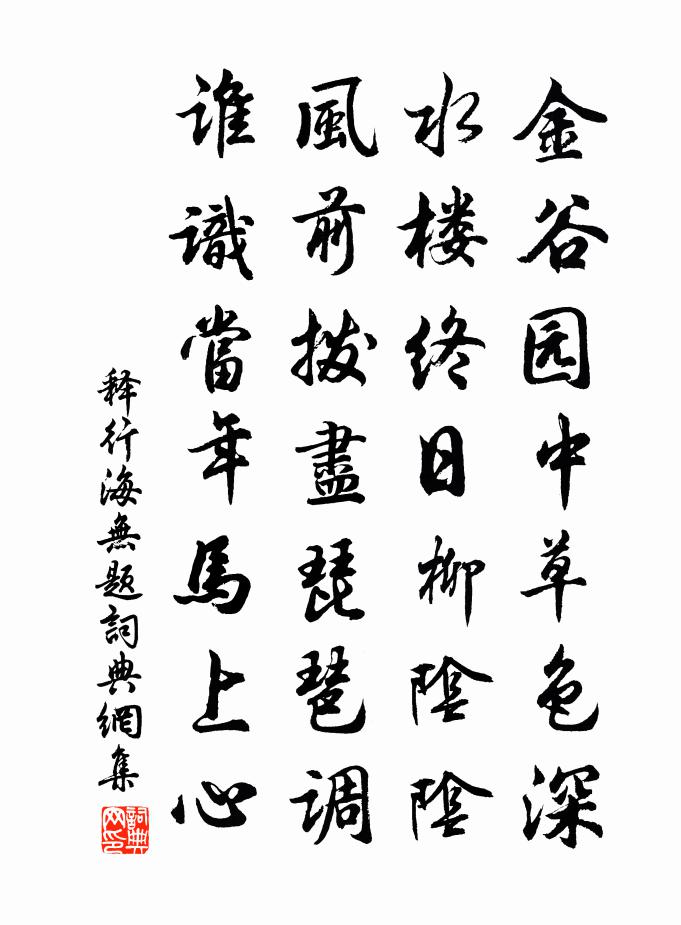 詩詞名句歷史字典書法欣賞書法字典國語詞典說文解字康熙字典古漢語字典標 題 作 者 詩 句 無題作者:釋行海 朝代:宋代無題原文金谷園中草色深,水樓終日柳陰陰。風前撥盡琵琶調,誰識當年馬上心。詩詞問答問:無題的作者是誰?答:釋行海問:無題寫於哪個朝代?答:宋代釋行海無題書法欣賞無題書法作品詩詞推薦元夕大風雨范成大〔宋代〕河傾海立夜翻盆,不獨妨燈更損春。凍澀笙簧猶可耐,滴皴梅頰勢須嗔。金剛隨機無盡頌一合相理分第三十釋印肅〔宋代〕剎剎波搖影,那個明心鏡。大海一浮漚,漚破方消醒。古風其二十九李白〔唐代〕三季分戰國。七雄成亂麻。王風何怨怒。世道終紛拏。至人洞玄象。高舉凌紫霞。仲尼欲浮海。吾祖之流沙。聖賢相和歌辭。長門怨岑參〔唐代〕君王嫌妾妒,閉妾在長門。舞袖垂新寵,愁眉結舊恩。綠錢侵履跡,紅粉濕啼痕。羞被夭桃笑,看春獨不言。書意陸游〔宋代〕萬事馬牛風,蕭然破屋中。忍貧增力量,耐辱見神通。道進天魔散,心安客疾空。微言施魚鳥,一一脫池籠。游東山李流謙〔宋代〕軒自岧嶢稱,欄因杳靄橫。客魂搖鳥影,醉耳入江聲。失喜過門屐,沾衿越席箏。東山懷謝傅,憂樂總關情。情詩其十一倉央嘉措〔清代〕洞房一夜照花燭,卿卿嫁作他人婦。相思如狂心如灰,為情憔悴向誰訴?王子猷返棹處王銍〔宋代〕我家住在剡溪曲,萬壑千山看不足。卻笑當年訪戴人,雪夜扁舟去何速。再用前韻答徐聖可仲並〔宋代〕乃翁儒學似文翁,韻句天然無異同。社稷堂堂推故相,家庭挺挺見遺風。詞場已擅千軍敵,詩律仍驚萬馬空。願報借笠澤叢書於陳長卿以詩還之王洋〔宋代〕親見子云豸不揚,遲以歲月名自彰,松江笠澤幾多地,古今三作勝士場。鴟夷已去乘海航,季鷹撫事驚秋霜。五百宴桃源/如夢令周紫芝〔宋代〕綠盡小池芳草。門外柳垂春晝。花上雨廉纖,簾幕燕來時候。消瘦。消瘦。依約粉香襟袖。西郊杜甫〔唐代〕時出碧雞坊,西郊向草堂。市橋官柳細,江路野梅香。傍架齊書帙,看題減藥囊。無人覺來往,疏懶意何長。紹定三年壽明仁福睿皇太后冊寶九首佚名〔宋代〕煌煌儀物,繹繹鼓鍾。奉茲寶冊,至於階東。上公相德,列辟盡恭。拜手慈宸,福如華高。秋日再寄晁采〔唐代〕珍簟生涼夜漏餘,夢中恍惚覺來初。魂離不得空成病,面見無由浪寄書。窗外江村鐘響絕,枕邊梧葉雨聲疏。此時和張丞相春朝對雪孟浩然〔唐代〕迎氣當春至,承恩喜雪來。潤從河漢下,花逼艷陽開。不睹豐年瑞,焉知燮理才。撒鹽如可擬,願糝和羹梅。黃尉挽章二首陳造〔宋代〕落筆心猶壯,論年鬢未斑。硯捐初鑄鐵,澤失善藏山。談麈那容數,靈輀去莫攀。松阡縈望眼,衰淚可勝潸。和趙吉州三首劉克莊〔宋代〕學者當窮理,工詩豈美名。不能裨採訪,徒自取譏評。責已希韋孟,休官慕尚平。如今成病鶴,垂首噤無聲。和張倅唐英詠梅十四首陳傅良〔宋代〕亭亭湘岸竹,炯炯湘波月。其中雪垂垂,一樹為誰設。不應皂蓋人,於此能忘折。折之寄相思,可以慰分裂。無補侍者請贊釋智遇〔宋代〕計較拙於鳩,軒昂老而虎。聞必意消,見者難睹,到頭不識賓中主。黑漆竹篦劈面揮。師資誰謂無裨補。頌古釋慧空〔宋代〕佛手驢腳生緣,三山影落中天。武帝多方學道,王喬端坐神仙。名句推薦馬不伏歷,不可以趨道;士不素養,不可以重國。班固《漢書·傳·眭兩夏侯京翼李傳》 寂寥西窗久坐,故人慳會遇,同翦燈語。吳文英《齊天樂·與馮深居登禹陵》 聖王者不貴義而貴法,法必明,令必行,則已矣。商鞅《商君書·畫策》 人能弘道,焉知來者之不如昔也?王通《中說·卷五·問易篇》 林下春晴風漸和,高崖殘雪已無多。王守仁《春晴》 狐死首丘,代馬依風。范曄《後漢書·列傳·班梁列傳》 池塘生春草,園柳變鳴禽。謝靈運《登池上樓》 北風夜卷赤亭口,一夜天山雪更厚。岑參《天山雪歌送蕭治歸京》 心斷新豐酒,銷愁斗幾千。李商隱《風雨》 月華如練,長是人千里。范仲淹《御街行·秋日懷舊》