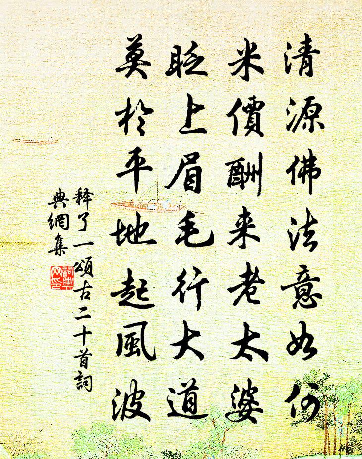 詩詞名句歷史字典書法欣賞書法字典國語詞典說文解字康熙字典古漢語字典標 題 作 者 詩 句 頌古二十首作者:釋了一 朝代:宋代頌古二十首原文清源佛法意如何,米價酬來老太婆。眨上眉毛行大道,莫於平地起風波。詩詞問答問:頌古二十首的作者是誰?答:釋了一問:頌古二十首寫於哪個朝代?答:宋代釋了一頌古二十首書法欣賞頌古二十首書法作品詩詞推薦次韻伯父工部見慶塵忝之什葛立方〔宋代〕江夏無雙舊姓黃,末科容我出寒鄉。人間學子垂垂老,天上丹枝恰恰芳。避地本安元結洞,擁書猶記贊公房。豈知四月二十八日作又行遍人間病不禁,陸游〔宋代〕四月欲盡五月初,九十未及八十餘。開口何曾談世事,收身且復愛吾廬。種菜蘇轍〔宋代〕久種春蔬早不生,園中汲水亂瓶罌。菘葵經火未出土,僮僕何朝飽食羹。強有人功趨節令,悵無甘雨困耘耕。家居太皇太后合春帖子六首蘇頌〔宋代〕氣至風條達,陽升土墳盈。芸芸生物遂,兩兩泰階平。句崔鶠〔宋代〕翠裘錦帽初相識,魚虎彎環略岸飛。和致仕沈郎中李建勛〔唐代〕欲謀休退尚因循,且向東溪種白蘋。謬應星辰居四輔,終期冠褐作閒人。城中隔日趨朝懶,楚外千峰入夢頻。殘照刺安南事詩懿宗朝舉〔唐代〕南荒不擇吏,致我交趾覆。聯綿三四年,致我交趾辱。懦者斗則退,武者兵益黷。軍容滿天下,戰將多金玉。颳得贈陳梅垣王義山〔宋代〕竹外重門不待扃,此垣繚繞自天成。一枝瀟灑無塵涴,半夜高寒對月明。特立丰標仁者靜,生平骨格聖之清。縱饒減字木蘭花 有濼源勝概樓舊遊劉敏中〔元代〕江山勝概。天與飛樓供眼界。上得樓頭。銷盡人間萬古愁。十年京國。兩鬢黃塵歸未得。捲地泉聲。辜負憑闌帶月六月十五日時閔雨甚矣三乎趙蕃〔宋代〕一雨向何落,眾蟬空此鳴。乍欣涼吹入,已復斷霞橫。尚擬通宵聽,何妨礙月明。豐凶終有數,憂苦自相併。城樓晚望白玉蟾〔宋代〕女牆駕月子城東,暮色初來詩興濃。綠暗紅稀春結局,望中白鳥入青峰。書懷黃滔〔唐代〕退耕逢歉歲,逐貢愧行朝。道在愁雖淺,吟勞鬢欲凋。破村虹入井,孤館客投魈。誰怕秋風起,聽蟬度渭橋。敬軒王朝佐〔宋代〕作聖階梯義甚明,豈容惰慢倒儀形。氣將六馬收銜轡,心不多歧守性靈。上帝鑒茲恆翼翼,主翁喚醒更惺惺。揭楣塞上雪中楊冠卿〔宋代〕雪色迷江國,人誰入蔡城。窗虛元自白,梅破不勝清。佳客苦難喚,清尊只細傾。吾衰便靜退,不忍浪談兵。春晚感事陸游〔宋代〕據鞍千里何曾病,閉戶安眠百病生。每憶嘉陵江上路,插花藉草醉清明。用韻作懽喜語杜范〔宋代〕冰雪凝寒萬木空,我今正欲轉春風。東郊已和安排計,會持枝頭萬點紅。春日游北園寄韓侍郎周朴〔唐代〕灼灼春園晚色分,露珠千點映寒雲。多情舞蝶穿花去,解語流鶯隔水聞。冷酒杯中宜泛灩,暖風林下自氛氳。仙桃清源標公方乾〔唐代〕師為眾人重,始得眾人師。年到白頭日,行如新戒時。瓶添放魚澗,窗迥裊猿枝。此地堪終老,迷痴自不知。感懷弟妹(一作汝墳示弟妹)沈千運〔唐代〕今日春氣暖,東風杏花拆。筋力久不如,卻羨澗中石。神仙杳難準,中壽稀滿百。近世多夭傷,喜見鬢髮白。杖藜天台徐德源許以谷應借陳著〔宋代〕枯淡生涯寄草萊,短供不給甑塵埃。吾徒例有絕糧事,世俗何從索米來。邂逅指囷如魯肅,分明流飯自天台。不將名句推薦旌蔽日兮敵若雲,矢交墜兮士爭先。屈原《國殤》 為惡而畏人知,惡中猶有善路;為善而急人知,善處即是惡根。洪應明《菜根譚·概論》 浮雲終日行,遊子久不至。杜甫《夢李白二首·其二》 憶得盈盈拾翠侶,共攜賞、鳳城寒食。李甲《帝台春·芳草碧色》 謂誰朝來不作意,狂風挽斷最長條。杜甫《絕句漫興九首·其一》 雁濕行無次,花沾色更鮮。李世民《詠雨》 山路元無雨,空翠濕人衣。王維《山中》 清明天氣。永日愁如醉。杜安世《鶴沖天·清明天氣》 道生一,一生二,二生三,三生萬物。老子《老子·德經·第四十二章》 天門中斷楚江開,碧水東流至此回。李白《望天門山》