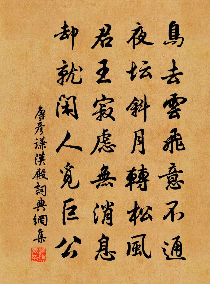 詩詞名句歷史字典書法欣賞書法字典國語詞典說文解字康熙字典古漢語字典標 題 作 者 詩 句 漢殿作者:唐彥謙 朝代:唐代漢殿原文鳥去雲飛意不通,夜壇斜月轉松風。君王寂慮無訊息,卻就閒人覓巨公。詩詞問答問:漢殿的作者是誰?答:唐彥謙問:漢殿寫於哪個朝代?答:唐代問:漢殿是什麼體裁?答:七古唐彥謙漢殿書法欣賞漢殿書法作品注釋全唐詩:卷672-14詩詞推薦虞美人(罷官嘉禾,張忠甫、曾彥思置酒舟中作)趙彥端〔宋代〕蘭畦梅逕香雲繞。長恨相從少。相從雖少卻情親。不道相從頻後、是行人。行人未去猶清瘦。想見相分後。書來梅葛郎中輓辭二首王安石〔宋代〕卷卷繐帷輕,空堂晝哭聲。衣冠遺故物,杯案若平生。白馬有悲送,赤車非古行。低徊九原日,光景在銘旌。題東坡蔗滓窠石艾性夫〔宋代〕空洞如虛拳,擁腫類奇癭。槎牙老樹身,相依以為命。智士能用屈,榴皮勝毛穎。先生倒啗余,此正入佳境。出居十六詠石梯方岳〔宋代〕山險者夷之,梯以石齒齒。於間遂成台,有梅適堪倚。餞駱四二首李嶠〔唐代〕平生何以樂,斗酒夜相逢。曲中驚別緒,醉里失愁容。星月懸秋漢,風霜入曙鍾。明日臨溝水,青山幾萬重。甲第如夢令李之儀〔宋代〕回首蕪城舊苑。還是翠深紅淺。春意已無多,斜日滿簾飛燕。不見。不見。門掩落花庭院。行父和篇頗有過情這語次韻自敘以謝李彌遜〔宋代〕家在閩山最上頭,大書高屋榜休休。按行松竹曾施屐,應接江山不運眸。漫道鶴書朝赴隴,真成蟻穴夢封侯。紫薇和奇父竹齋小池及遊春五絕胡寅〔宋代〕東風不放兩般春,只系胸懷故與新。為問漆園蝴蝶夢,何如沂水舞雩人。庵居即事釋居簡〔宋代〕欲過東家怕渡橋,欲題黃葉怕隨潮。經旬不踏門前路,陡頓蒼 * 色饒。詞笑令(⑦鶯鶯)秦觀〔宋代〕詩曰:崔家有女名鶯鶯。未識春光先有情。河橋兵亂依蕭寺,紅愁綠慘見張生。張生一見春情重。明月拂牆花樹動雲邊偶成劉宰〔宋代〕樂歲饒嘉澤,荒山遍有秋。斷雲猶過雨,平陸自交流。香飯炊紅軟,嘉蔬薦綠柔。蠅營竟何事,老我即菟裘。三國門魯肅周曇〔唐代〕輕財重義見英奇,聖主賢臣是所依。公瑾窘飢求子敬,一言才起數船歸。湘東苑周弼〔宋代〕湘東王好開芳甸,亭台環繞朱欄遍。就中應教誰最多,庾信江淹日歡宴。七十里圍高木柵,花柳燒殘少顏色。取次代崇徽公主意李山甫〔唐代〕金釵墜地鬢堆雲,自別朝陽帝豈聞。遣妾一身安社稷,不知何處用將軍?戲簡王尉方岳〔宋代〕半床明月老秋風,未必詩人一例窮。比似樂天猶欠在,是非已落酒杯中。憶秦娥倪瓚〔元代〕參差玉。笙砷暮起瑤台曲。瑤台曲。輕風香浸,夜涼肌粟。黃雲巧綴飛霞綠。清吟未斷秋霖續。秋霖續。恐辜花意題徑山大覺禪師影堂張祜〔唐代〕超然彼岸人,一徑謝微塵。見相即非相,觀身豈是身。空門性未滅,舊里化猶新。謾指堂中影,誰言影似真。兔宋祁〔宋代〕脫兔馳岡地,飢鷹厲吻天。為煩麋狗顧,遂給獸人鮮。狂目兼槐落,驚毫共月捐。可嗟多狡穴,歸肉助庖羶。雨作,抵暮復晴五首楊萬里〔宋代〕清平如席是淮流,風起雷奔怒不休。一浪飛來驚落膽,早知秪要打船頭。郊居寄友人李頻〔唐代〕林色樹還曛,何時得見君?獨居度永日,相去遠浮雲。故疾隨秋至,離懷覺夜分。蛩聲非自苦,偏是旅人聞。名句推薦月出驚山鳥,時鳴春澗中。王維《鳥鳴澗》 斬草除根,萌芽不發馮夢龍《警世通言·卷三十七》 笛中聞折柳,春色未曾看。李白《塞下曲六首·其一》 如絲苣甲飣春盤,韭葉金黃雪未乾。張耒《春日·如絲苣甲飣春盤》 江帶峨眉雪,川橫三峽流。李白《經亂離後天恩流夜郎憶舊遊書懷贈江夏韋太守良宰》 一聲聲,一更更。万俟詠《長相思·雨》 羅襟濕未乾,又是淒涼雪。張淑芳《滿路花·冬》 節用儲蓄,以備凶災范曄《後漢書·本紀·肅宗孝章帝紀》 晚來風起花如雪,飛入宮牆不見人。劉禹錫《楊柳枝詞九首》 黃河曲里沙為岸,白馬津邊柳向城。高適《夜別韋司士》