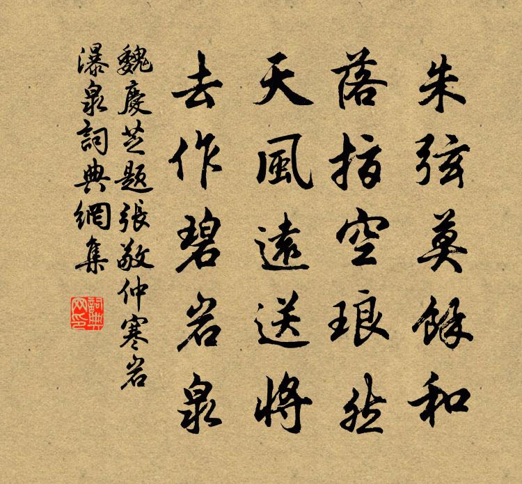 詩詞名句歷史字典書法欣賞書法字典國語詞典說文解字康熙字典古漢語字典標 題 作 者 詩 句 題張敬仲寒岩瀑泉作者:魏慶芝 朝代:宋代題張敬仲寒岩瀑泉原文朱弦莫余和,落指空琅然。天風遠送將,去作碧岩泉。詩詞問答問:題張敬仲寒岩瀑泉的作者是誰?答:魏慶芝問:題張敬仲寒岩瀑泉寫於哪個朝代?答:宋代魏慶芝題張敬仲寒岩瀑泉書法欣賞題張敬仲寒岩瀑泉書法作品詩詞推薦擬西出陽關無故人宋祁〔宋代〕雨中柳色醉中迷,上馬彎弓散馬蹄。陽關門外故人遠,獨有殘陽相伴西。毛希元提乾有廬山癖既卜築居這又作龍樓與玉曹彥約〔宋代〕錦繡栽成九疊山,山山佳處水縈環。無心但有雲來往,看得高人取次閒。還東山洛上作岑參〔唐代〕春流急不淺,歸枻去何遲。愁客葉舟里,夕陽花水時。雲晴開螮蝀,棹發起鸕鶿。莫道東山遠,衡門在夢思。南康愛蓮即事陳宓〔宋代〕東君仙芳菲,首夏即酣寢。巧思蹶然興,老手更諳稔。殷紅間濃綠,濯此萬機錦。桃李謾成蹊,豈解香席枕。最是開東園路北至山腳因治路傍隙地雜植花草陸游〔宋代〕避俗從來恨不深,家園栽種偶成陰。西連幾曲菖蒲澗,東接無窮薝蔔林。烏臼谷寒迎野步,金沙泉冷洗塵襟。清音鷺鷥來鵠〔唐代〕裊絲翹足傍澄瀾,消盡年光佇思間。若使見魚無羨意,向人姿態更應閒。宮詞張公庠〔宋代〕共惜流芳甚擲梭,初移夏琯已清和,百花飛盡酴醾發,留得春光數日多。墨梅 其一王冕〔元代〕老仙醉吸墨數斗,吐出梅花個個真。相見草嫌顏色異,山林別是一般春。荊州即事藥名詩八首黃庭堅〔宋代〕千里及歸鴻,半天河影東。家人森戶外,笑擁白頭翁。書窗強至〔宋代〕一室微吟地,開窗更欲虛。入雲驚紙破,照月愛欞疏。野色連朝夕,秋光滿屋廬。何如謝太守,遠岫獨相於。鹿伯可郎中園池雜詠見一堂樓鑰〔宋代〕靈澈清詩千載傳,始聞林下有斯賢。傍人只道休官早,見一名堂已十年。菩薩蠻(十一之三)賀鑄〔宋代〕曲門南與鳴珂接。小園綠徑飛胡蝶。下馬訪嬋娟。笑迎妝閣前。鷓鴣聲幾疊。艷艷金蕉葉。未許被香韉。月生樓外妾薄命左瀛〔宋代〕妾貌微微改,君恩漸漸疏。本期為匹鳥,深恐作前魚。卻月無心畫,香雲信手梳。佳人多薄命,不必重欷噓。送張兵部知遂州司馬光〔宋代〕劍嶺橫天古棧微,相如重駕傳車歸。雙親倚門望已久,千騎踏雪行如飛。人間富貴非不有,似君榮耀真亦稀。聞道臨都驛送崔十八白居易〔唐代〕勿言臨都五六里,扶病出城相送來。莫道長安一步地,馬頭西去幾時回?與君後會知何處,為我今朝盡一杯。丞相信庵趙公哀詩五首劉克莊〔宋代〕憶昔東淮羽檄馳,非公受鉞國幾危。春潮全藉孤舟渡,廈屋曾將一木支。著白接?麾猛將,坑紅衲襖等嬰兒。揚州偶成杜范〔宋代〕短篷支枕看青山,山意閒如人意閒。飛過白鷗何處宿,宿時莫向急邊灘。春雨早雷張說〔唐代〕東北春風至,飄飄帶雨來。拂黃先變柳,點素早驚梅。樹藹懸書閣,煙含作賦台。河魚未上凍,江蟄已聞雷。美人次韻上梅嶺劉子翬〔宋代〕鞭粳紅入臼,剪菜玉登盤。是處喜相挽,我來如許難。沙清才{左氵右虢}{左氵右虢},陟翠入磻磻。勃窣乾坤我昔題南莊壁晁說之〔宋代〕我昔柴門宜樂只,田園遠近亦康哉。花搖笠頂唱歌去,草塞瓶頭沽酒來。白叟披衣論甲子,青禽哺乳占莓苔。豈期名句推薦最無端處,總把良宵,只恁孤眠卻。柳永《尾犯·夜雨滴空階》 四面邊聲連角起,千嶂里,長煙落日孤城閉。范仲淹《漁家傲·秋思》 明歲秋風知再會,暫時分手莫相思。曹雪芹《殘菊》 煢煢孑立,形影相弔。西晉·李密《陳情表》 忙忙如喪家之狗,急急如漏網之魚。馮夢龍《醒世恆言·卷十七》 寂寂聞猿愁,行行見雲收李白《尋高鳳石門山中元丹丘》 甚愛必大費;多藏必厚亡。故知足不辱,知止不殆,可以長久。老子《老子·德經·第四十四章》 人之命在天,國之命在禮荀子《荀子·強國》 所向泥活活,思君令人瘦。杜甫《九日寄岑參》 草枯鷹眼疾,雪盡馬蹄輕。王維《觀獵》