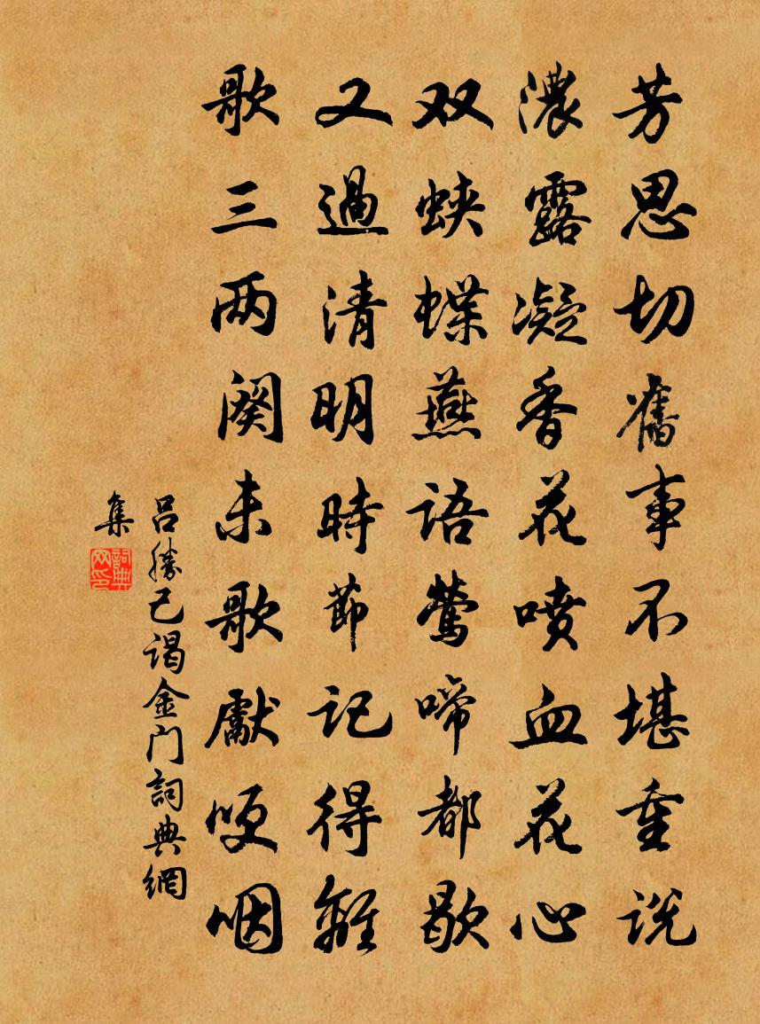 詩詞名句歷史字典書法欣賞書法字典國語詞典說文解字康熙字典古漢語字典標 題 作 者 詩 句 謁金門作者:呂勝己 朝代:宋代謁金門原文芳思切。舊事不堪重說。濃露凝香花噴血。花心雙蛺蝶。燕語鶯啼都歇。又過清明時節。記得離歌三兩闋。未歌先哽咽。詩詞問答問:謁金門的作者是誰?答:呂勝己問:謁金門寫於哪個朝代?答:宋代呂勝己謁金門書法欣賞謁金門書法作品詩詞推薦偈頌一百一十七首釋紹曇〔宋代〕客路賓士歲月深,朝游東魯暮西秦。子規苦勸人歸去,血濺岩花幾見春。春別曲張籍〔唐代〕長江春水綠堪染,蓮葉出水大如錢。江頭橘樹君自種,那不長系木蘭船。雨中花令李之儀〔宋代〕休把身心撋就。著便醉人如酒。富貴功名雖有味,畢竟因誰守。看取刀頭切藕。厚薄都隨他手。趁取日中歸去好,書事司馬光〔宋代〕志士喜功業,感時心易勞。櫱栽終栝柏,荒蔓任蓬蒿。梁竦慵為吏,蕭鹹恥詣曹。風霜果不變,會見出雲高。贈浮梁汪易數錢時〔宋代〕君詩袞袞生蓍後,吾事昭昭未畫前。一笑相逢秋色裹,雙溪風月蜀溪邊。送人游吳李頻〔唐代〕楚田開雪後,草色與君看。積水浮春氣,深山滯雨寒。毗陵孤月出,建業一鍾殘。為把鄉書去,因收別淚難。煎茶王翊龍〔宋代〕春霆發蕾抽新馥,榷吏窮搜不容粟。是誰千金收寸芽,烹鼎車聲繞斜谷。白雲飄落甘露椀,清風吹破玉川屋。平生武夷漫興二首胡炎〔宋代〕丹梯百丈掛雲門,尺五天高青可捫。劈破琅玕成老石,當年曾共見曾孫。圓覺會釋慧開〔宋代〕十二呆郎欲決疑,瞿曇嚼飯餵嬰兒。若教知有衲僧事,終不人前鼓口皮。城南夜歸寄趙大夫陳師道〔宋代〕書生作意一斑足,杜陵據鞍兩眼寒。風雨喚人歸去好,免教街吏報平安。招弟輩飲次韻陳著〔宋代〕淺量能消酒幾杯,爭如俗子厭人來。明朝定到梅山下,不管梅花開未開。臨終作袁陟〔宋代〕青靄千峰暝,悲風萬古呼。其誰掛寶劍,應有奠生芻。皎月東方隕,長松半壑枯。山泉吾所愛,聲到夜台無。仙跡岩題詩二十三首葉天師書樓佚名〔宋代〕巍然垂象隱精思,著述丹書與世違。真得紫文無上道,業成遺蹟是題詩。贈轉運陸中丞孟郊〔唐代〕掌運職既大,摧邪名更雄。鵬飛簸曲雲,鶚怒生直風。投彼霜雪令,翦除荊棘叢。楚倉傾向西,吳米發自東。帆影簡沈元陵求潮州韓文公廟碑並抄山谷碑詩二首趙蕃〔宋代〕涪翁昔在黔戎貶,逸翰遺章久更多。字畫公今元佑腳,擬煩妙手定如何。歸田樂晏幾道〔宋代〕試把花期數。便早有、感春情緒。看即梅花吐。願花更不謝,春且長住。只恐花飛又春去。花開還不語。問此意、清平樂 題扇小景沈禧〔元代〕平湖渺渺。一葉扁舟小。蕩漾不須頻舉棹。觀盡雲山多少。問渠樂意如何。平生慣識煙波。載卻月明歸去,數聲*句張介〔宋代〕應是子規蹄不到,致令我父未歸家。晚秋野外釋文珦〔宋代〕隔岸茅茨低小,臨溪草徑橫斜。楊柳已無餘葉,芙蓉尚有殘花。道院雜興陸游〔宋代〕江上霜風吹角巾,東歸不獨為吳蓴。掃除長劍華纓夢,收拾孤颿短棹身。勾漏丹砂開灶晚,商顏芝草滿山春。東封名句推薦一上高城萬里愁,蒹葭楊柳似汀洲。許渾《鹹陽城東樓 / 鹹陽城西樓晚眺 / 西門》 誰言千里自今夕,離夢杳如關塞長。薛濤《送友人》 江上月明胡雁過,淮南木落楚山多。劉長卿《江州重別薛六柳八二員外》 至言忤於耳而倒於心,非賢聖莫能聽韓非及後人《韓非子·難言》 秋霜切玉劍,落日明珠袍李白《白馬篇》 大丈夫當橫屍戰場,奈何狼藉都市。李大師、李延壽《南史·列傳·卷十九》 滿衣血淚與塵埃,亂後還鄉亦可哀。高啟《送陳秀才還沙上省墓》 下床著新衣,初學小姑拜。毛鉉《 * 詞·下床著新衣》 橫戈從百戰,直為銜恩甚。李白《塞下曲六首》 過五關,斬六將馮夢龍《喻世明言·卷三十一》