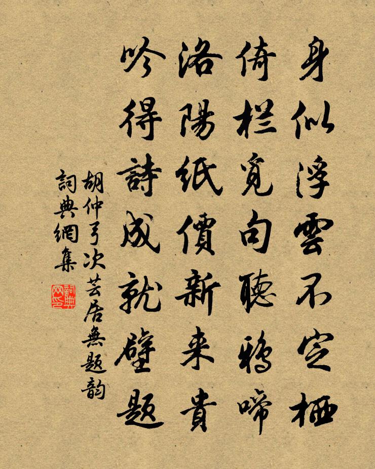 詩詞名句歷史字典書法欣賞書法字典國語詞典說文解字康熙字典古漢語字典標 題 作 者 詩 句 次芸居無題韻作者:胡仲弓 朝代:宋代次芸居無題韻原文身似浮雲不定棲,倚欄覓句聽鴉啼。洛陽紙價新來貴,吟得詩成就壁題。詩詞問答問:次芸居無題韻的作者是誰?答:胡仲弓問:次芸居無題韻寫於哪個朝代?答:宋代胡仲弓次芸居無題韻書法欣賞次芸居無題韻書法作品詩詞推薦已落牡丹宋祁〔宋代〕世間最有不勝妍,愁對韶華欲暮天。已被風開又風落,要為人羨即人憐。建溪精捨得本字戴表元〔宋代〕四山翛翛風日暖,白髮看花惜春晚。當時衰草牧羊坡,今日池台紅霧滿。最鄰幽篁手所植,兒戲成業亦千本。舊遊春草碧 亂後乍見故人,情文浹甚。老來共談邵亨貞〔元代〕以索寒梅之笑亂離避世無方略。何處可尋幽,須期約。桃源只在人間,爭得身輕跨寥鶴。空憶舊歡游,成今昨。自再用韻酬陳秘校來擊楫清中原之志故中間多敖陶孫〔宋代〕海中老蜃噓樓閣,侷促鶢鶋魯東泊。忍能杯視九雲夢,戢戢魚頭沸相灂。濤江亭東識君面,再見白也天鵬作。雄辭送王南強赴紹興簽幕四首陳傅良〔宋代〕詞章行天下,嘉賴二百年。甲科至公卿,誰敢謂不然。有人妄媒孽,一世所棄捐。我亦欲護短,諱不言幽燕。汗簡寄題真愛堂三首裘萬頃〔宋代〕真實愛山今有誰,此心猨鶴亦難欺。看來卻是朱居士,不愧昌黎五字詩。死別離方維儀〔清代〕昔聞生別離,不聞死別離。無論生與死,我獨身當之。 北風吹枯桑,日夜為我悲。上視滄浪天,下無黃口兒。人頔上人索春間詩軸以臂疼未能錄去姑以偈語展鄭清之〔宋代〕轉盼湖山忽半年,春鶯啼處起秋蟬。詩囊未倒真成債,道眼相看總是禪。壯士不甘弓掛壁,病翁猶有筆如椽。少須縱步至董氏園亭三首陳與義〔宋代〕池光修竹里,筇杖季春頭。客子愁無奈,桃花笑不休。百年今日勝,萬里此生浮。莽莽樽前事,題詩記獨游。油紙燈二首賈似道〔宋代〕頭混腿腳一身黃,翅滑牙紅促織王。易名叫做油莉撻,賭花管取滿頭裝。淨光山四詠呈水心先生會景軒徐照〔宋代〕不見日東上,西原雨一晴。逐時看景異,風物入詩清。立久飛雲滅,身高去鳥平。石峰何處是,歸思忽然生。鳳凰閣佚名〔宋代〕遍園林綠暗,渾如翠幄。下無一片是花萼。可恨狂風橫雨,忒煞情薄。盡底把、韶華送卻。楊花無奈,是處穿簾透幽庭齊己〔唐代〕不放生纖草,從教遍綠苔。還防長者至,未著牡丹栽。蛺蝶空飛過,鶺鴒時下來。南鄰折芳子,到此寂寥回。薔薇洞釋文珦〔宋代〕不知建業薔薇樹,何似淮淝草木立。因入謫仙詩句里,等閒隨處得虛名。過西海隘即事李曾伯〔宋代〕江帶湖襟護一堤,人煙落落柳依依。白鷗世界秋容澹,紅蓼汀州水際肥。斷岸馬危遲弗驟,中流舟順疾於飛。歸來送友人赴舉朱慶餘〔唐代〕世路□□久,嗟君進取身。十年雖苦志,萬里托何人。處困非乖道,求名本為親。惟應□□意,先與化龍鱗。送鄭宣撫三首郭印〔宋代〕棹發嘉陵即帝庭,山川草木若為情。忠嘉但有三千牘,威愛猶傳十萬兵。天象共符虛右席,坤維一帶失長城。西南賢者之孝二百四十首二王林同〔宋代〕要以孝行取,寧將學業論。錫無慚玉友,銓可謂金昆。送林袞侍御東陽秩滿赴上都劉商〔唐代〕幾年烏府內,何處逐鳧歸。關吏迷驄馬,銅章累繡衣。野亭山草綠,客路柳花飛。況復長安遠,音書從此稀。看僧披剃李昴英〔宋代〕爾教言無相,誰教蛻發毛。虛名猶度牒,多事更方袍。父認師傳的,年推戒臘高。冠巾何不可,只要斷塵勞。名句推薦淺情終似,行雲無定,猶到夢魂中。晏幾道《少年游·離多最是》 丈夫貧賤應未足,今日相逢無酒錢。高適《別董大二首》 怒濤卷霜雪,天塹無涯。柳永《望海潮·東南形勝》 酒亂性,色迷人。施耐庵《水滸傳·第四十五回》 萬物同宇而異體,無宜而有用為人,數也。荀子《荀子·富國》 為學無間斷,如流水行雲,日進而不已也。王永彬《圍爐夜話·第十四則》 白日淪西河,素月出東嶺。陶淵明《雜詩十二首·其二》 惟天地萬物父母,惟人萬物之靈。佚名《尚書·周書·泰誓》 女蘿發馨香,菟絲斷人腸。李白《古意》 深宮桃李無人問,舊愛玉顏今自恨。元好問《玉樓春·驚沙獵獵風成陣》